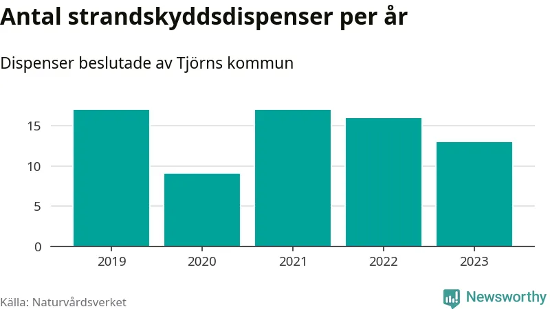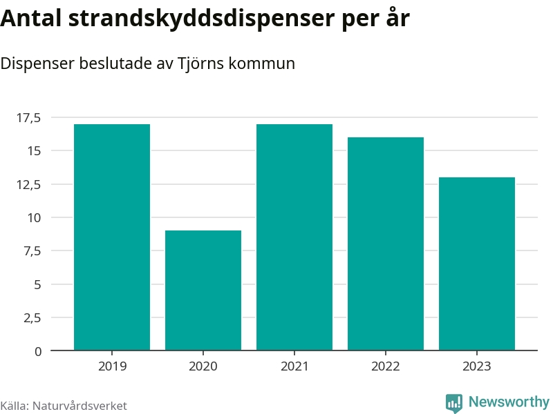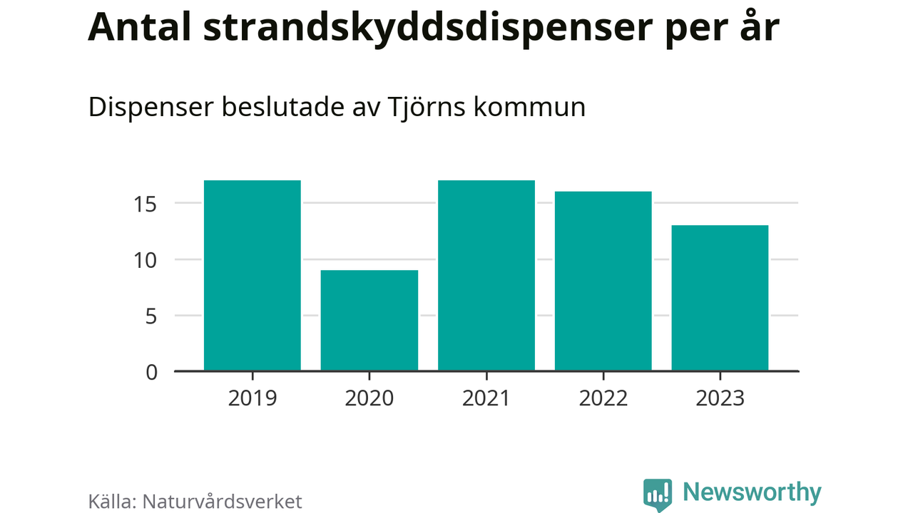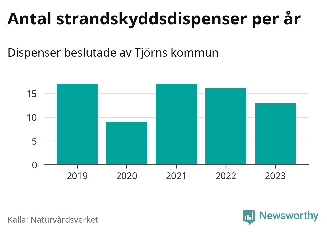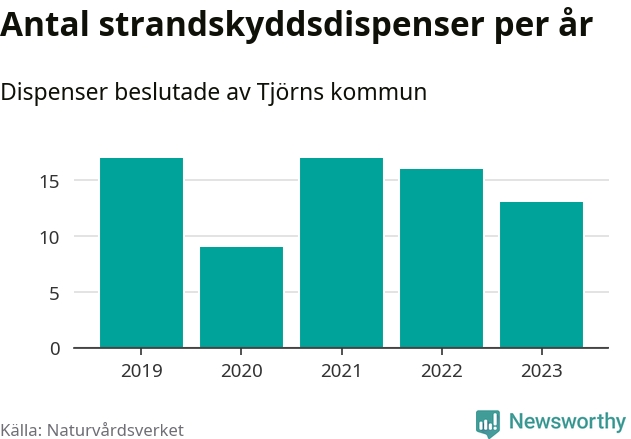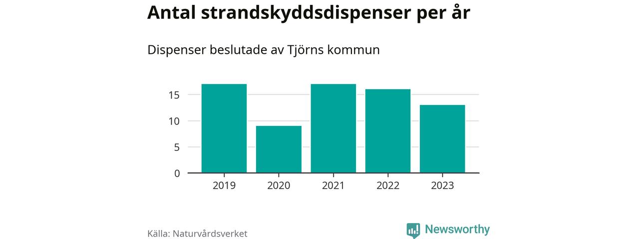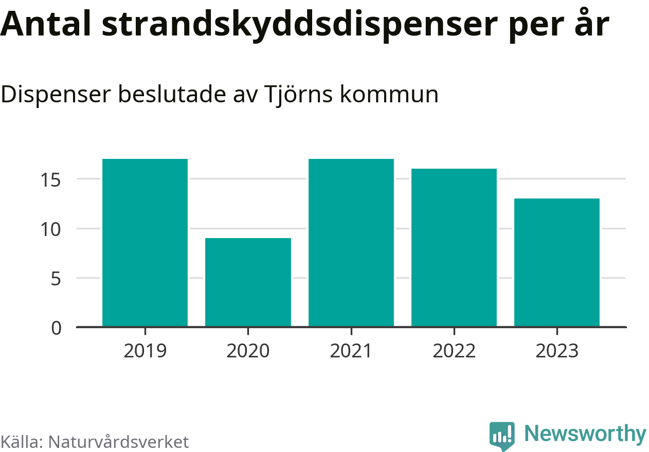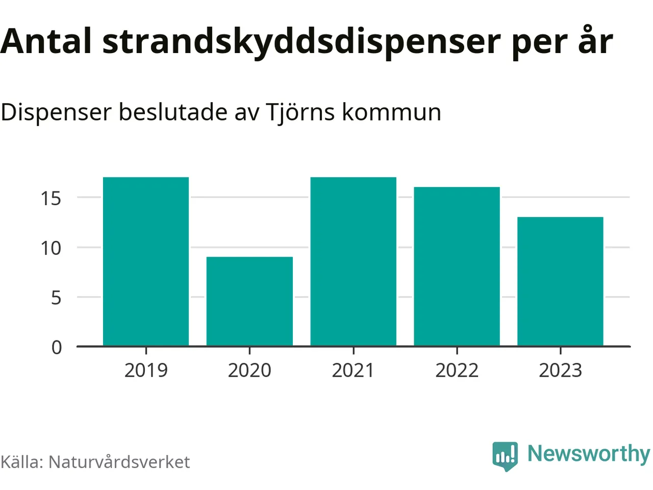 Den som vill bygga nära vatten behöver dispens från strandskyddet, lagstiftningen som ska säkra allmänhetens tillgång till stränderna och bevara livsvillkor för djur och växter. I de flesta fall är det kommunerna som godkänner dispenserna, och under de senaste fem åren har Tjörns kommun fattat 72 beslut för totalt 125 åtgärder inom strandskyddat område, enligt den sammanställning Naturvårdsverket varje år gör. Det är inte en siffra som sticker ut särskilt jämfört med andra kommuner. Flest dispenser i Västra Götalands län har godkänts i Borås – 220 stycken.