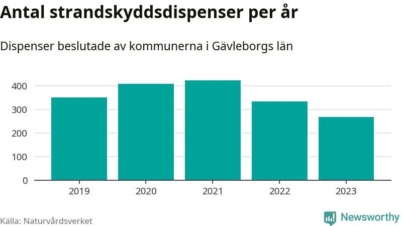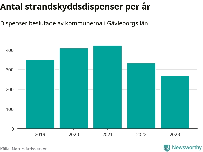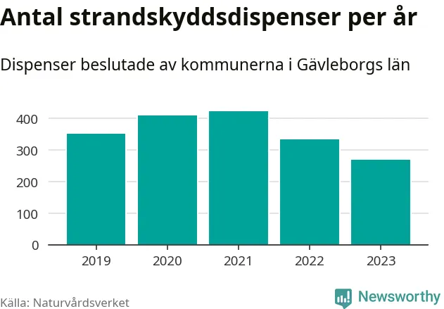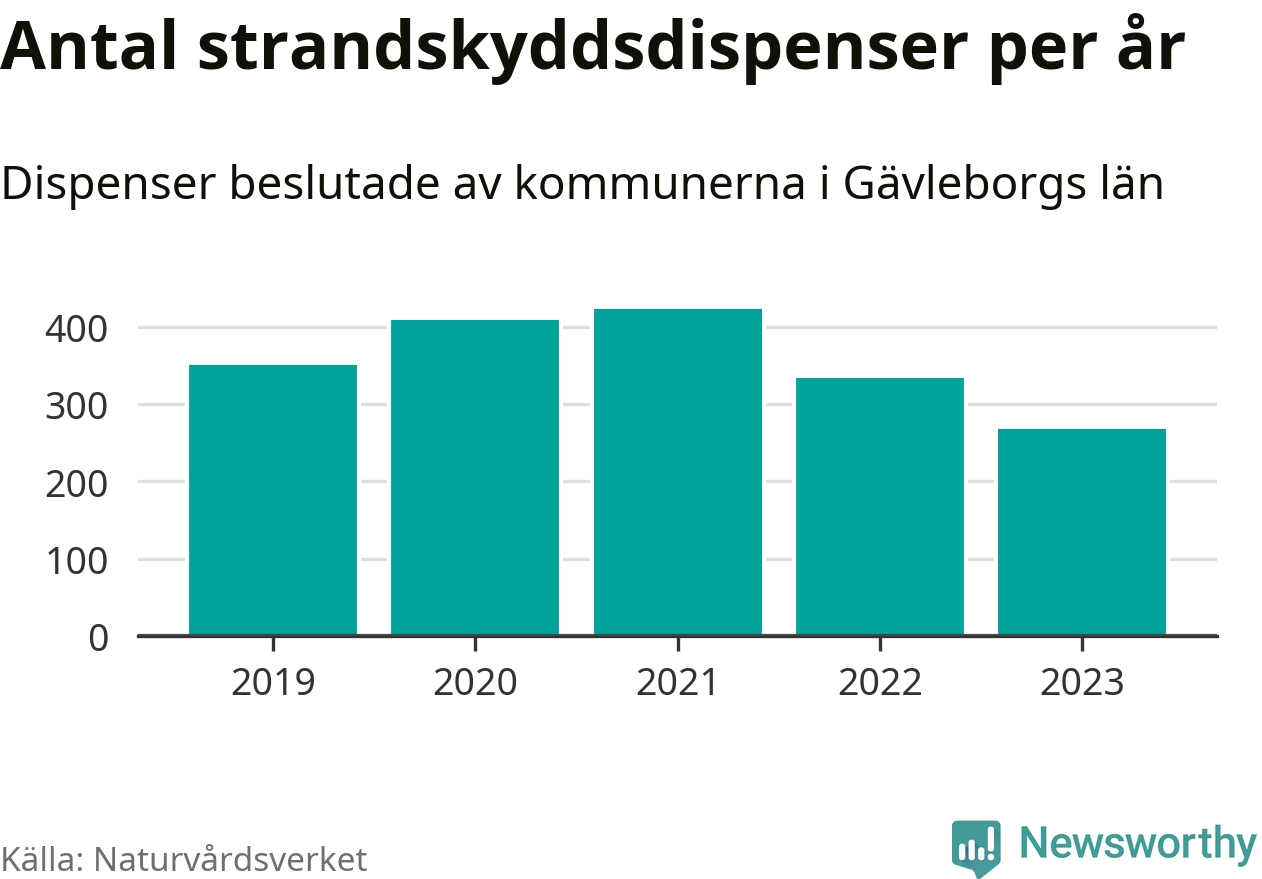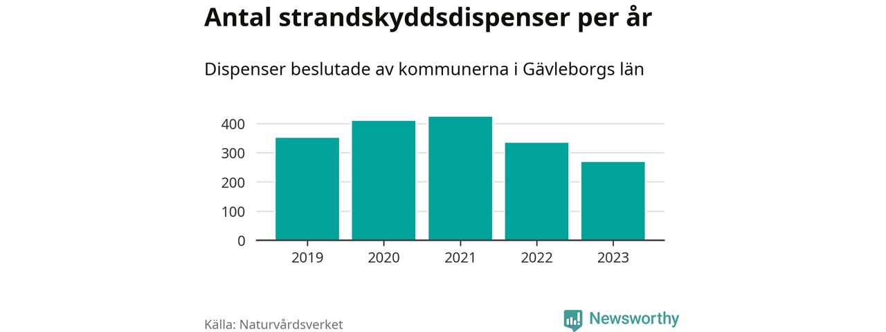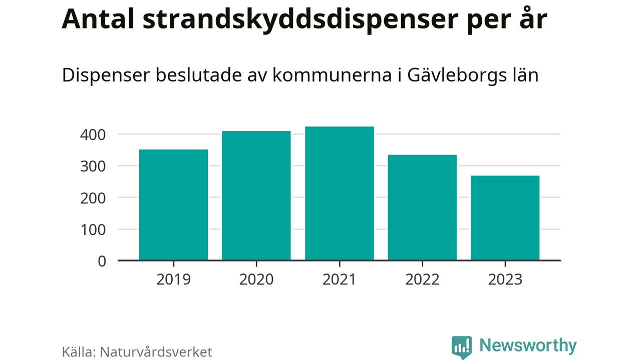 Den som vill bygga nära vatten behöver dispens från strandskyddet, lagstiftningen som ska säkra allmänhetens tillgång till stränderna och bevara livsvillkor för djur och växter. I de flesta fall är det kommunerna som godkänner dispenserna, och under de senaste fem åren har kommunerna i Gävleborgs län fattat 1 784 beslut för totalt 2 482 åtgärder inom strandskyddat område, enligt den sammanställning Naturvårdsverket varje år gör.
