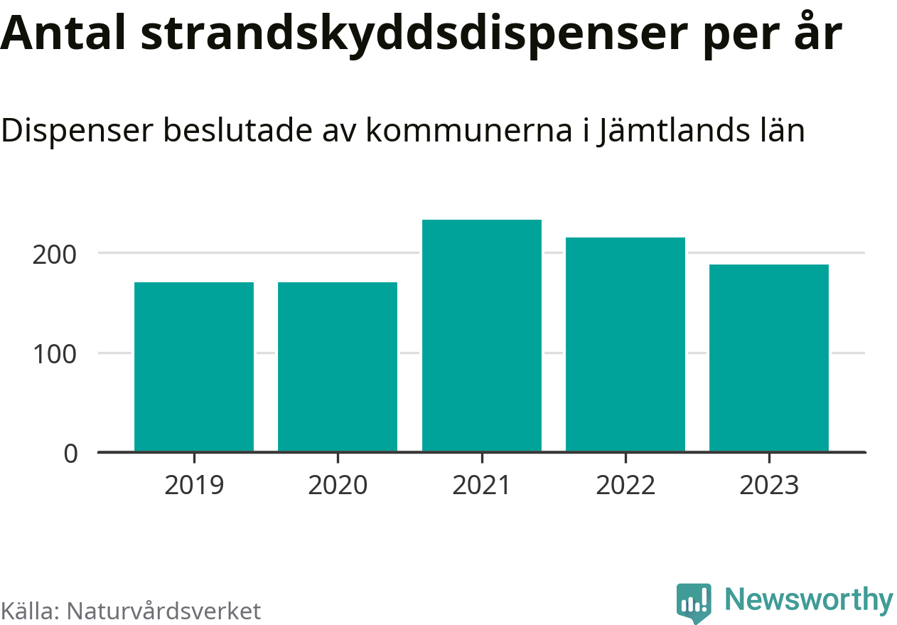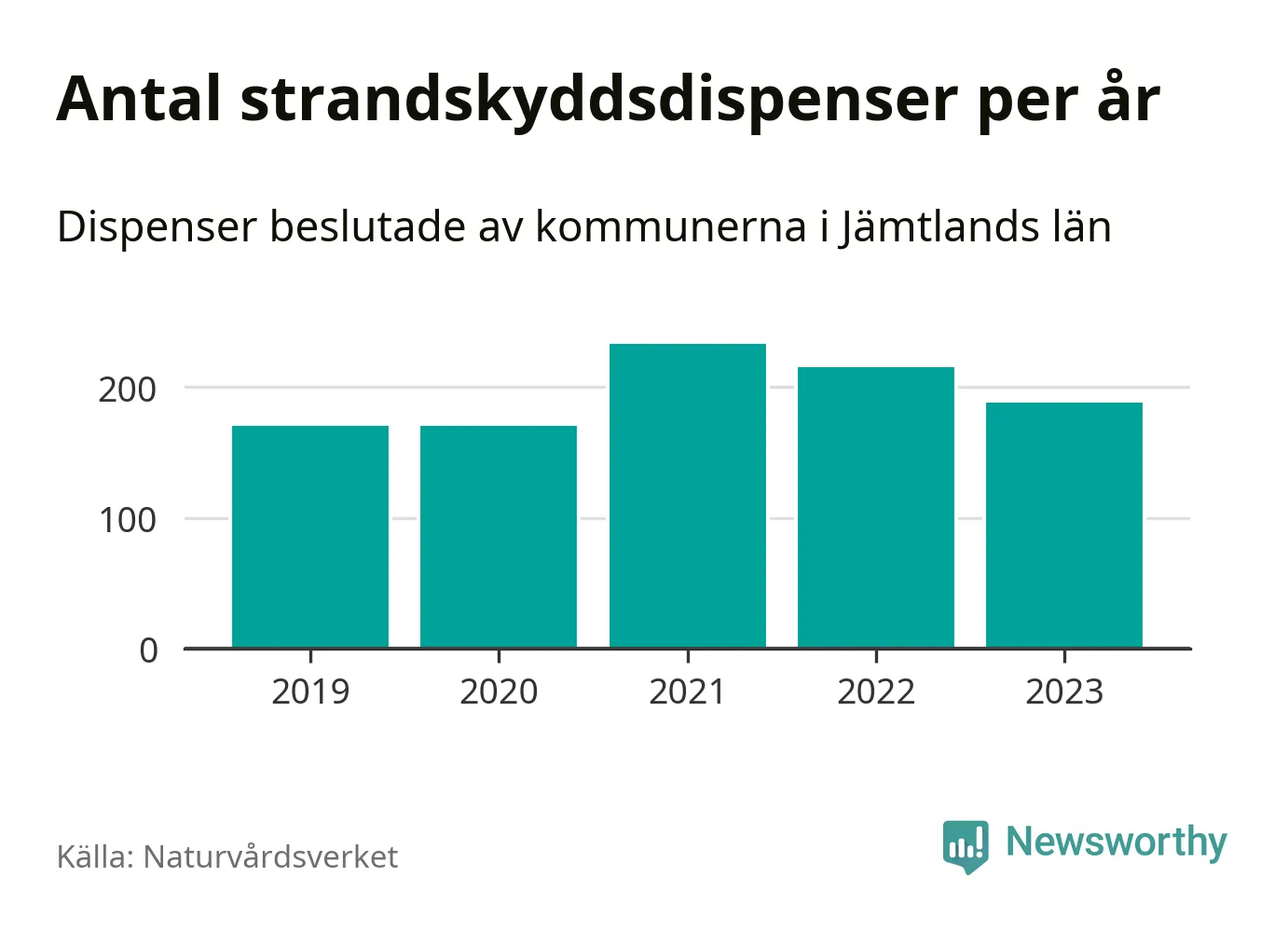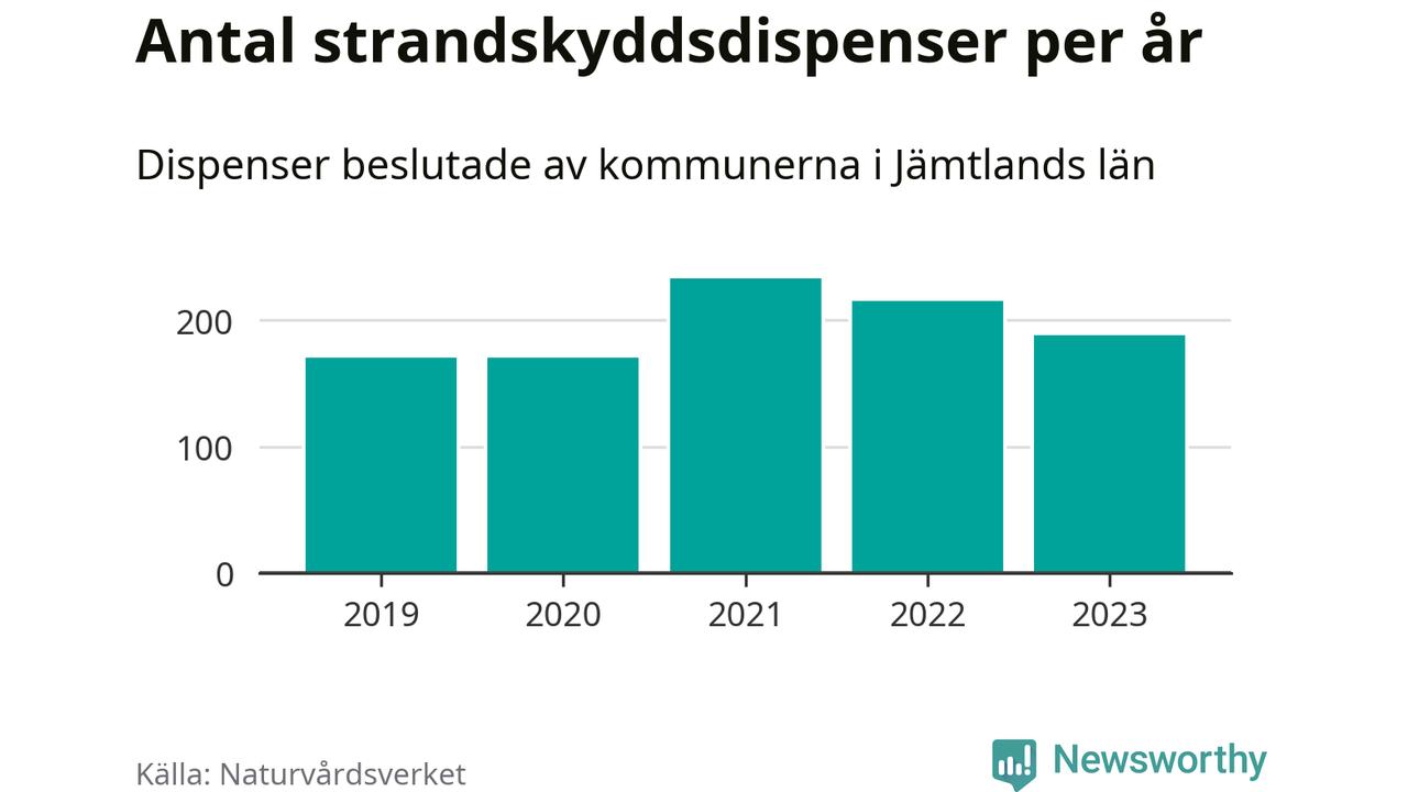 Den som vill bygga nära vatten behöver dispens från strandskyddet, lagstiftningen som ska säkra allmänhetens tillgång till stränderna och bevara livsvillkor för djur och växter. I de flesta fall är det kommunerna som godkänner dispenserna, och under de senaste fem åren har kommunerna i Jämtlands län fattat 976 beslut för totalt 1 409 åtgärder inom strandskyddat område, enligt den sammanställning Naturvårdsverket varje år gör.