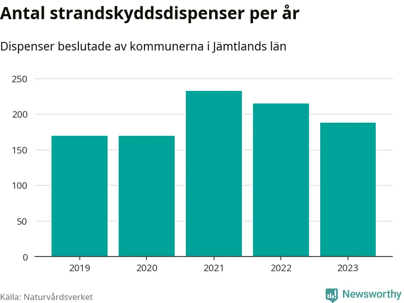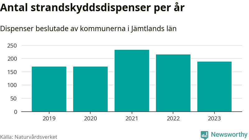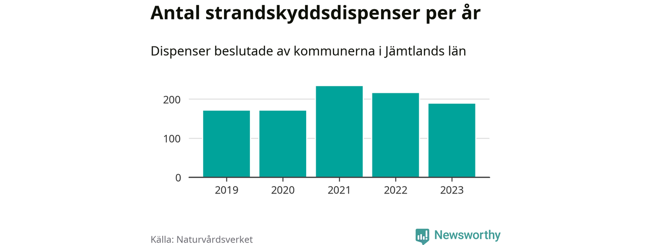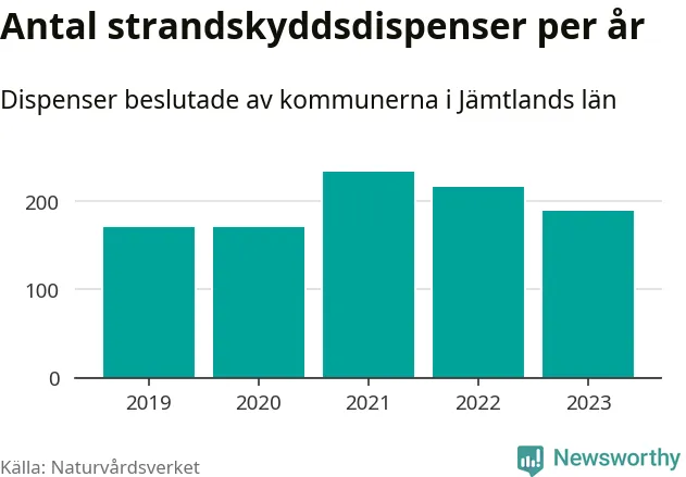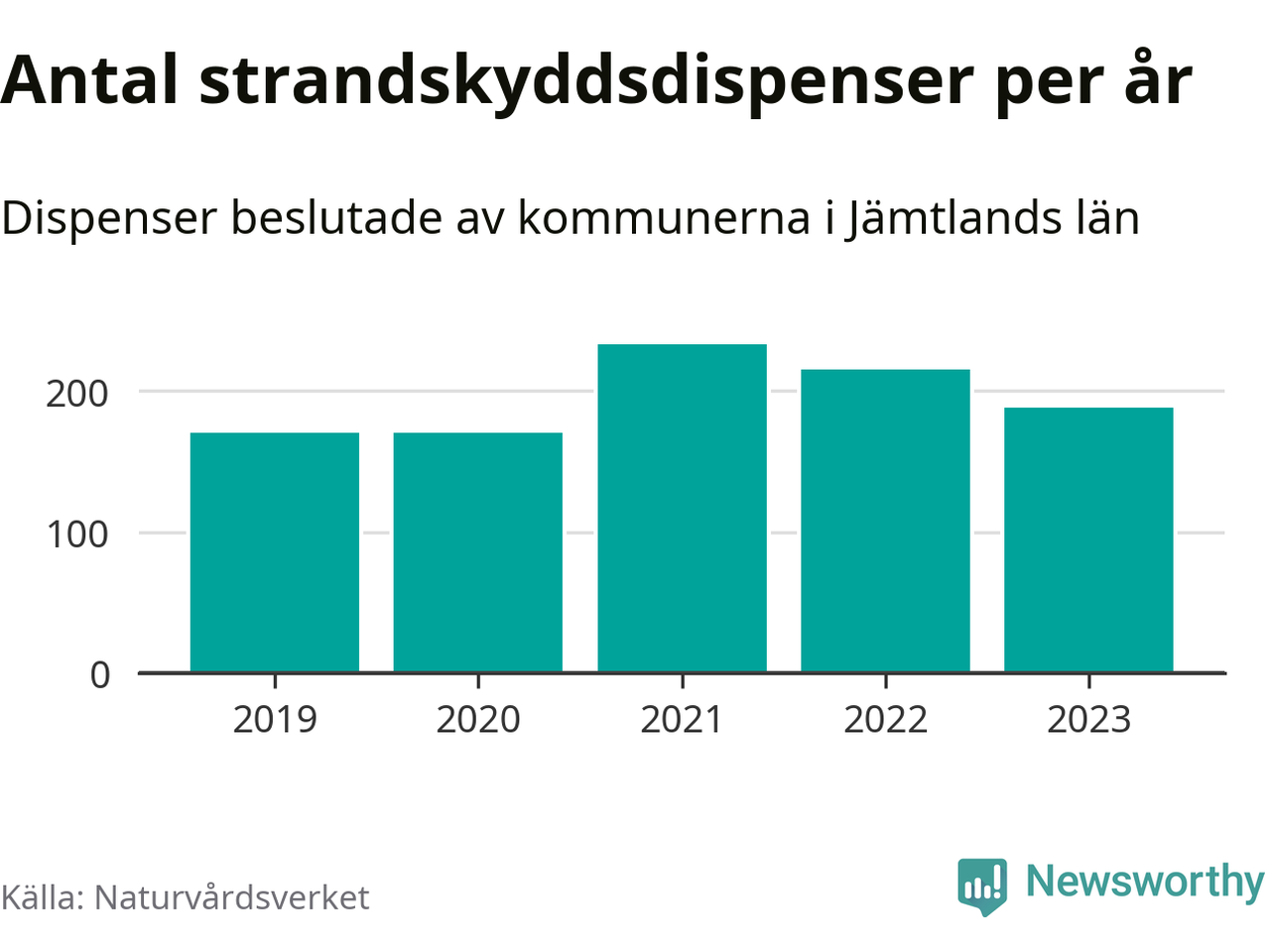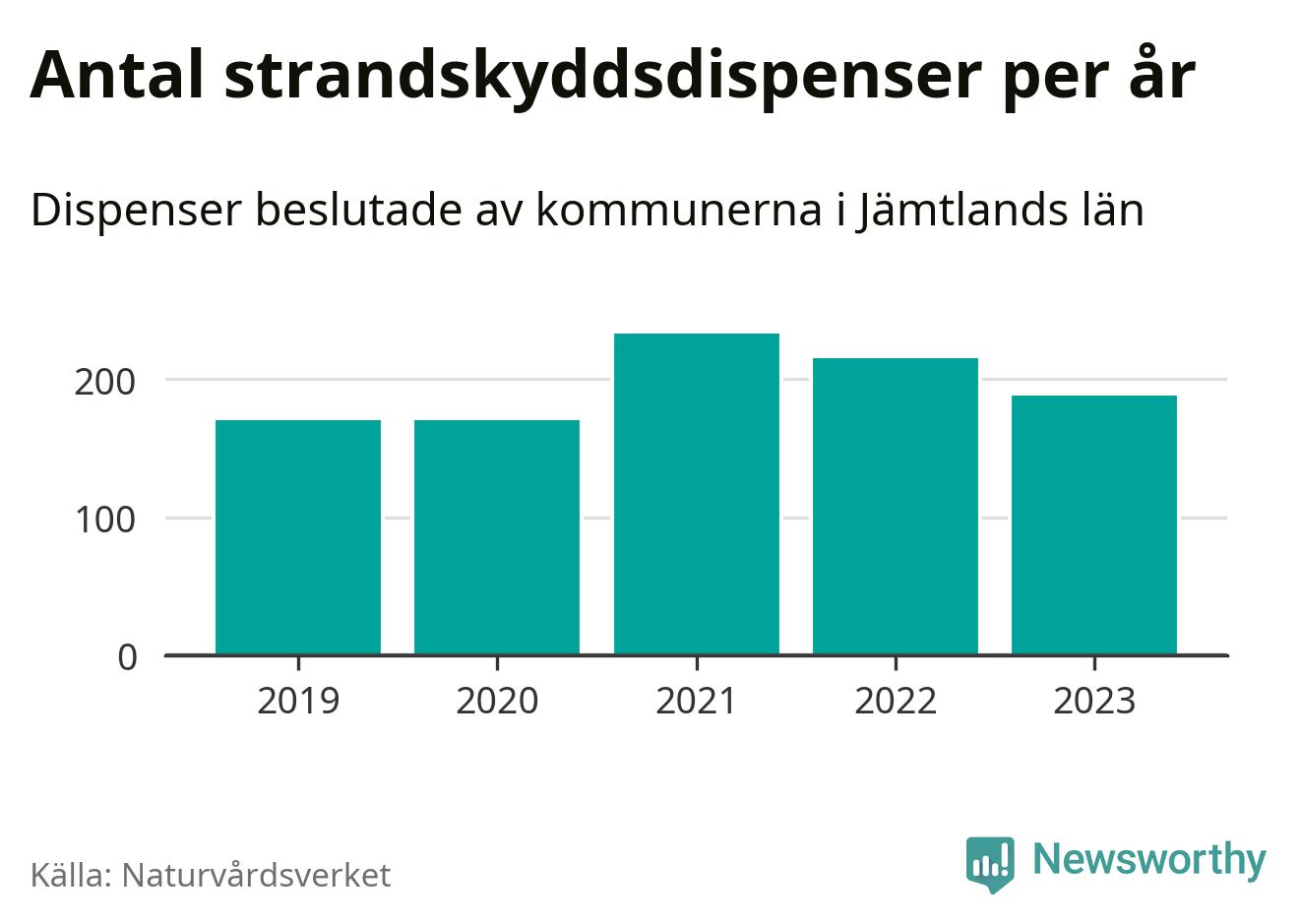 Den som vill bygga nära vatten behöver dispens från strandskyddet, lagstiftningen som ska säkra allmänhetens tillgång till stränderna och bevara livsvillkor för djur och växter. I de flesta fall är det kommunerna som godkänner dispenserna, och under de senaste fem åren har kommunerna i Jämtlands län fattat 976 beslut för totalt 1 409 åtgärder inom strandskyddat område, enligt den sammanställning Naturvårdsverket varje år gör.