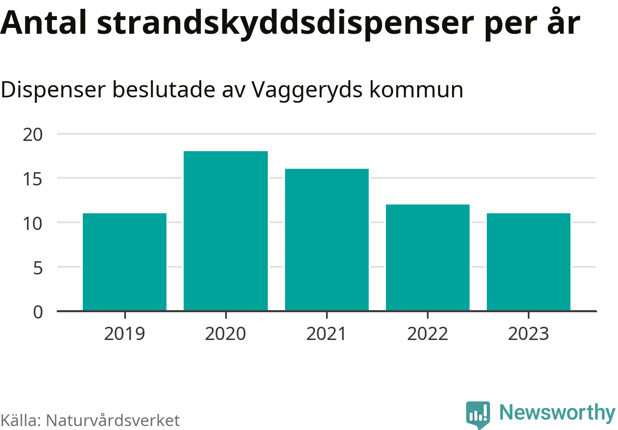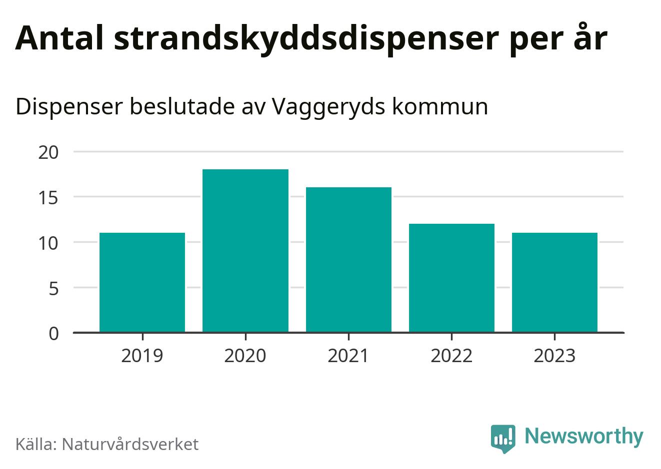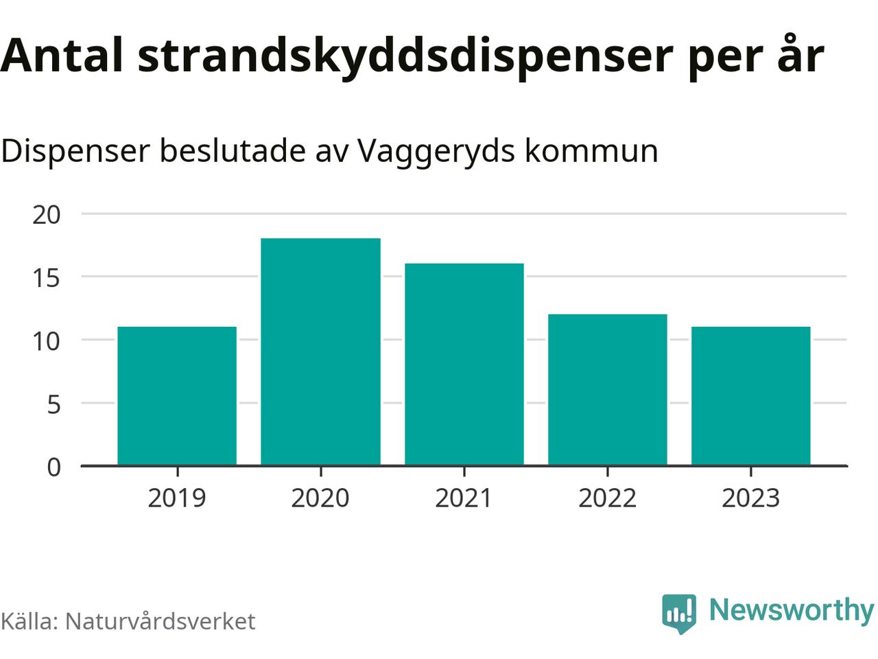 Den som vill bygga nära vatten behöver dispens från strandskyddet, lagstiftningen som ska säkra allmänhetens tillgång till stränderna och bevara livsvillkor för djur och växter. I de flesta fall är det kommunerna som godkänner dispenserna, och under de senaste fem åren har Vaggeryds kommun fattat 68 beslut för totalt 70 åtgärder inom strandskyddat område, enligt den sammanställning Naturvårdsverket varje år gör. Det är inte en siffra som sticker ut särskilt jämfört med andra kommuner. Flest dispenser i Jönköpings län har godkänts i Jönköping – 157 stycken.