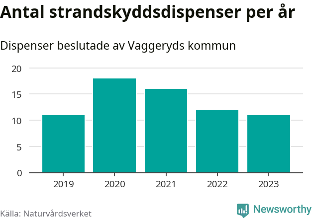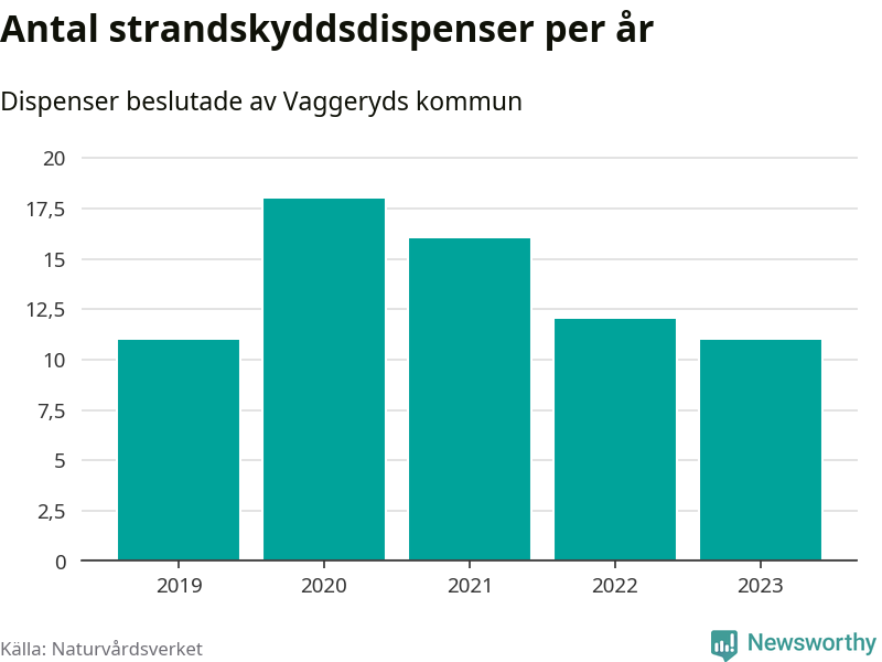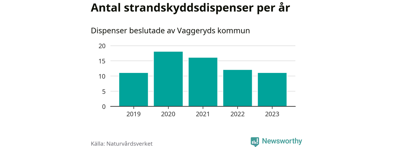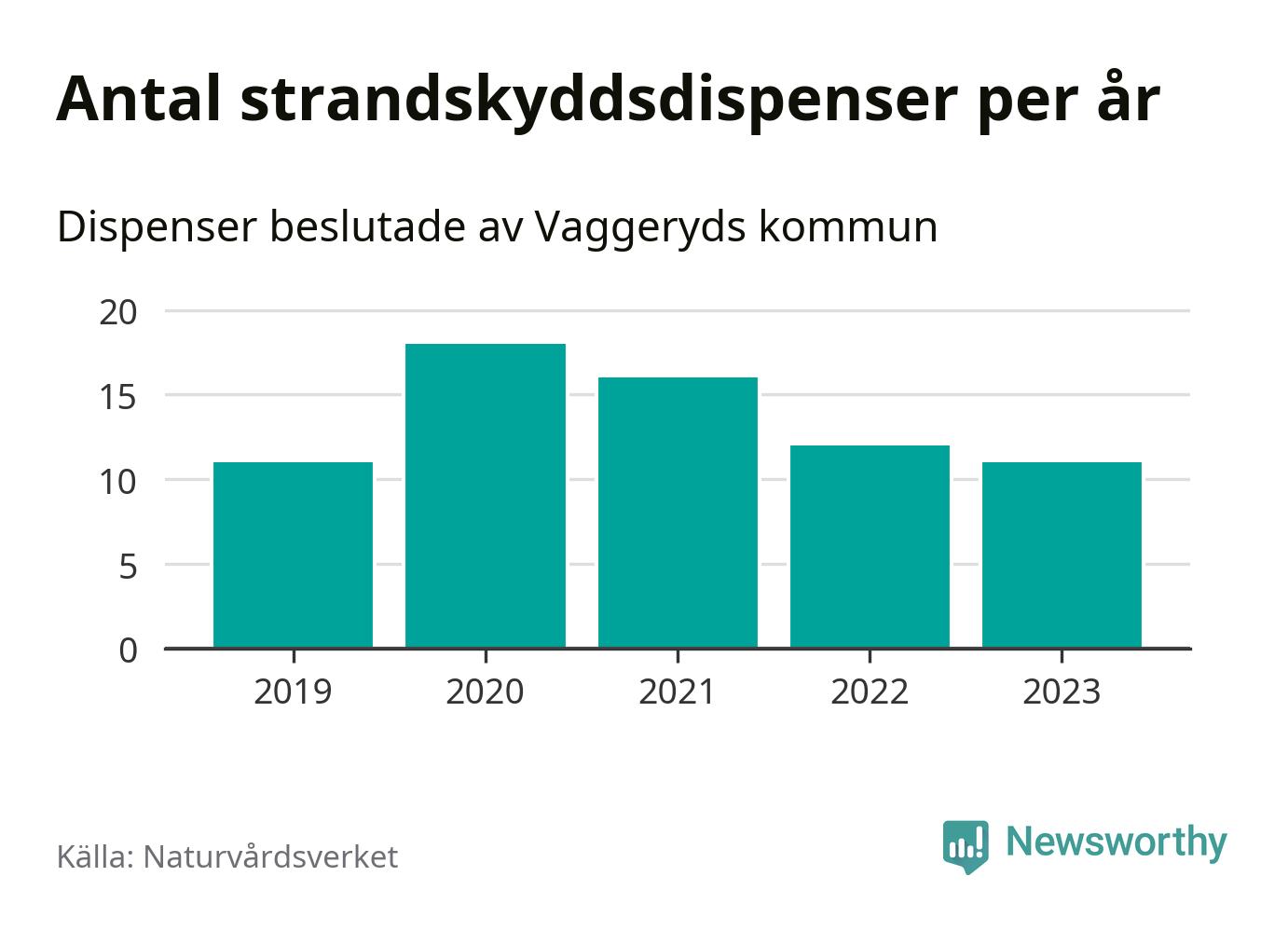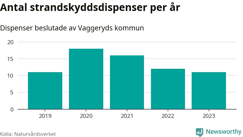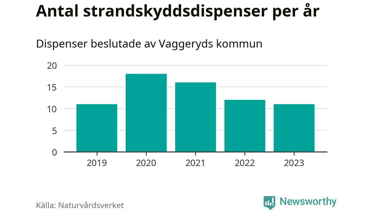 Den som vill bygga nära vatten behöver dispens från strandskyddet, lagstiftningen som ska säkra allmänhetens tillgång till stränderna och bevara livsvillkor för djur och växter. I de flesta fall är det kommunerna som godkänner dispenserna, och under de senaste fem åren har Vaggeryds kommun fattat 68 beslut för totalt 70 åtgärder inom strandskyddat område, enligt den sammanställning Naturvårdsverket varje år gör. Det är inte en siffra som sticker ut särskilt jämfört med andra kommuner. Flest dispenser i Jönköpings län har godkänts i Jönköping – 157 stycken.