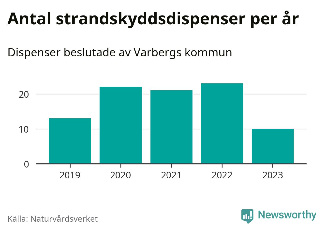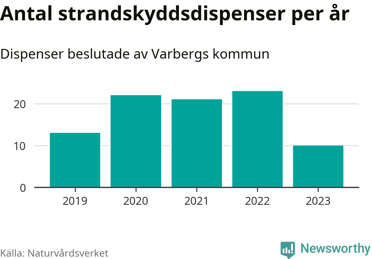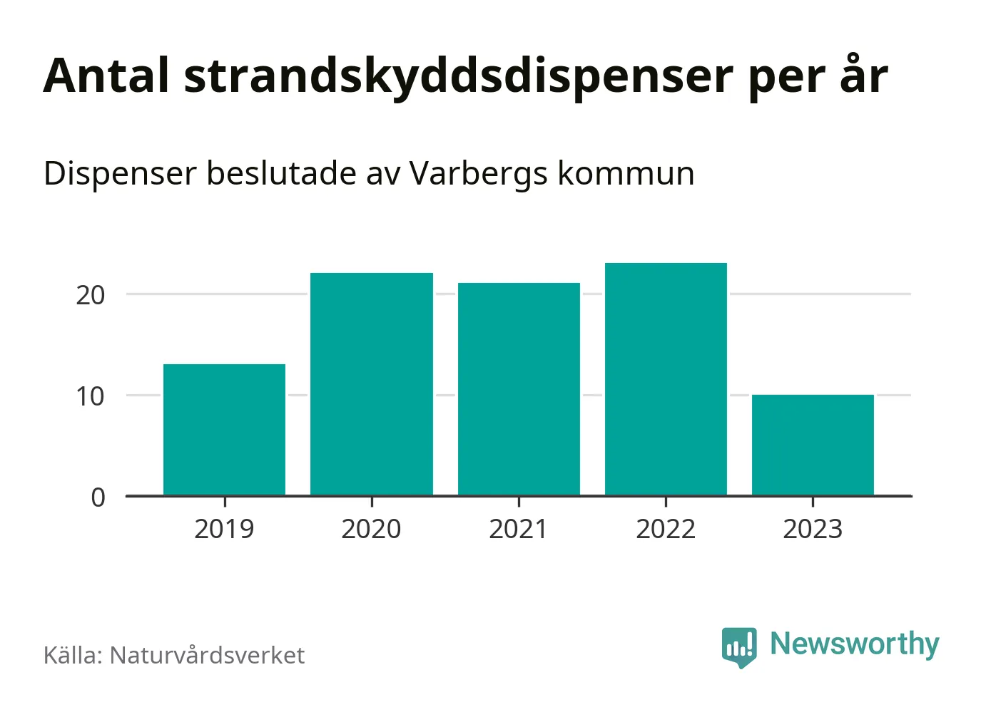 Den som vill bygga nära vatten behöver dispens från strandskyddet, lagstiftningen som ska säkra allmänhetens tillgång till stränderna och bevara livsvillkor för djur och växter. I de flesta fall är det kommunerna som godkänner dispenserna, och under de senaste fem åren har Varbergs kommun fattat 89 beslut för totalt 96 åtgärder inom strandskyddat område, enligt den sammanställning Naturvårdsverket varje år gör. Det är inte en siffra som sticker ut särskilt jämfört med andra kommuner. Flest dispenser i länet har godkänts i Kungsbacka – 211 stycken.