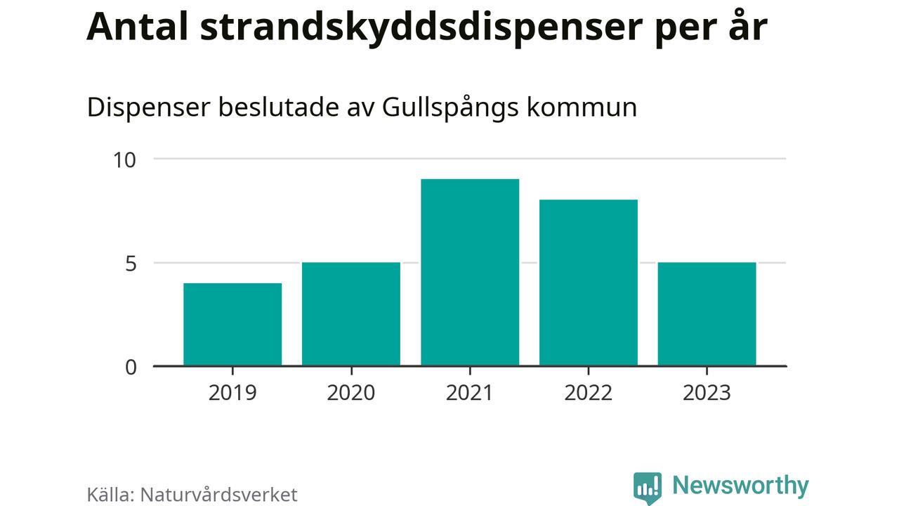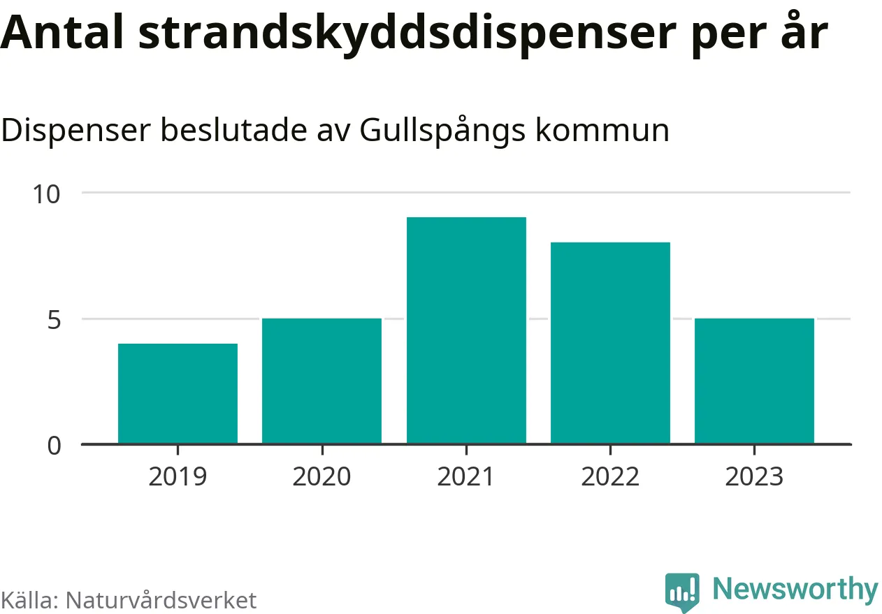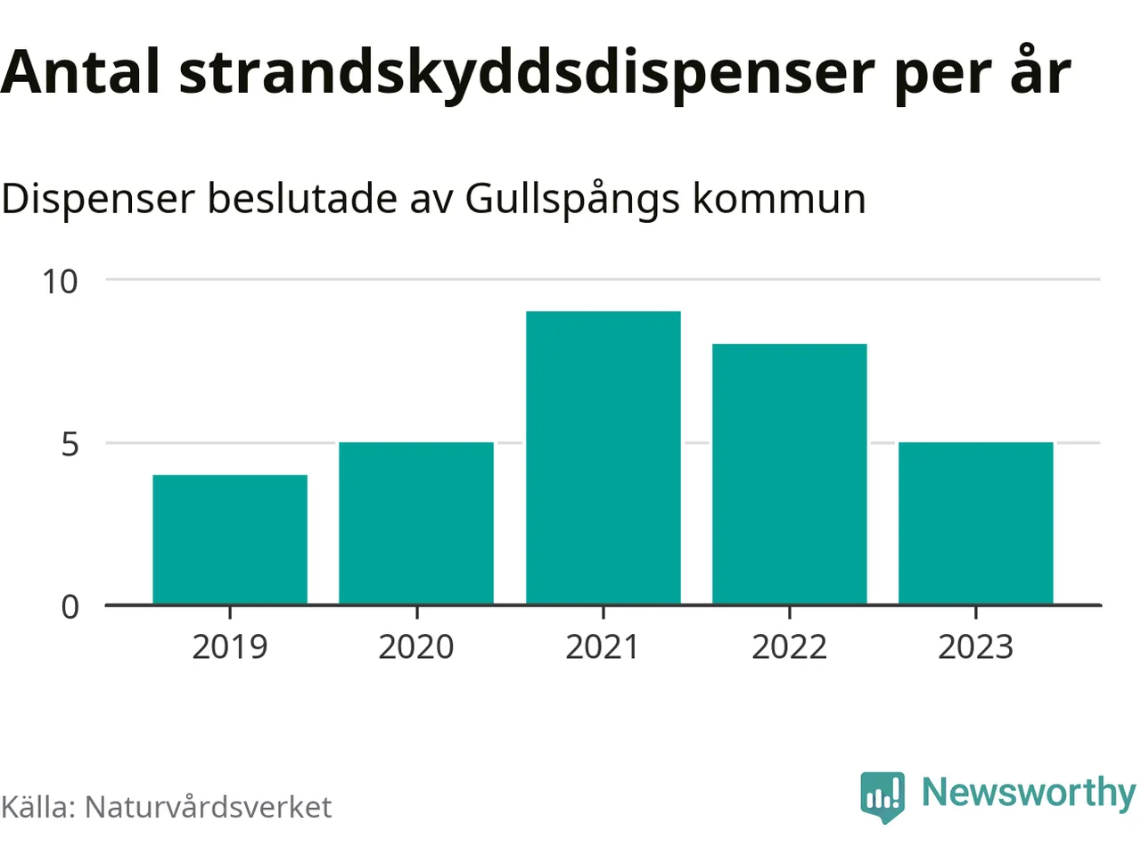 Den som vill bygga nära vatten behöver dispens från strandskyddet, lagstiftningen som ska säkra allmänhetens tillgång till stränderna och bevara livsvillkor för djur och växter. I de flesta fall är det kommunerna som godkänner dispenserna, och under de senaste fem åren har Gullspångs kommun fattat 31 beslut för totalt 53 åtgärder inom strandskyddat område, enligt den sammanställning Naturvårdsverket varje år gör. Det är färre än i de flesta kommuner i landet. Flest dispenser i Västra Götalands län har godkänts i Borås – 220 stycken.