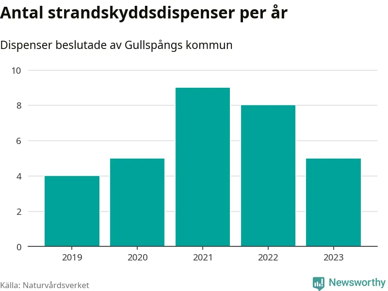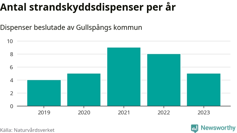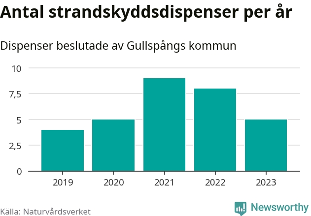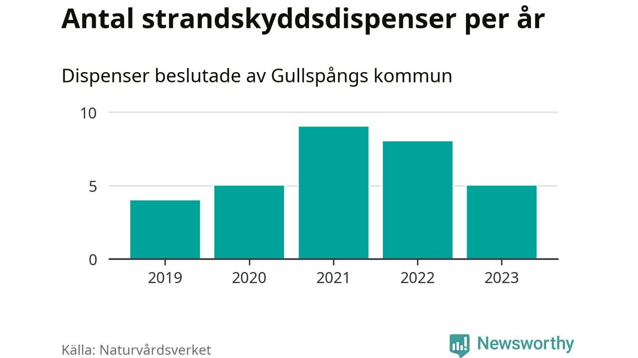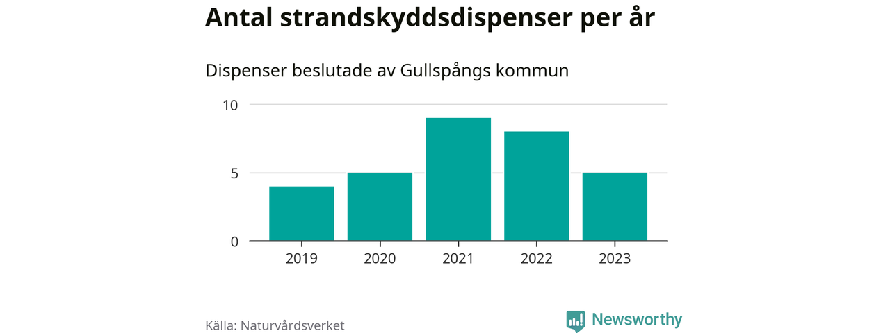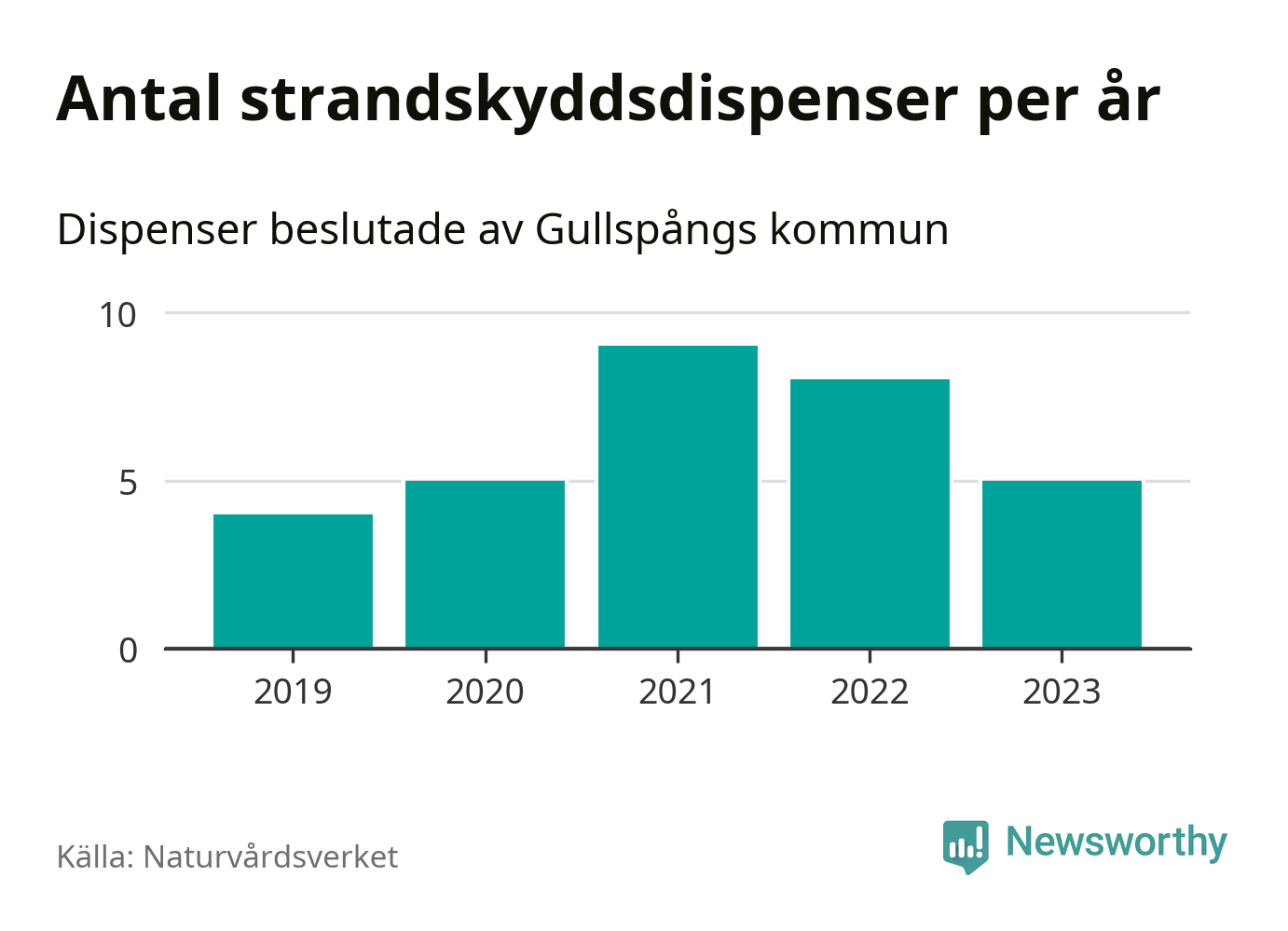 Den som vill bygga nära vatten behöver dispens från strandskyddet, lagstiftningen som ska säkra allmänhetens tillgång till stränderna och bevara livsvillkor för djur och växter. I de flesta fall är det kommunerna som godkänner dispenserna, och under de senaste fem åren har Gullspångs kommun fattat 31 beslut för totalt 53 åtgärder inom strandskyddat område, enligt den sammanställning Naturvårdsverket varje år gör. Det är färre än i de flesta kommuner i landet. Flest dispenser i Västra Götalands län har godkänts i Borås – 220 stycken.