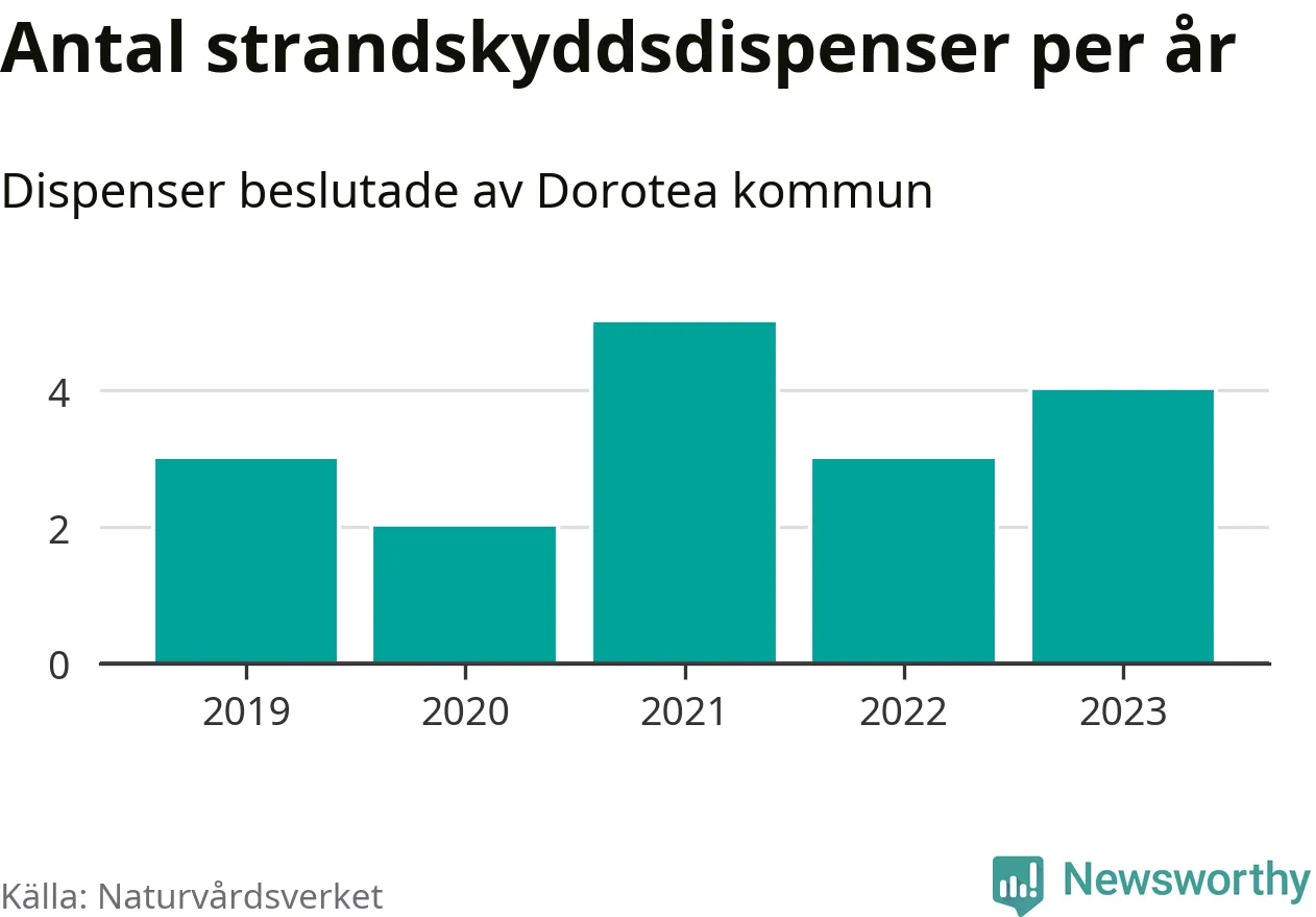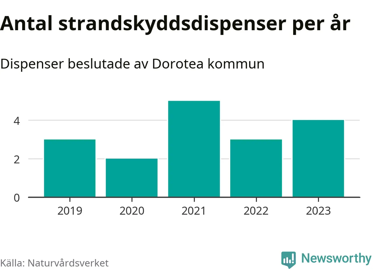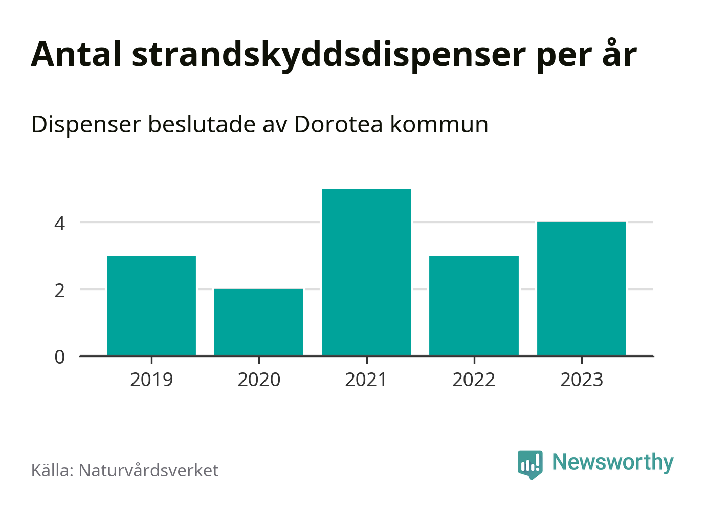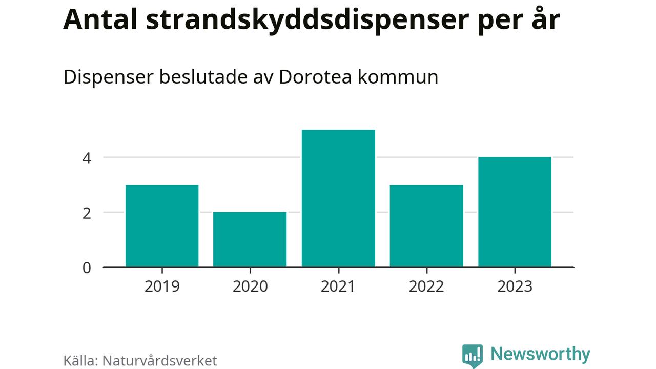 Den som vill bygga nära vatten behöver dispens från strandskyddet, lagstiftningen som ska säkra allmänhetens tillgång till stränderna och bevara livsvillkor för djur och växter. I de flesta fall är det kommunerna som godkänner dispenserna, och under de senaste fem åren har Dorotea kommun fattat 17 beslut för totalt 34 åtgärder inom strandskyddat område, enligt den sammanställning Naturvårdsverket varje år gör. Det är färre än i de flesta kommuner i landet. Flest dispenser i Västerbottens län har godkänts i Skellefteå – 417 stycken.