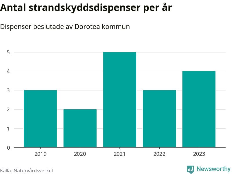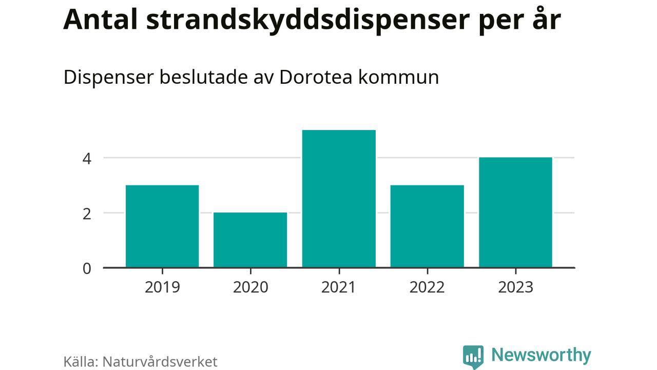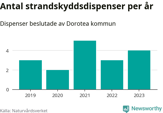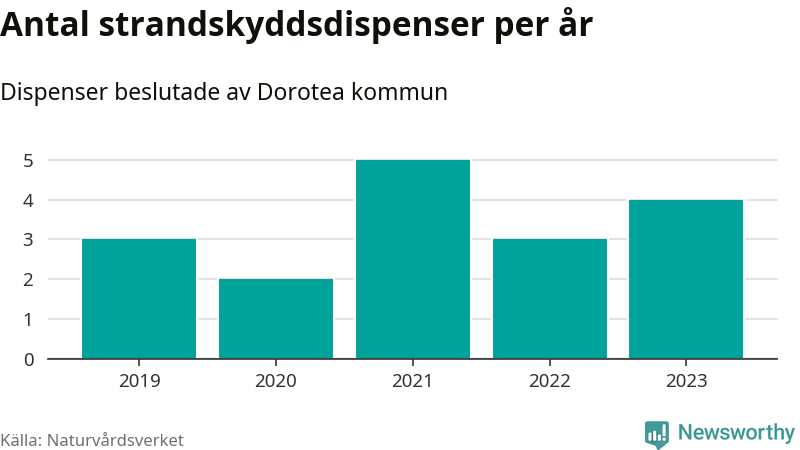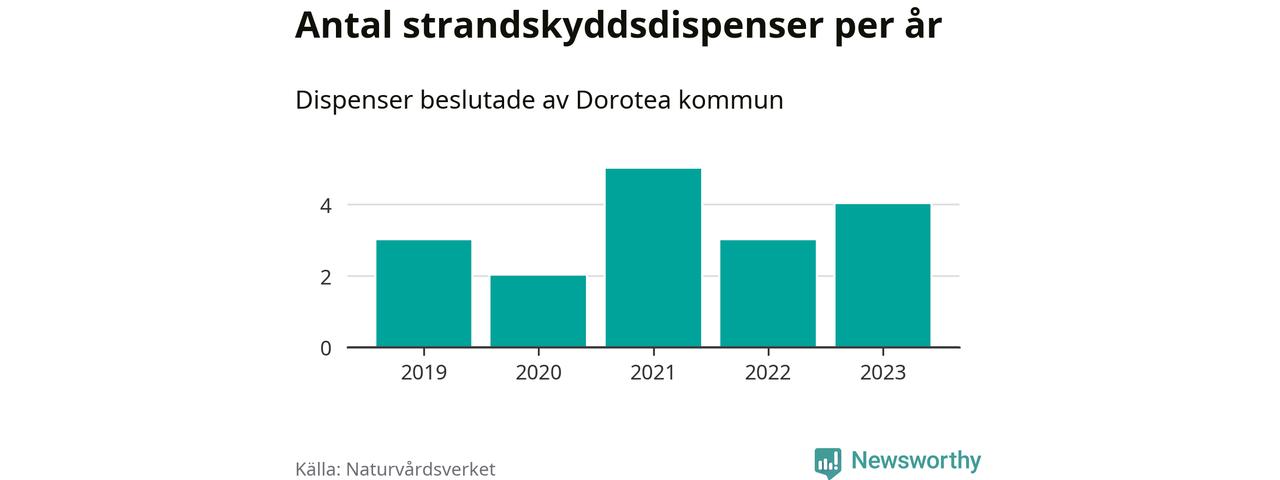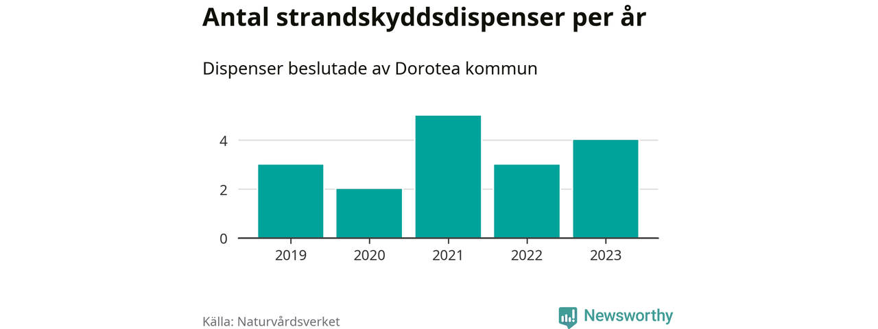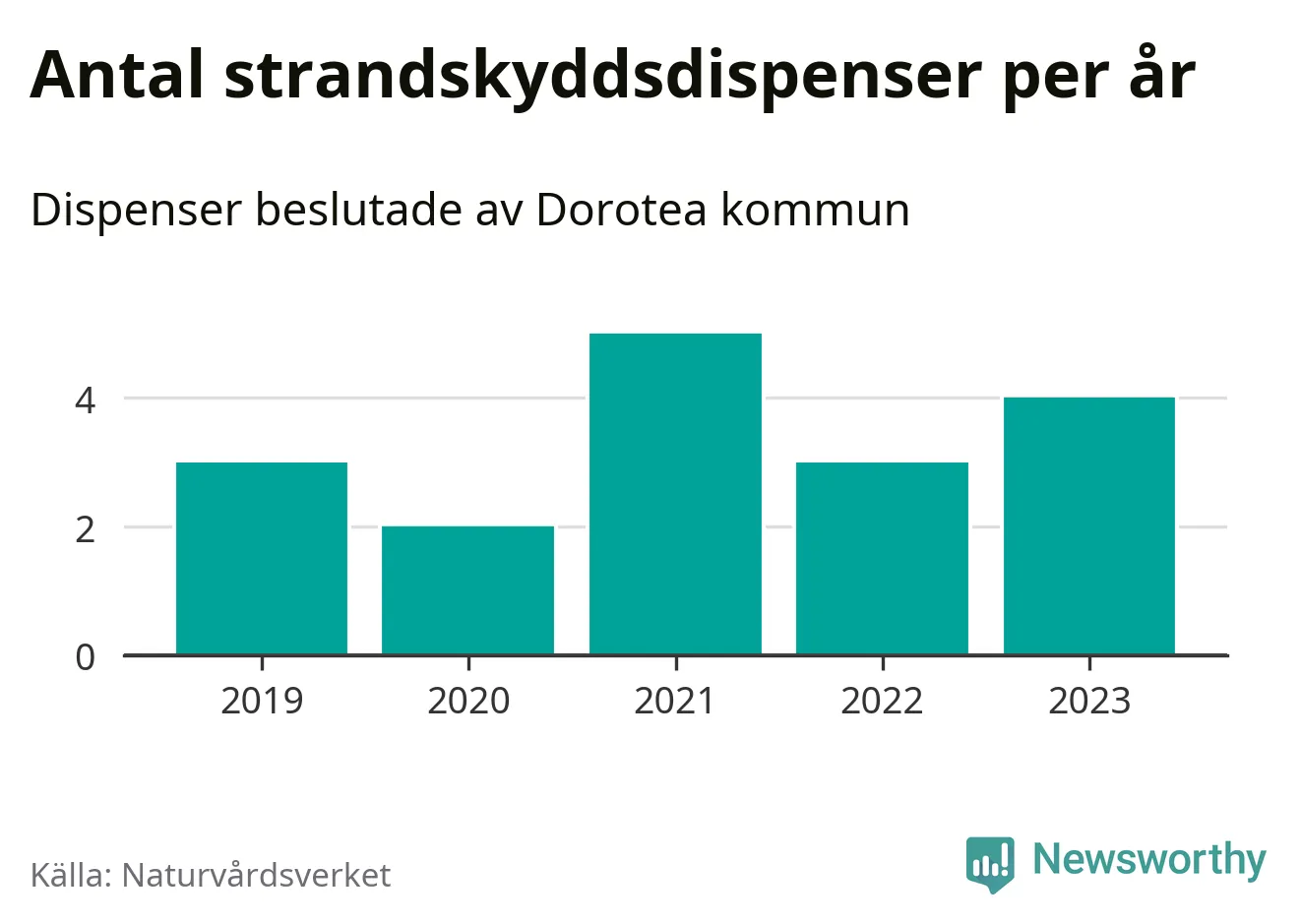 Den som vill bygga nära vatten behöver dispens från strandskyddet, lagstiftningen som ska säkra allmänhetens tillgång till stränderna och bevara livsvillkor för djur och växter. I de flesta fall är det kommunerna som godkänner dispenserna, och under de senaste fem åren har Dorotea kommun fattat 17 beslut för totalt 34 åtgärder inom strandskyddat område, enligt den sammanställning Naturvårdsverket varje år gör. Det är färre än i de flesta kommuner i landet. Flest dispenser i Västerbottens län har godkänts i Skellefteå – 417 stycken.