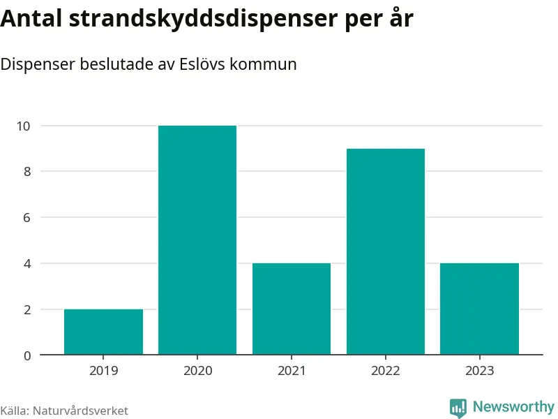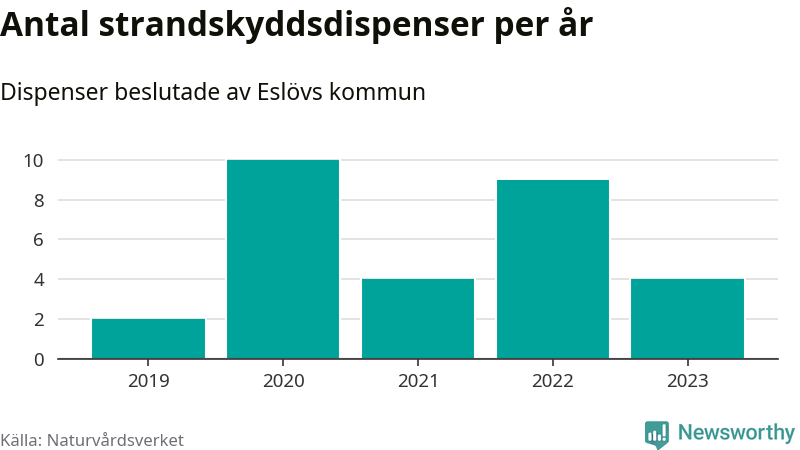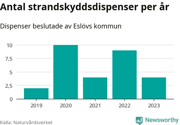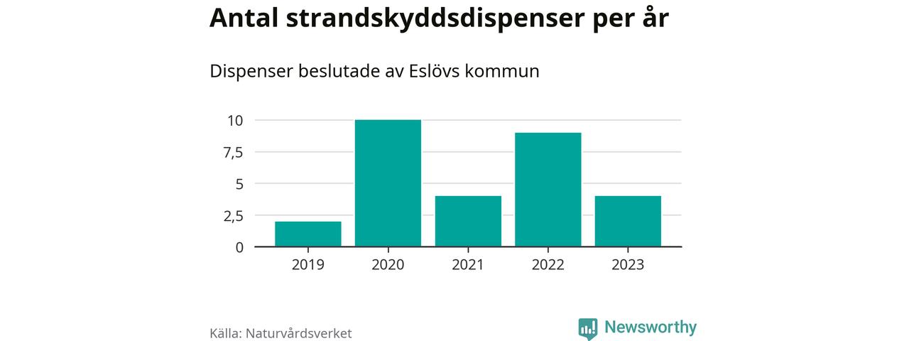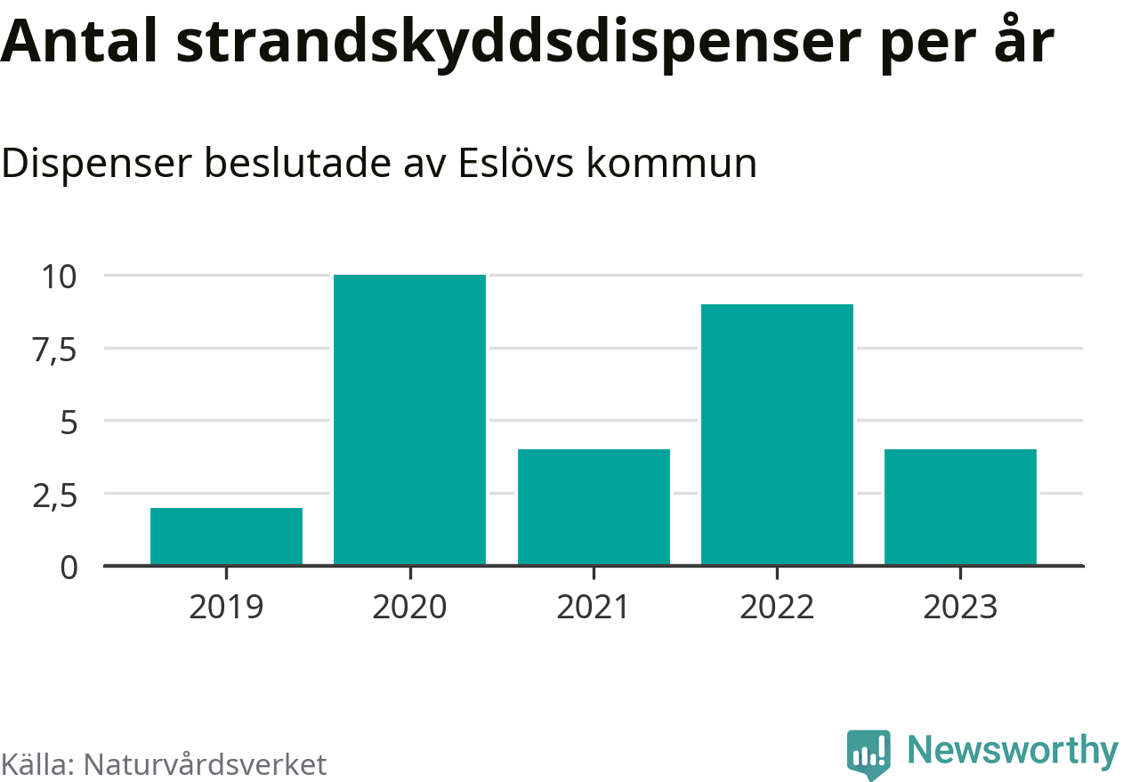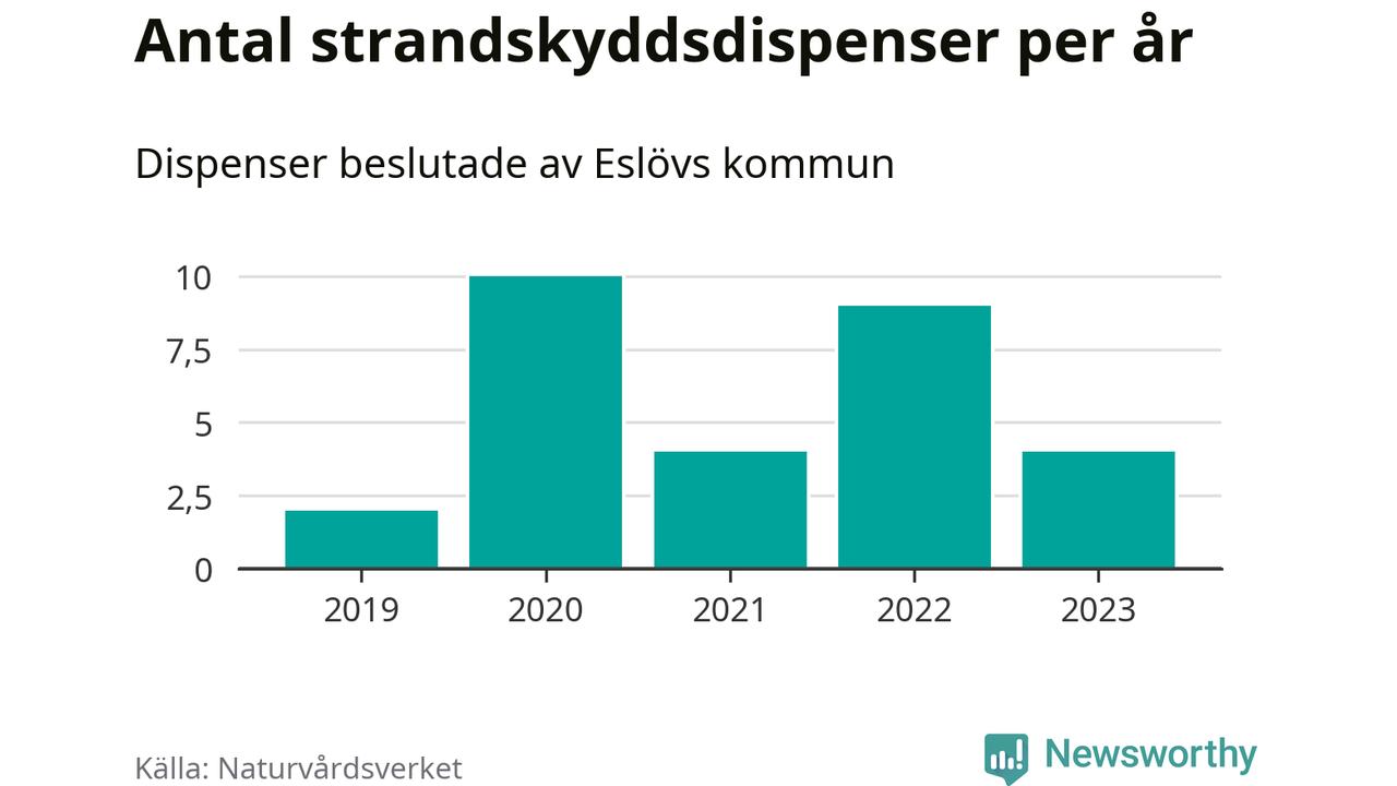 Den som vill bygga nära vatten behöver dispens från strandskyddet, lagstiftningen som ska säkra allmänhetens tillgång till stränderna och bevara livsvillkor för djur och växter. I de flesta fall är det kommunerna som godkänner dispenserna, och under de senaste fem åren har Eslövs kommun fattat 29 beslut för totalt 45 åtgärder inom strandskyddat område, enligt den sammanställning Naturvårdsverket varje år gör. Det är färre än i de flesta kommuner i landet. Flest dispenser i Skåne län har godkänts i Kristianstad – 111 stycken.