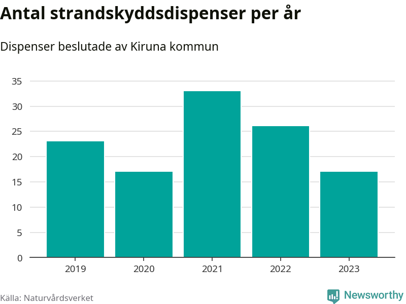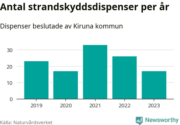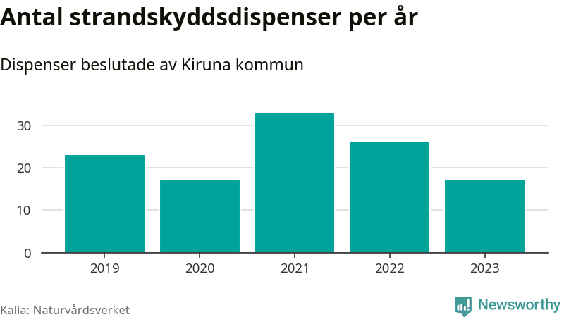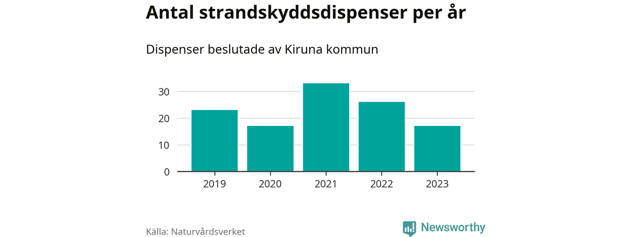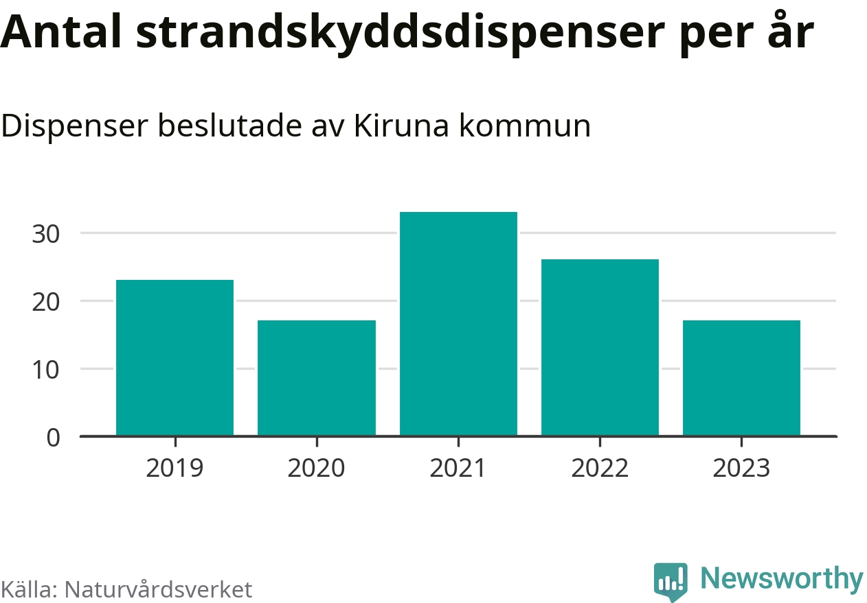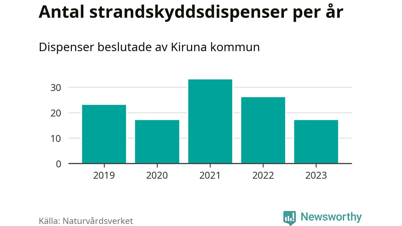 Den som vill bygga nära vatten behöver dispens från strandskyddet, lagstiftningen som ska säkra allmänhetens tillgång till stränderna och bevara livsvillkor för djur och växter. I de flesta fall är det kommunerna som godkänner dispenserna, och under de senaste fem åren har Kiruna kommun fattat 116 beslut för totalt 178 åtgärder inom strandskyddat område, enligt den sammanställning Naturvårdsverket varje år gör. Det är fler än i de flesta kommuner i landet. Flest dispenser i Norrbottens län har godkänts i Luleå – 199 stycken.