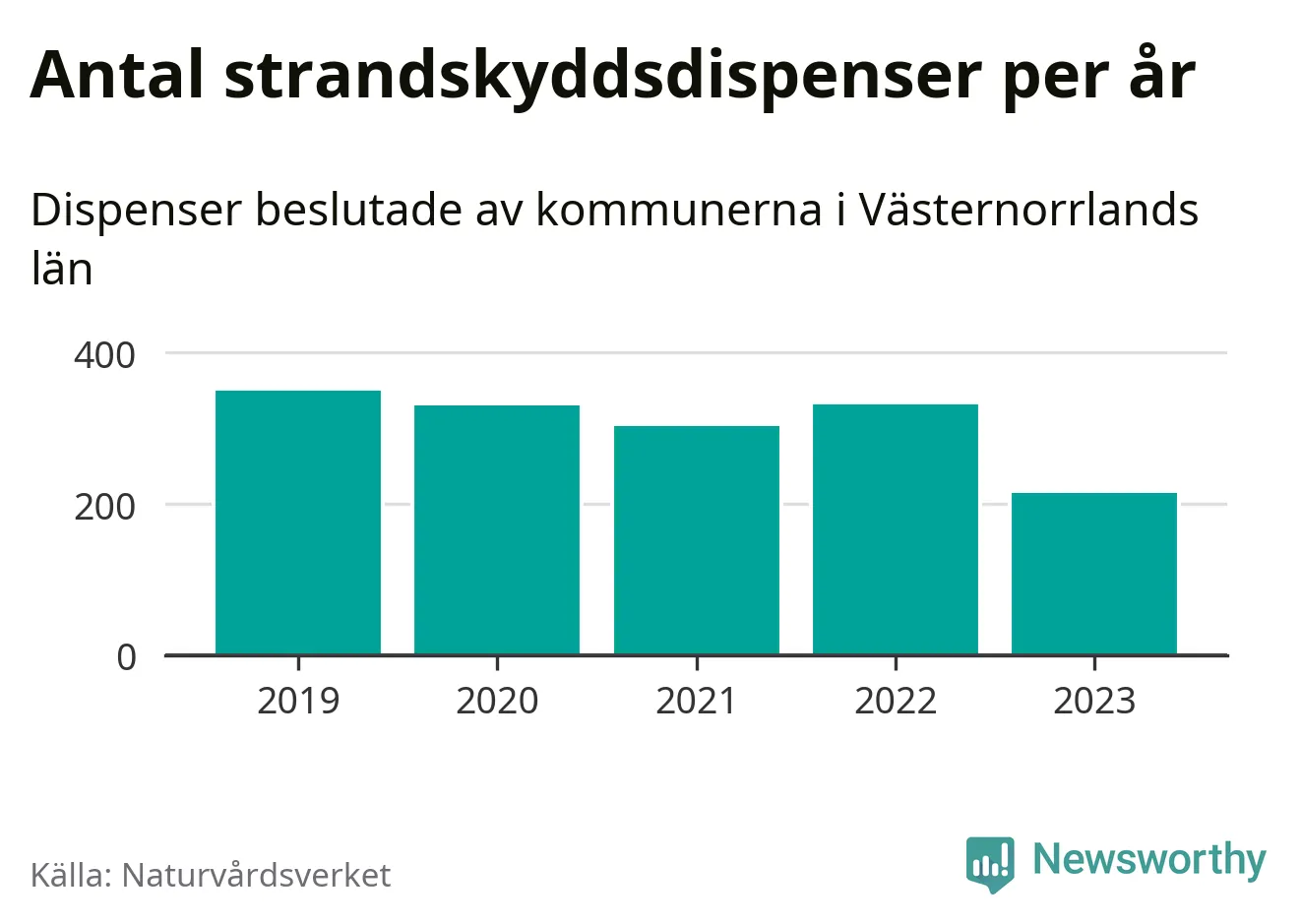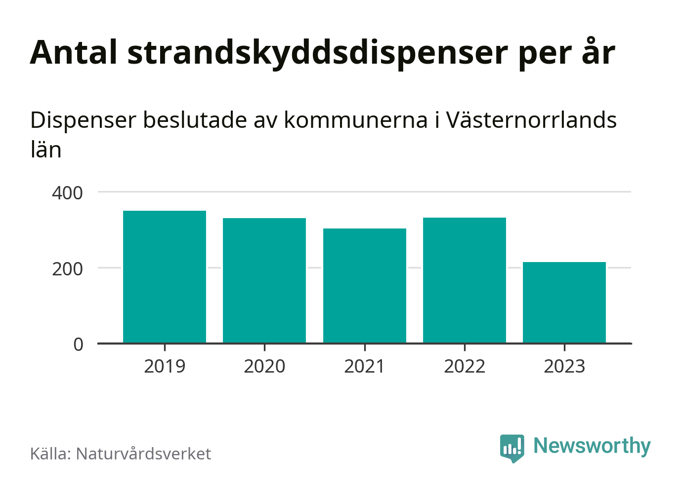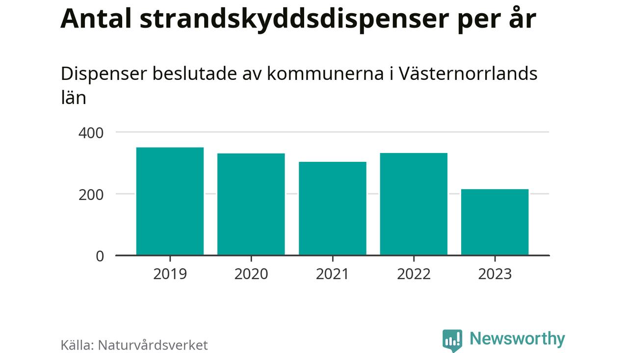 Den som vill bygga nära vatten behöver dispens från strandskyddet, lagstiftningen som ska säkra allmänhetens tillgång till stränderna och bevara livsvillkor för djur och växter. I de flesta fall är det kommunerna som godkänner dispenserna, och under de senaste fem åren har kommunerna i Västernorrlands län fattat 1 527 beslut för totalt 2 001 åtgärder inom strandskyddat område, enligt den sammanställning Naturvårdsverket varje år gör.