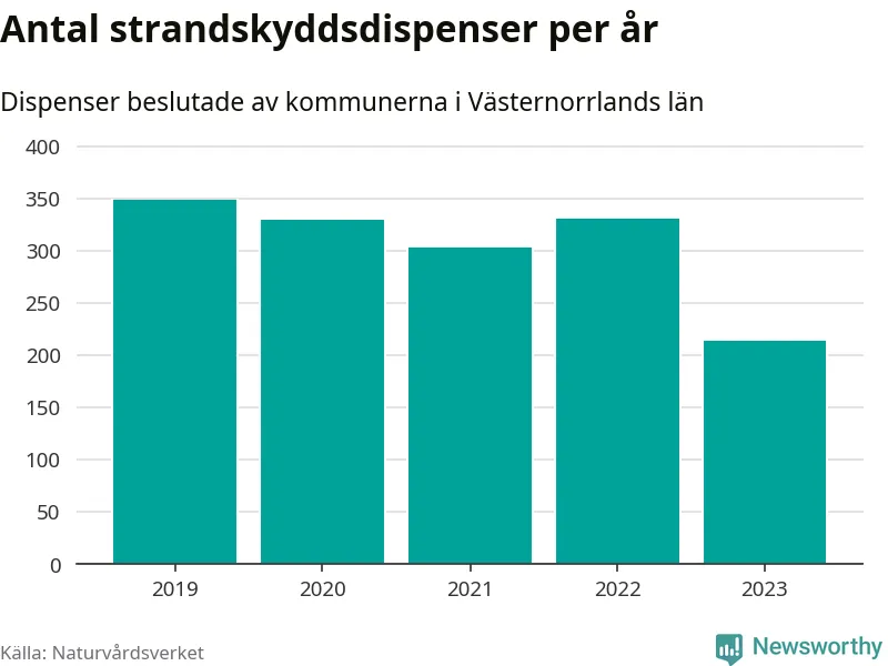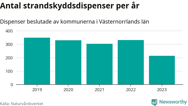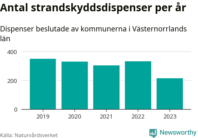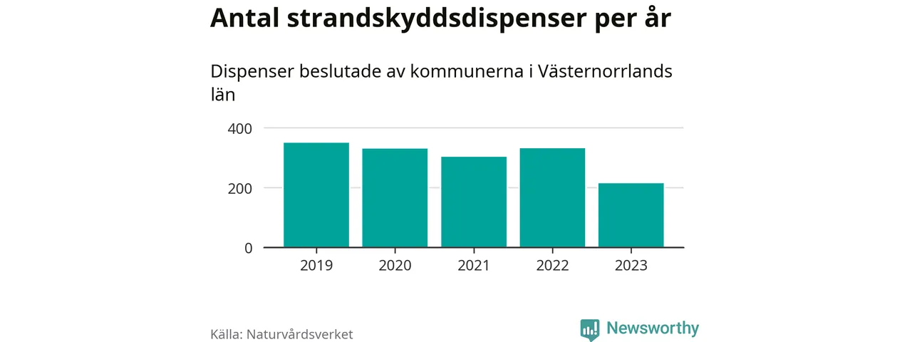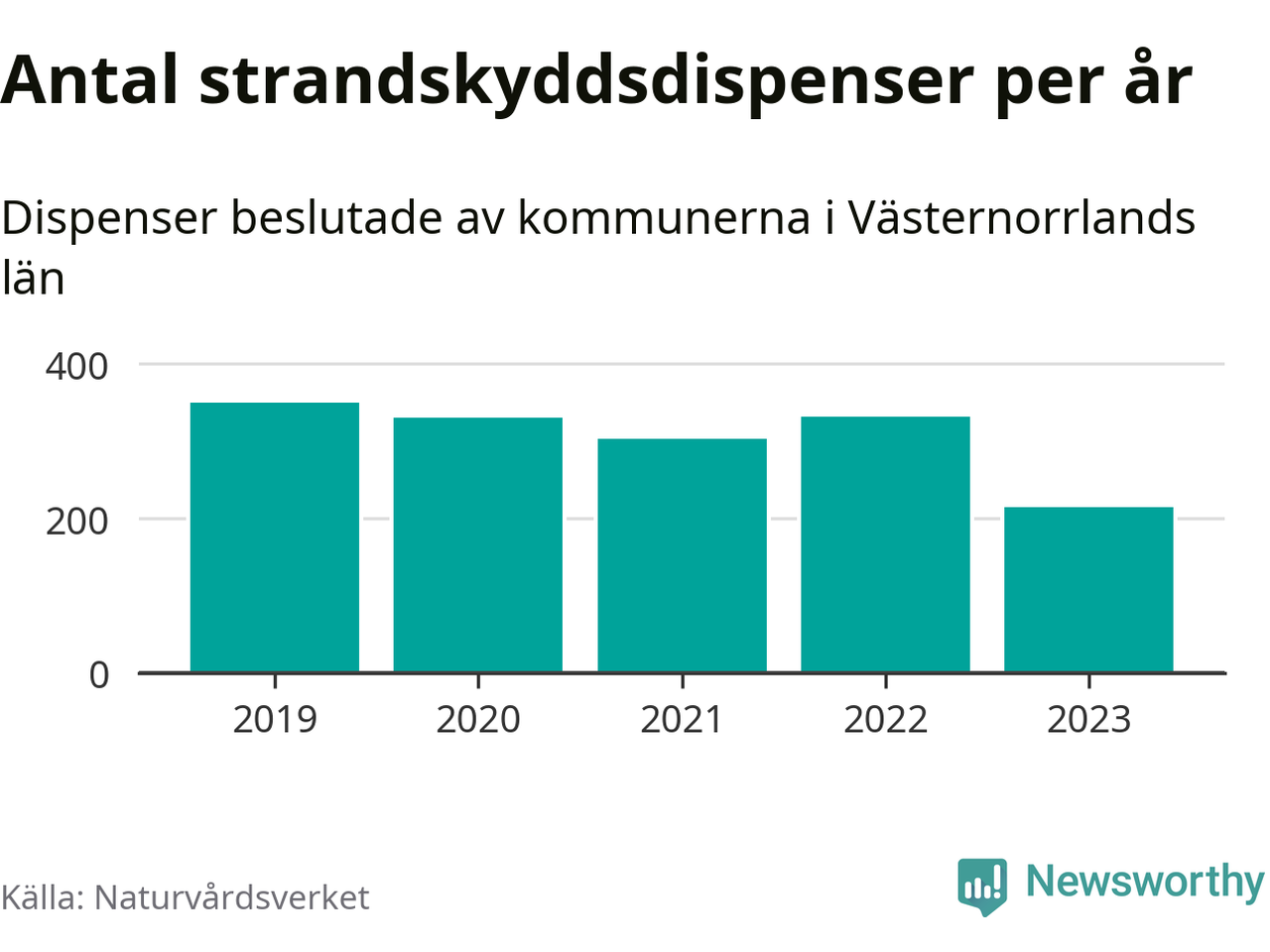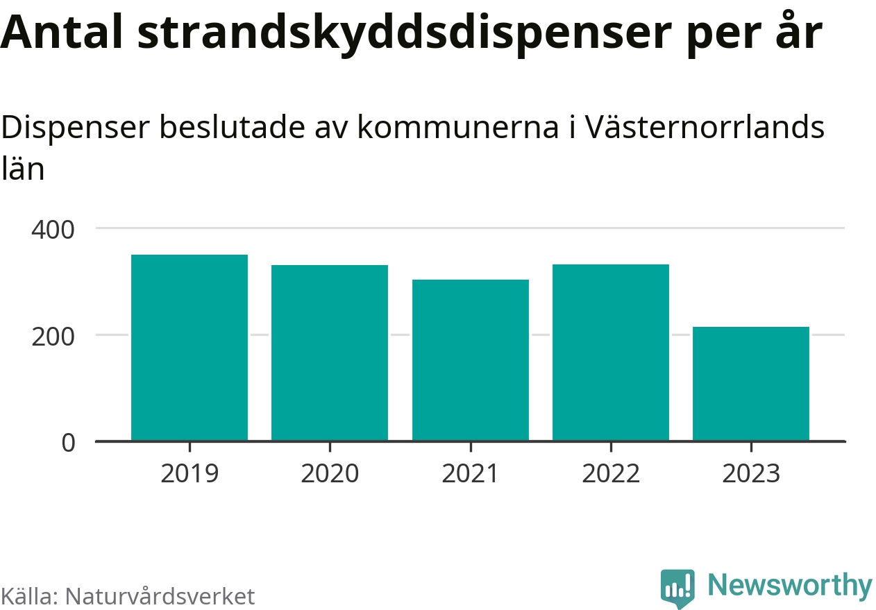 Den som vill bygga nära vatten behöver dispens från strandskyddet, lagstiftningen som ska säkra allmänhetens tillgång till stränderna och bevara livsvillkor för djur och växter. I de flesta fall är det kommunerna som godkänner dispenserna, och under de senaste fem åren har kommunerna i Västernorrlands län fattat 1 527 beslut för totalt 2 001 åtgärder inom strandskyddat område, enligt den sammanställning Naturvårdsverket varje år gör.