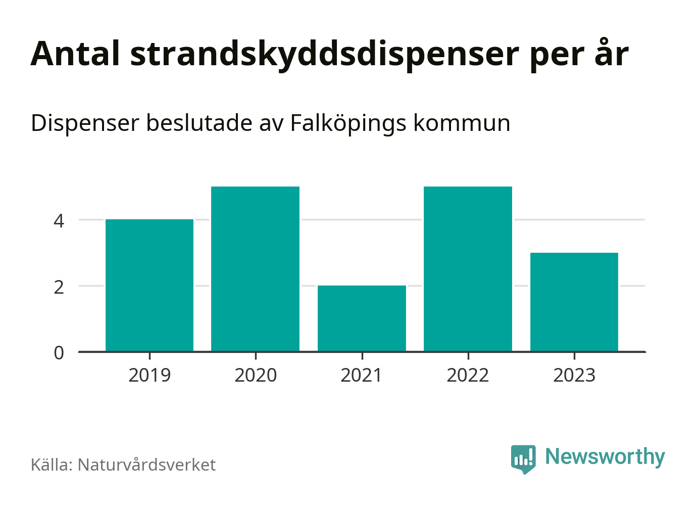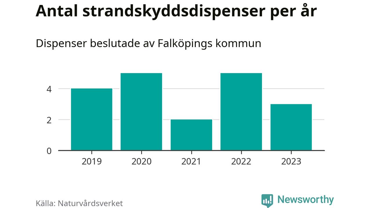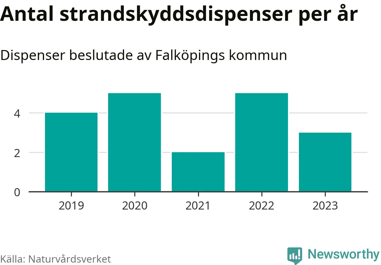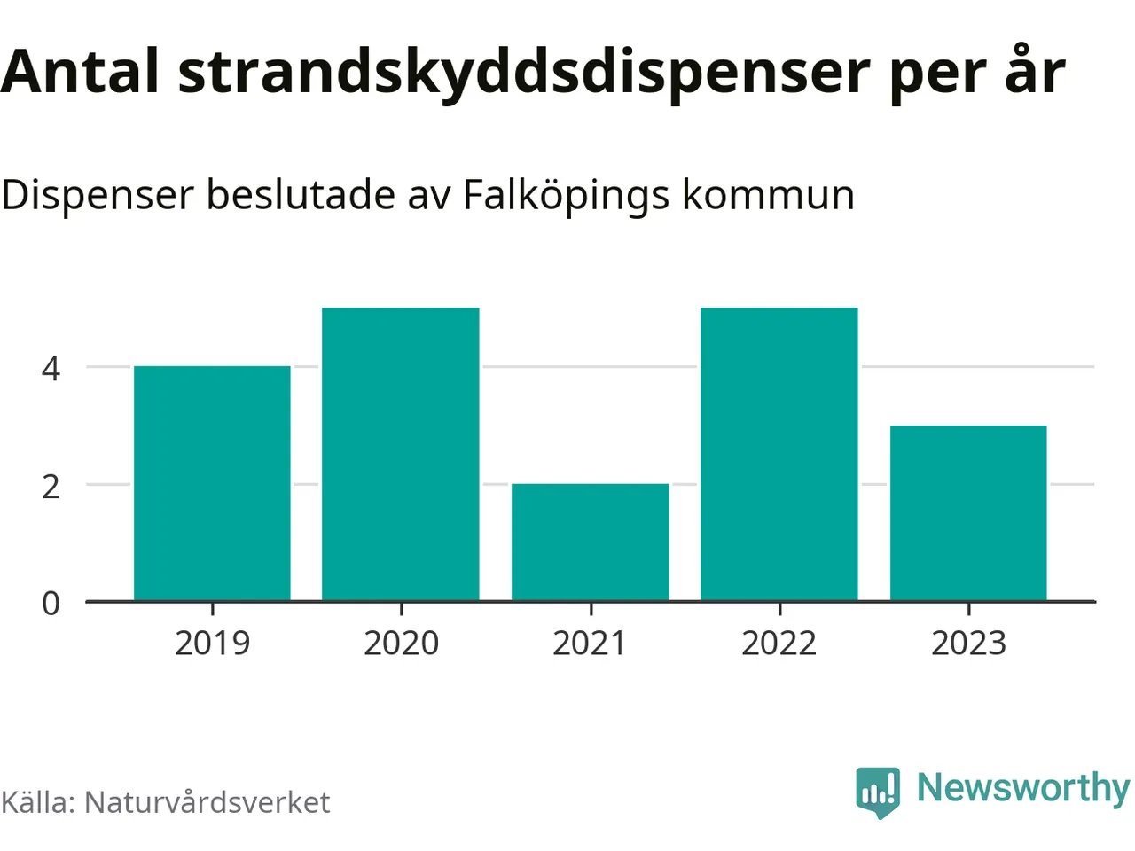 Den som vill bygga nära vatten behöver dispens från strandskyddet, lagstiftningen som ska säkra allmänhetens tillgång till stränderna och bevara livsvillkor för djur och växter. I de flesta fall är det kommunerna som godkänner dispenserna, och under de senaste fem åren har Falköpings kommun fattat 19 beslut för totalt 26 åtgärder inom strandskyddat område, enligt den sammanställning Naturvårdsverket varje år gör. Det är färre än i de flesta kommuner i landet. Flest dispenser i Västra Götalands län har godkänts i Borås – 220 stycken.