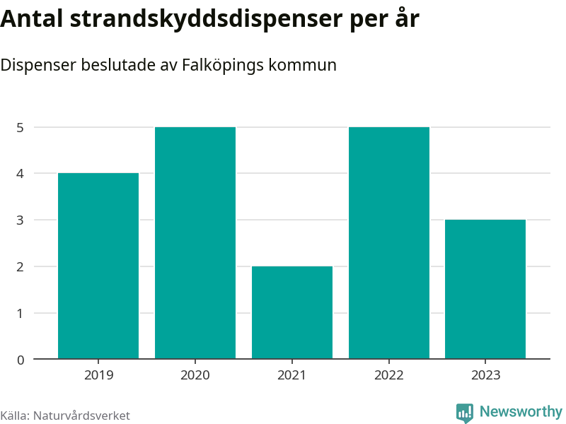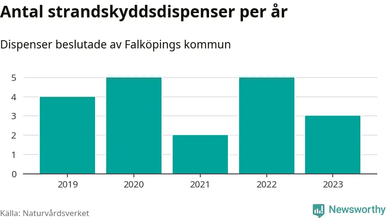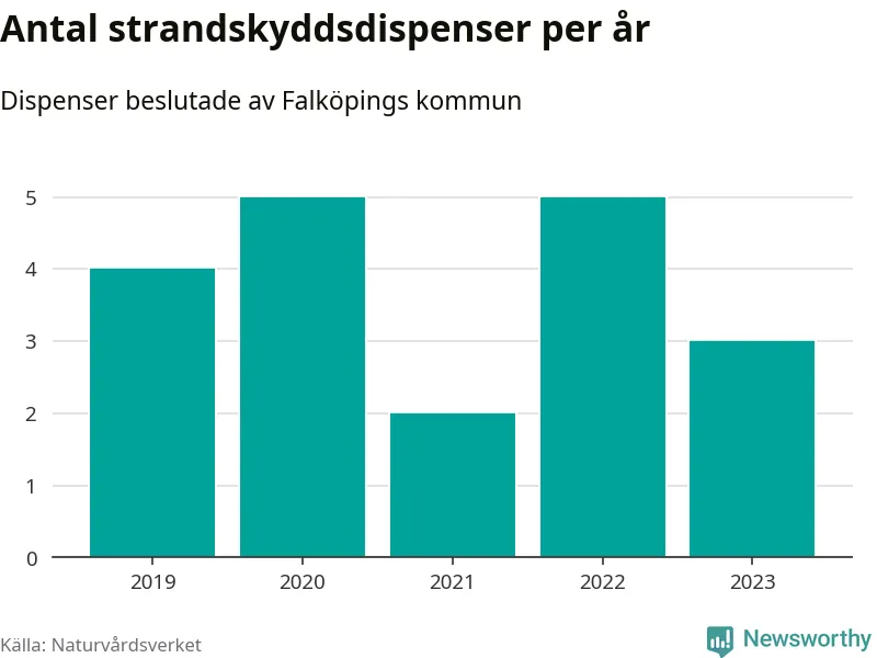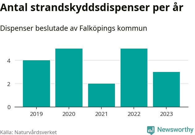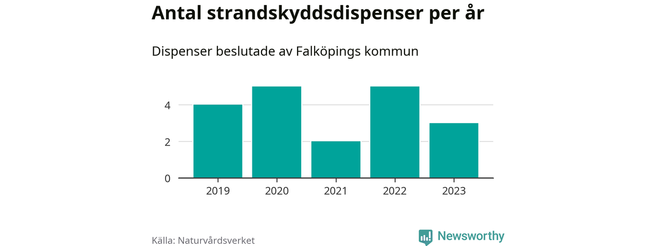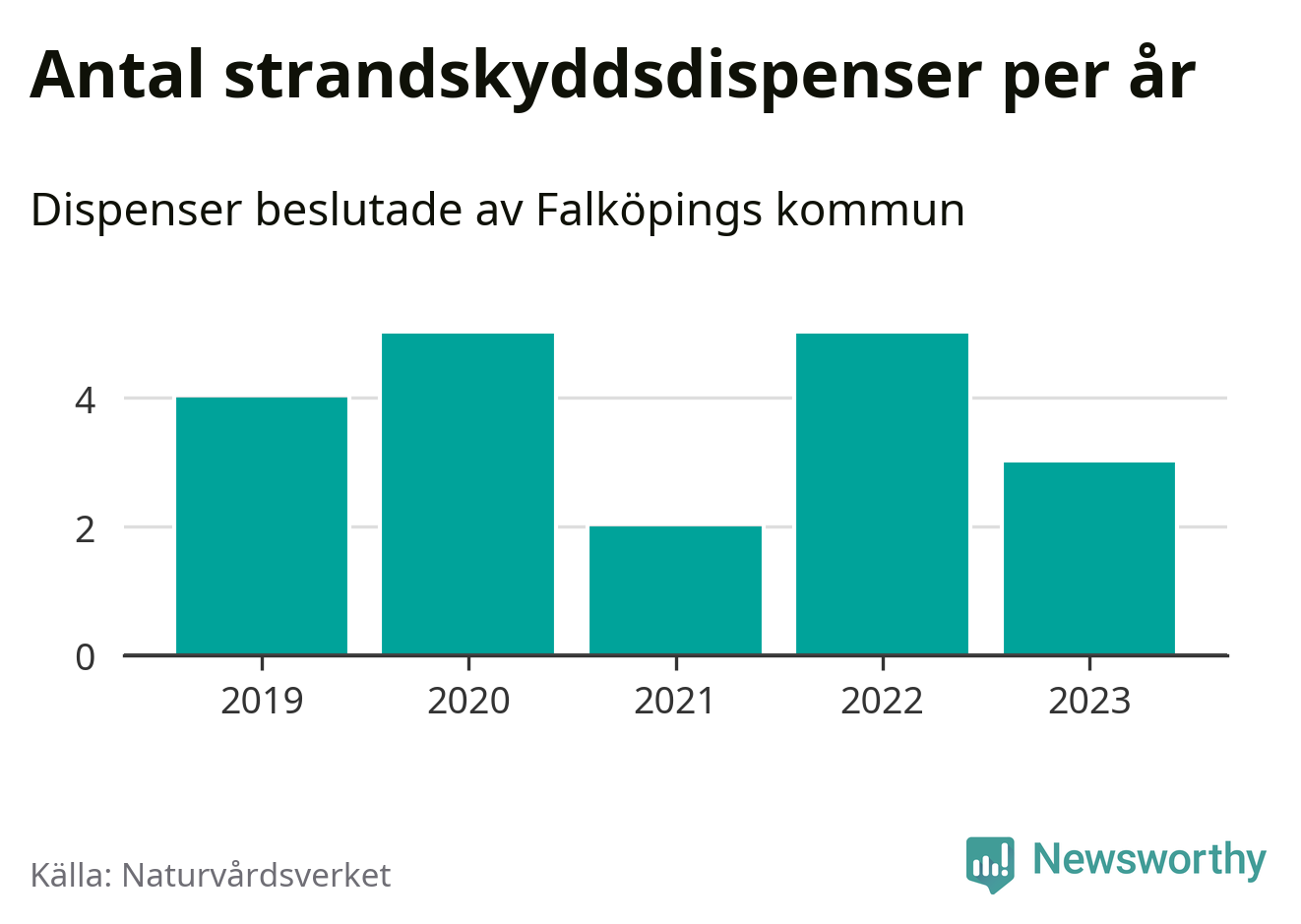 Den som vill bygga nära vatten behöver dispens från strandskyddet, lagstiftningen som ska säkra allmänhetens tillgång till stränderna och bevara livsvillkor för djur och växter. I de flesta fall är det kommunerna som godkänner dispenserna, och under de senaste fem åren har Falköpings kommun fattat 19 beslut för totalt 26 åtgärder inom strandskyddat område, enligt den sammanställning Naturvårdsverket varje år gör. Det är färre än i de flesta kommuner i landet. Flest dispenser i Västra Götalands län har godkänts i Borås – 220 stycken.