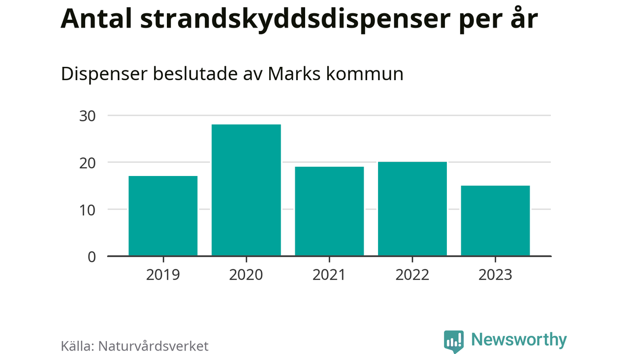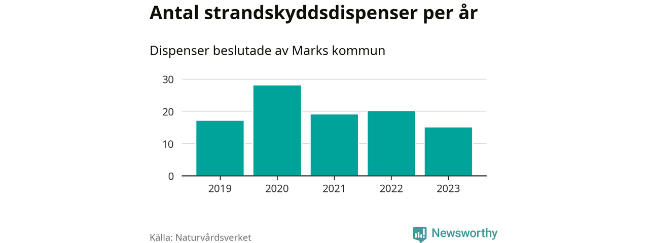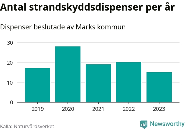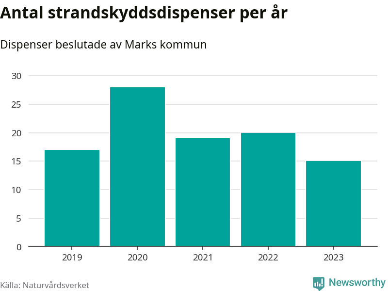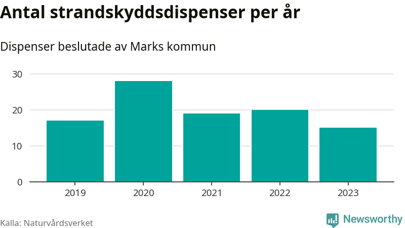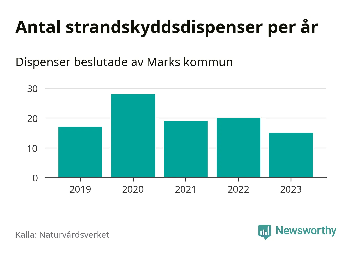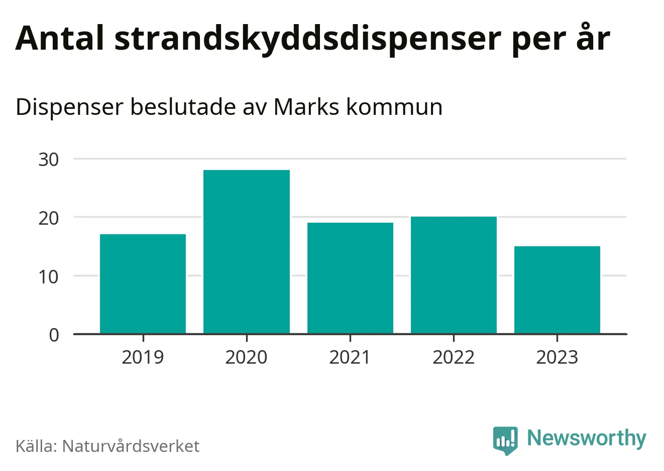 Den som vill bygga nära vatten behöver dispens från strandskyddet, lagstiftningen som ska säkra allmänhetens tillgång till stränderna och bevara livsvillkor för djur och växter. I de flesta fall är det kommunerna som godkänner dispenserna, och under de senaste fem åren har Marks kommun fattat 99 beslut för totalt 165 åtgärder inom strandskyddat område, enligt den sammanställning Naturvårdsverket varje år gör. Det är fler än i de flesta kommuner i landet. Flest dispenser i Västra Götalands län har godkänts i Borås – 220 stycken.