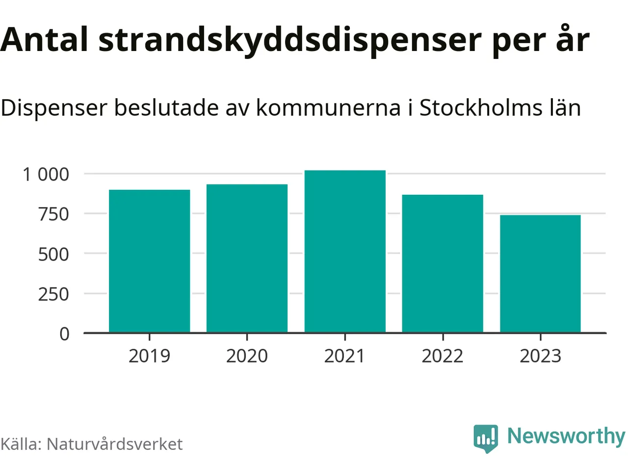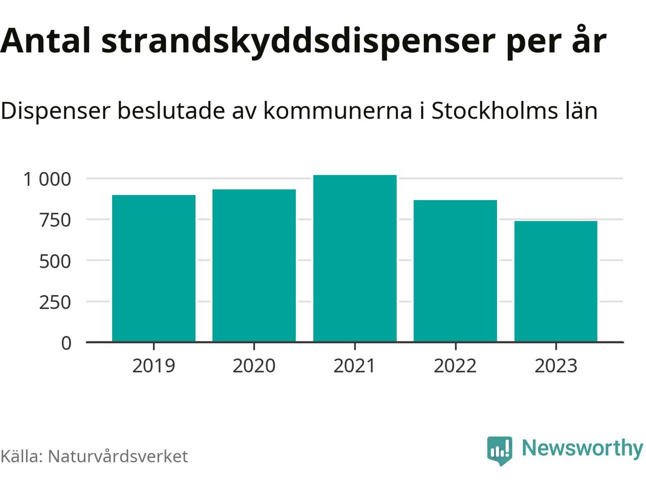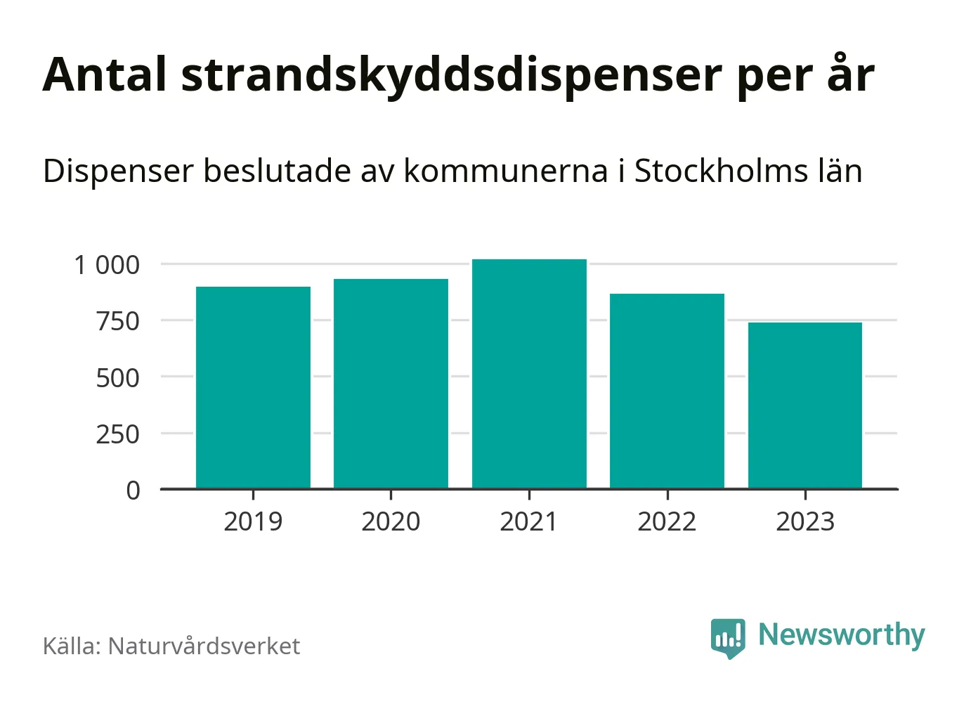 Den som vill bygga nära vatten behöver dispens från strandskyddet, lagstiftningen som ska säkra allmänhetens tillgång till stränderna och bevara livsvillkor för djur och växter. I de flesta fall är det kommunerna som godkänner dispenserna, och under de senaste fem åren har kommunerna i Stockholms län fattat 4 445 beslut för totalt 6 297 åtgärder inom strandskyddat område, enligt den sammanställning Naturvårdsverket varje år gör.