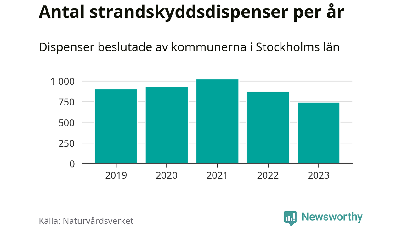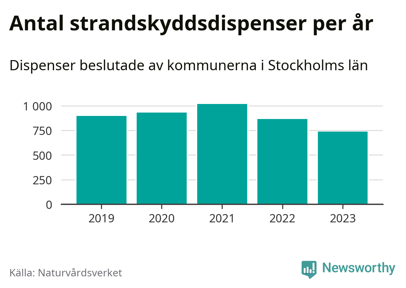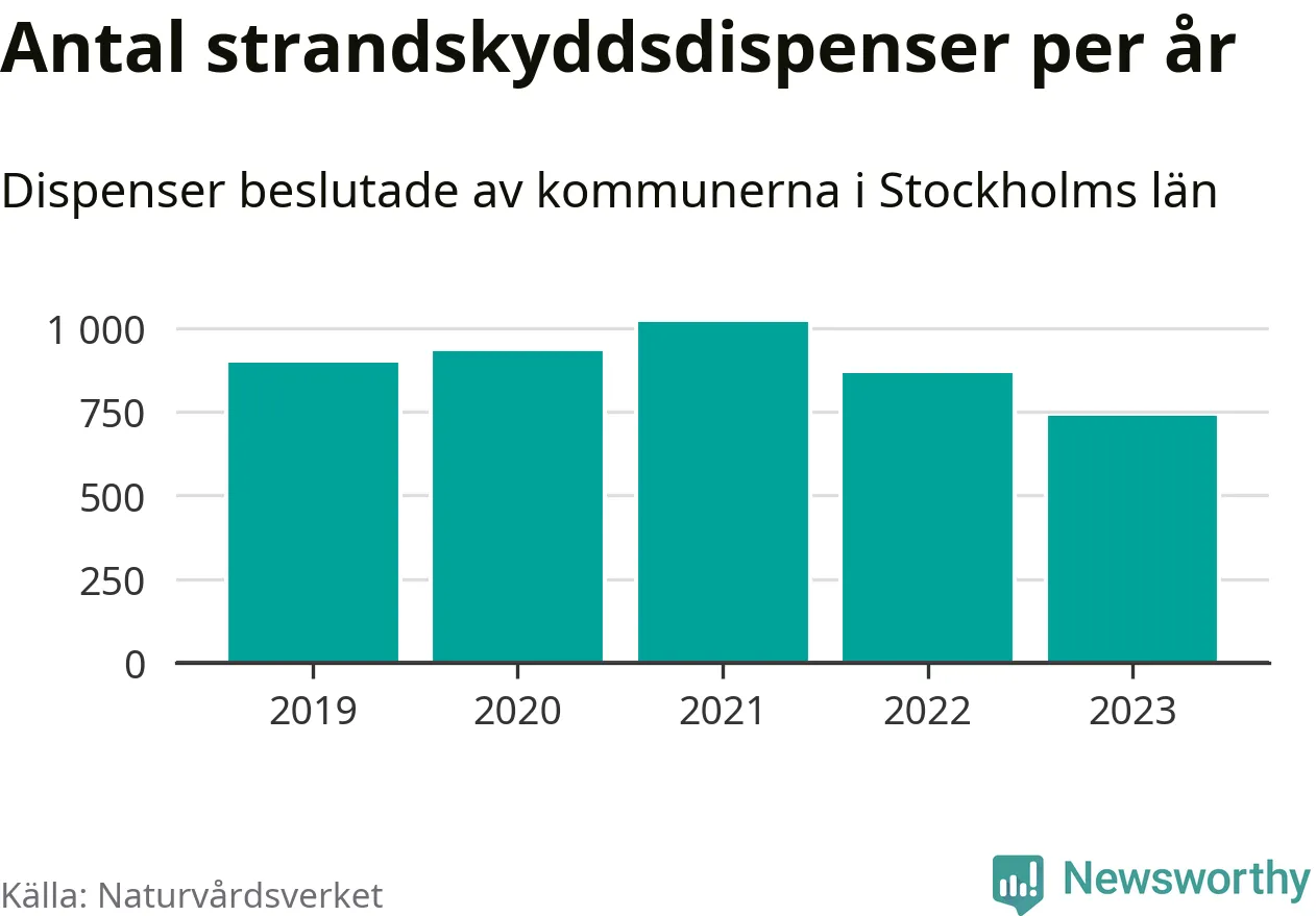 Den som vill bygga nära vatten behöver dispens från strandskyddet, lagstiftningen som ska säkra allmänhetens tillgång till stränderna och bevara livsvillkor för djur och växter. I de flesta fall är det kommunerna som godkänner dispenserna, och under de senaste fem åren har kommunerna i Stockholms län fattat 4 445 beslut för totalt 6 297 åtgärder inom strandskyddat område, enligt den sammanställning Naturvårdsverket varje år gör.