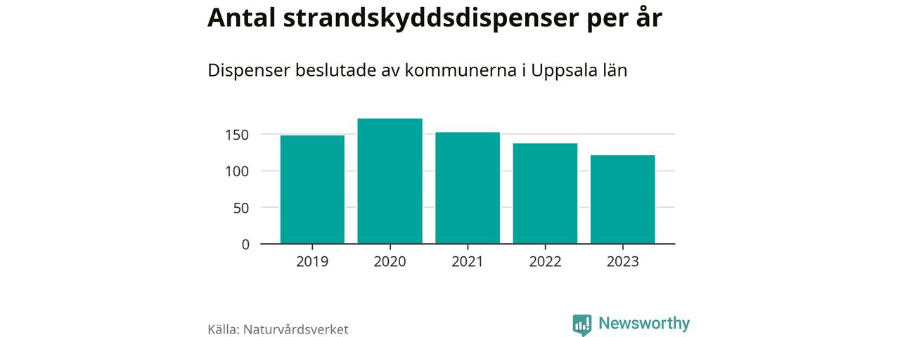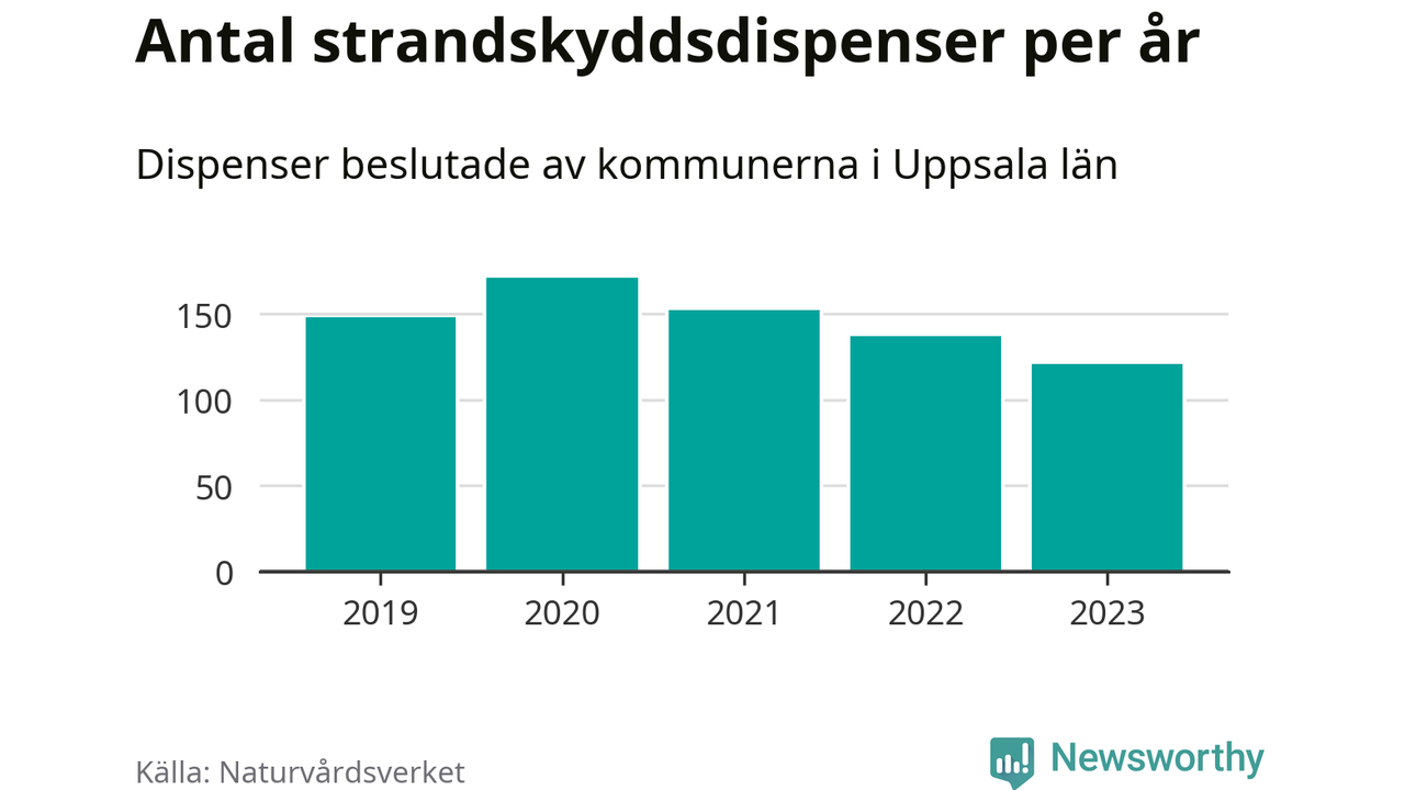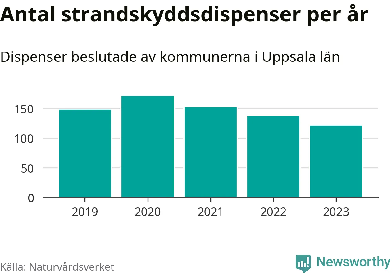 Den som vill bygga nära vatten behöver dispens från strandskyddet, lagstiftningen som ska säkra allmänhetens tillgång till stränderna och bevara livsvillkor för djur och växter. I de flesta fall är det kommunerna som godkänner dispenserna, och under de senaste fem åren har kommunerna i Uppsala län fattat 729 beslut för totalt 1 187 åtgärder inom strandskyddat område, enligt den sammanställning Naturvårdsverket varje år gör.