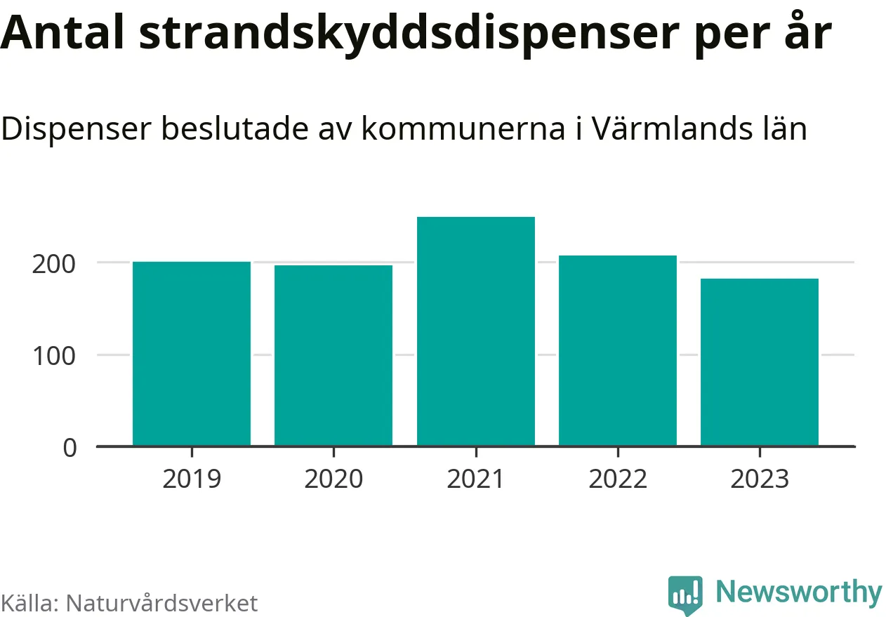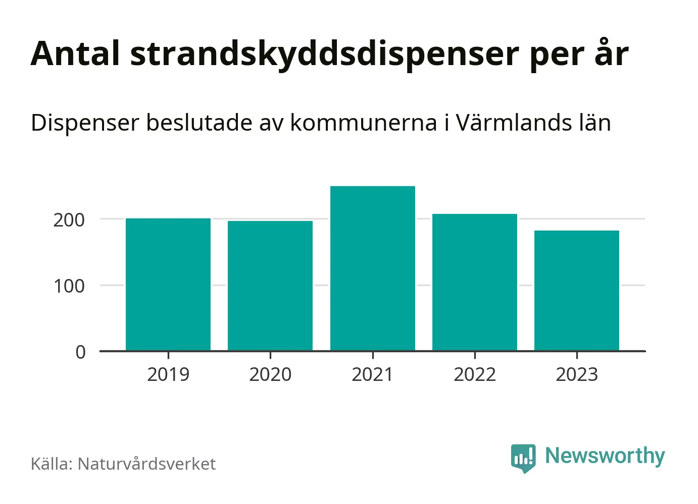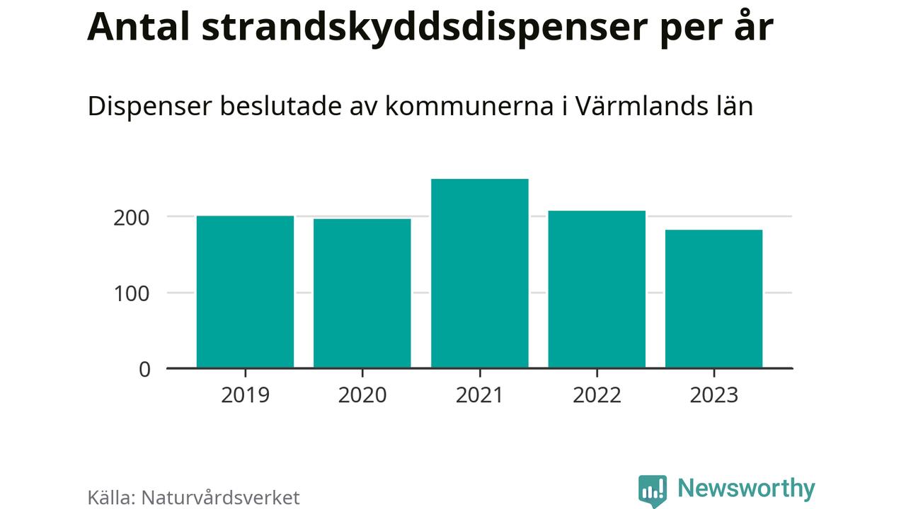 Den som vill bygga nära vatten behöver dispens från strandskyddet, lagstiftningen som ska säkra allmänhetens tillgång till stränderna och bevara livsvillkor för djur och växter. I de flesta fall är det kommunerna som godkänner dispenserna, och under de senaste fem åren har kommunerna i Värmlands län fattat 1 034 beslut för totalt 1 360 åtgärder inom strandskyddat område, enligt den sammanställning Naturvårdsverket varje år gör.