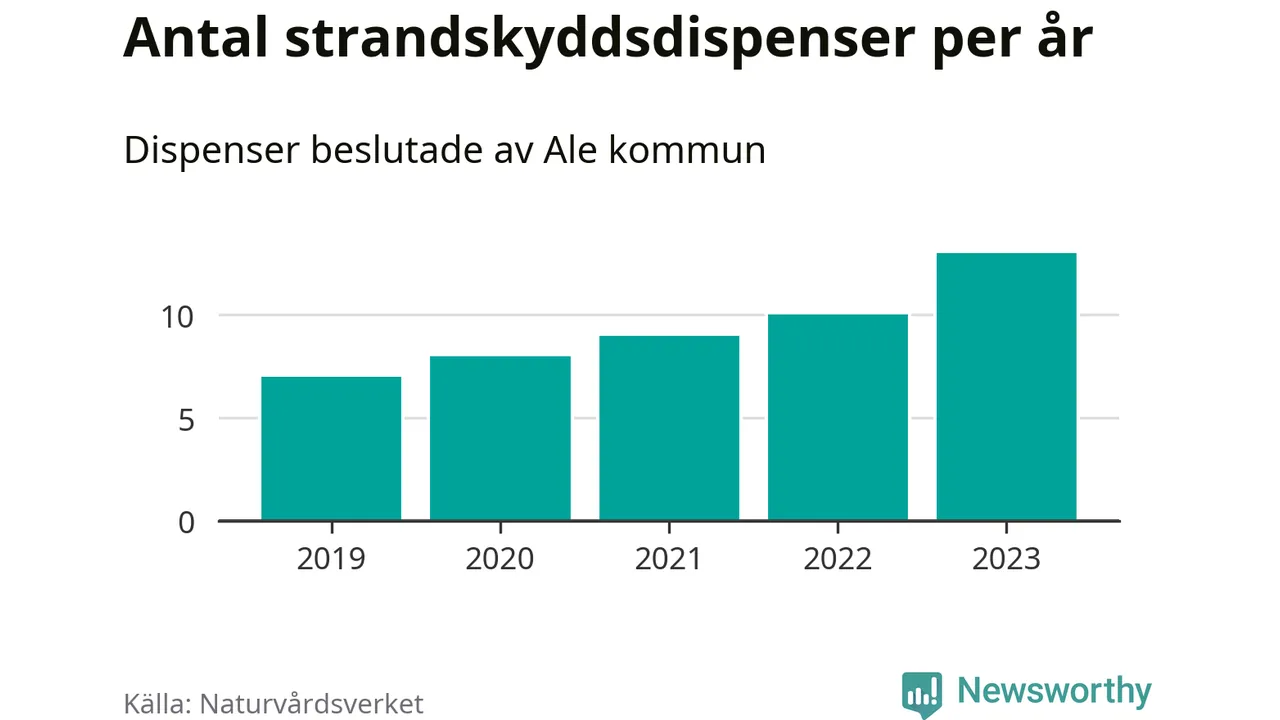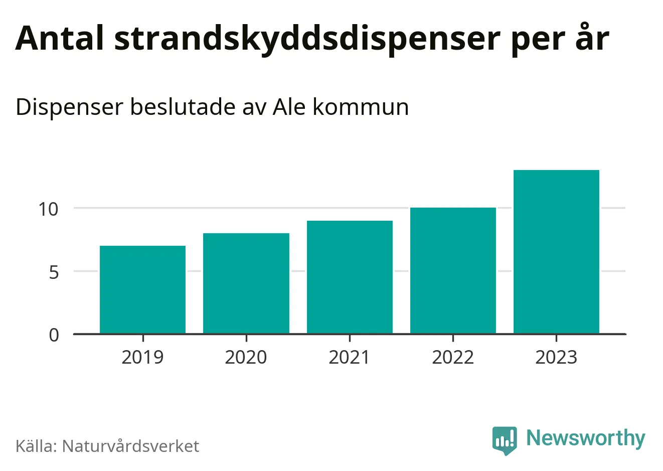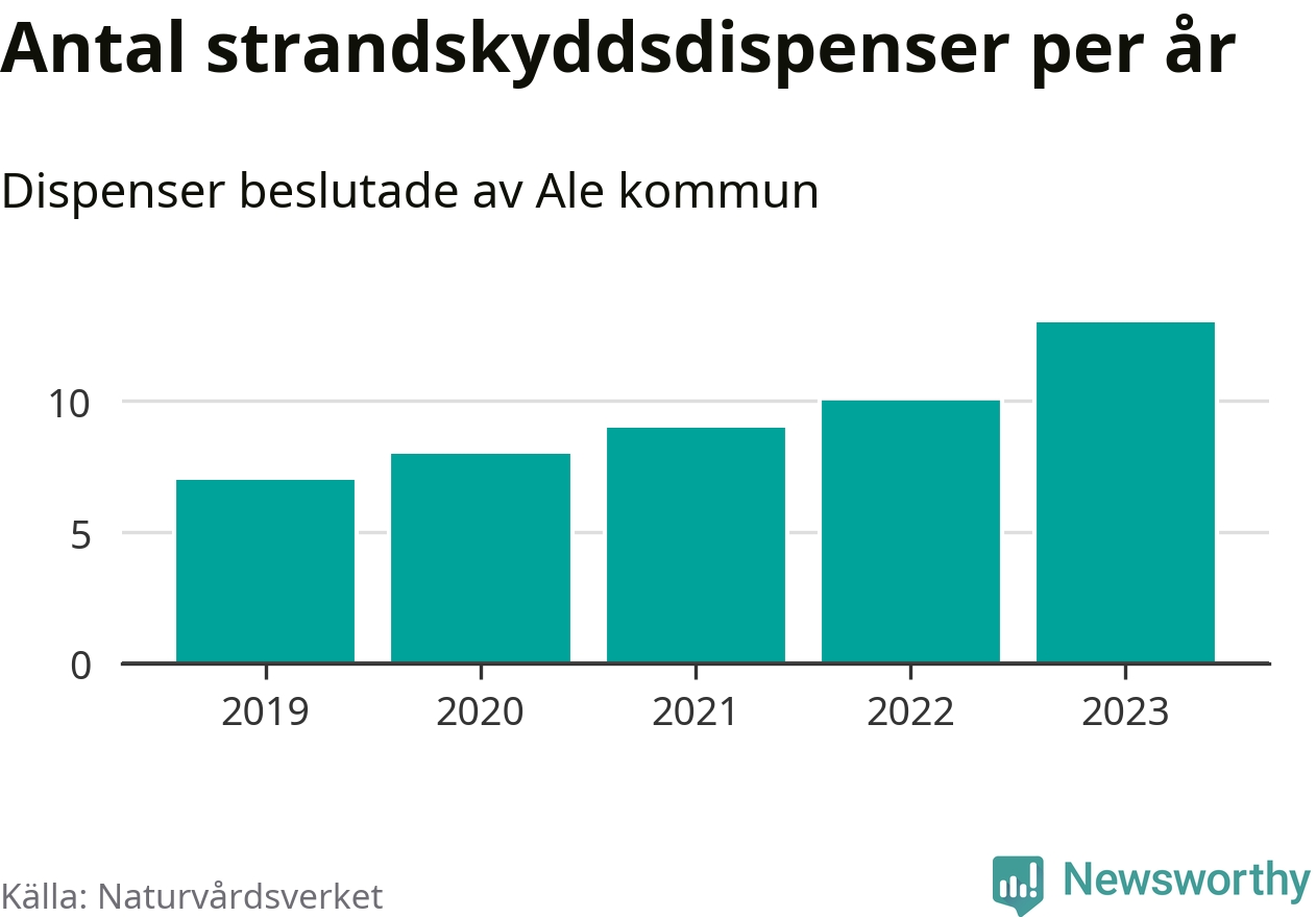 Den som vill bygga nära vatten behöver dispens från strandskyddet, lagstiftningen som ska säkra allmänhetens tillgång till stränderna och bevara livsvillkor för djur och växter. I de flesta fall är det kommunerna som godkänner dispenserna, och under de senaste fem åren har Ale kommun fattat 47 beslut för totalt 71 åtgärder inom strandskyddat område, enligt den sammanställning Naturvårdsverket varje år gör. Det är inte en siffra som sticker ut särskilt jämfört med andra kommuner. Flest dispenser i Västra Götalands län har godkänts i Borås – 220 stycken.
