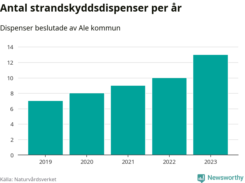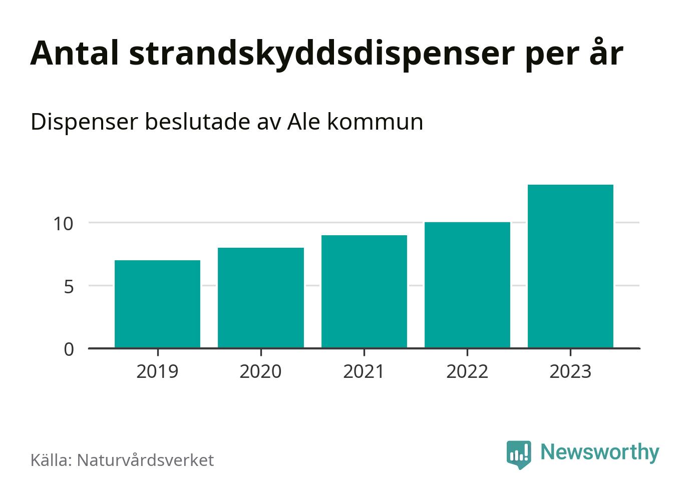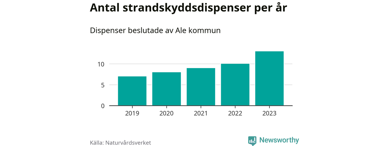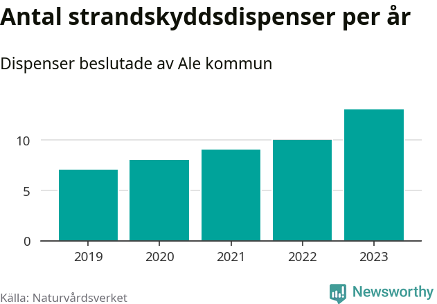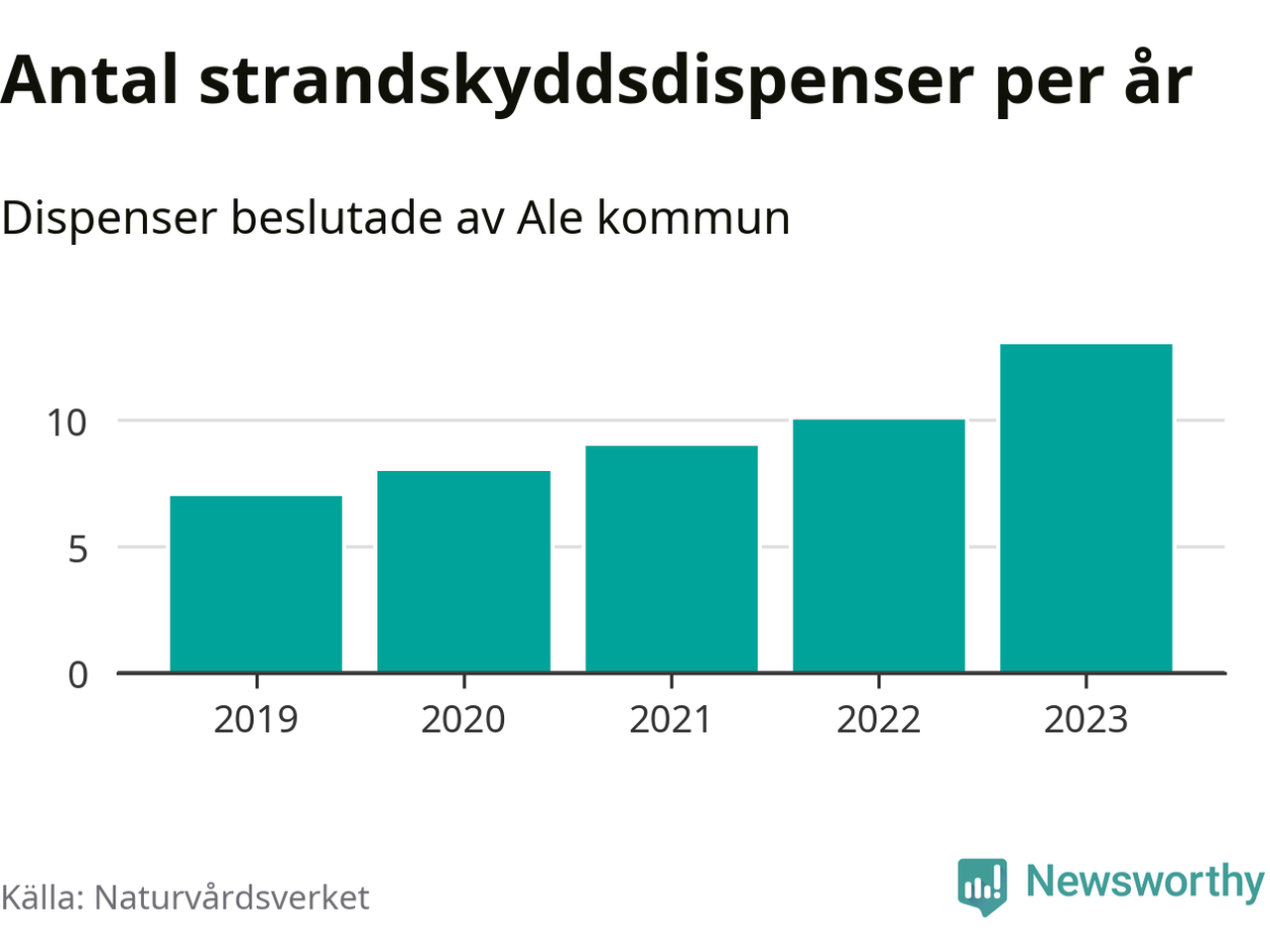 Den som vill bygga nära vatten behöver dispens från strandskyddet, lagstiftningen som ska säkra allmänhetens tillgång till stränderna och bevara livsvillkor för djur och växter. I de flesta fall är det kommunerna som godkänner dispenserna, och under de senaste fem åren har Ale kommun fattat 47 beslut för totalt 71 åtgärder inom strandskyddat område, enligt den sammanställning Naturvårdsverket varje år gör. Det är inte en siffra som sticker ut särskilt jämfört med andra kommuner. Flest dispenser i Västra Götalands län har godkänts i Borås – 220 stycken.