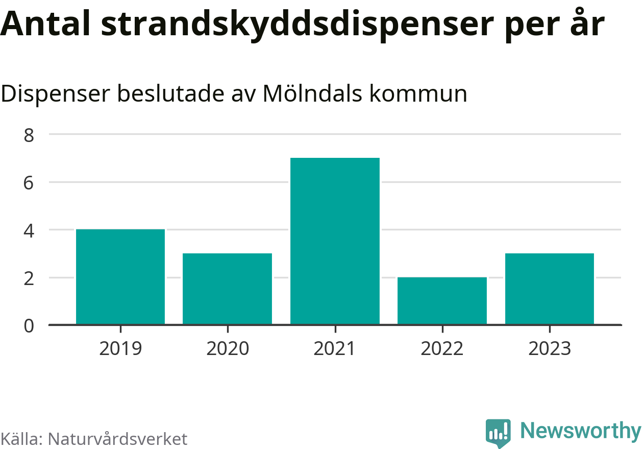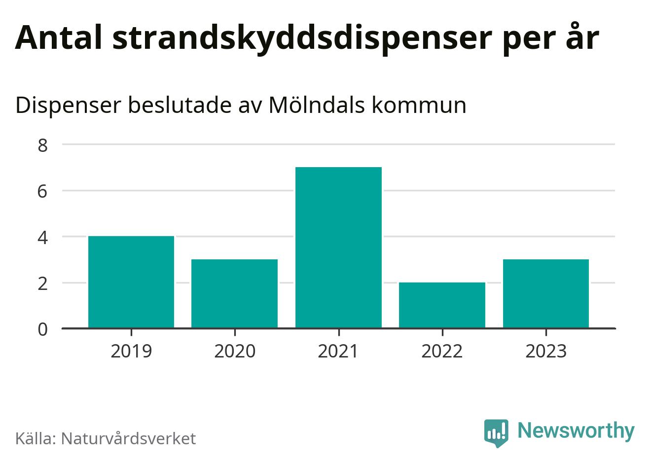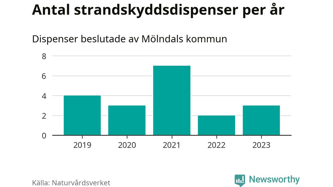 Den som vill bygga nära vatten behöver dispens från strandskyddet, lagstiftningen som ska säkra allmänhetens tillgång till stränderna och bevara livsvillkor för djur och växter. I de flesta fall är det kommunerna som godkänner dispenserna, och under de senaste fem åren har Mölndals kommun fattat 19 beslut för totalt 27 åtgärder inom strandskyddat område, enligt den sammanställning Naturvårdsverket varje år gör. Det är färre än i de flesta kommuner i landet. Flest dispenser i Västra Götalands län har godkänts i Borås – 220 stycken.