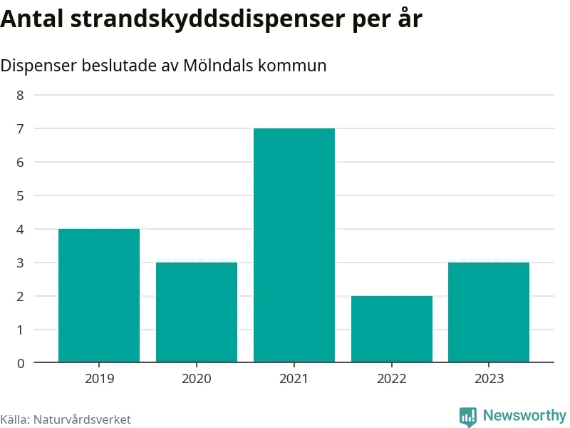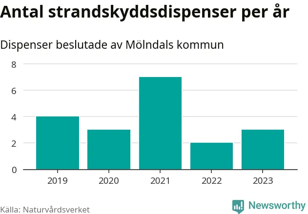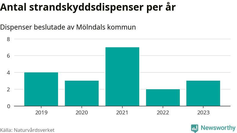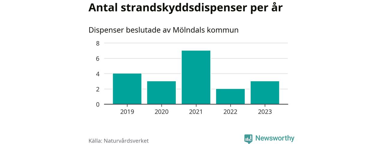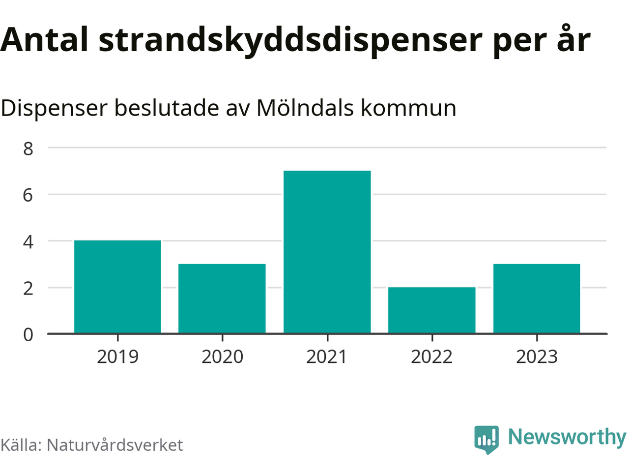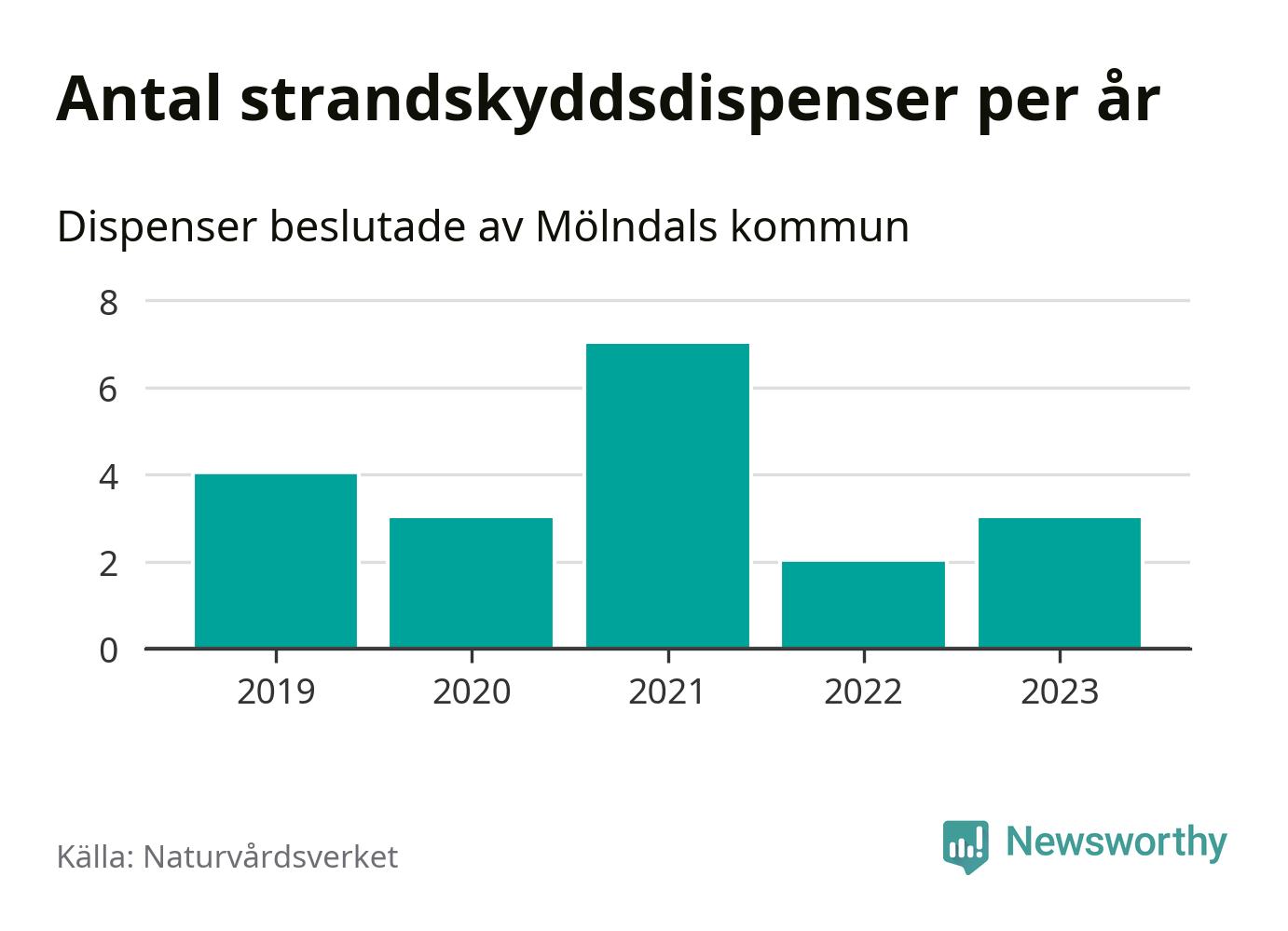 Den som vill bygga nära vatten behöver dispens från strandskyddet, lagstiftningen som ska säkra allmänhetens tillgång till stränderna och bevara livsvillkor för djur och växter. I de flesta fall är det kommunerna som godkänner dispenserna, och under de senaste fem åren har Mölndals kommun fattat 19 beslut för totalt 27 åtgärder inom strandskyddat område, enligt den sammanställning Naturvårdsverket varje år gör. Det är färre än i de flesta kommuner i landet. Flest dispenser i Västra Götalands län har godkänts i Borås – 220 stycken.
