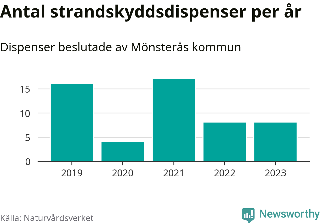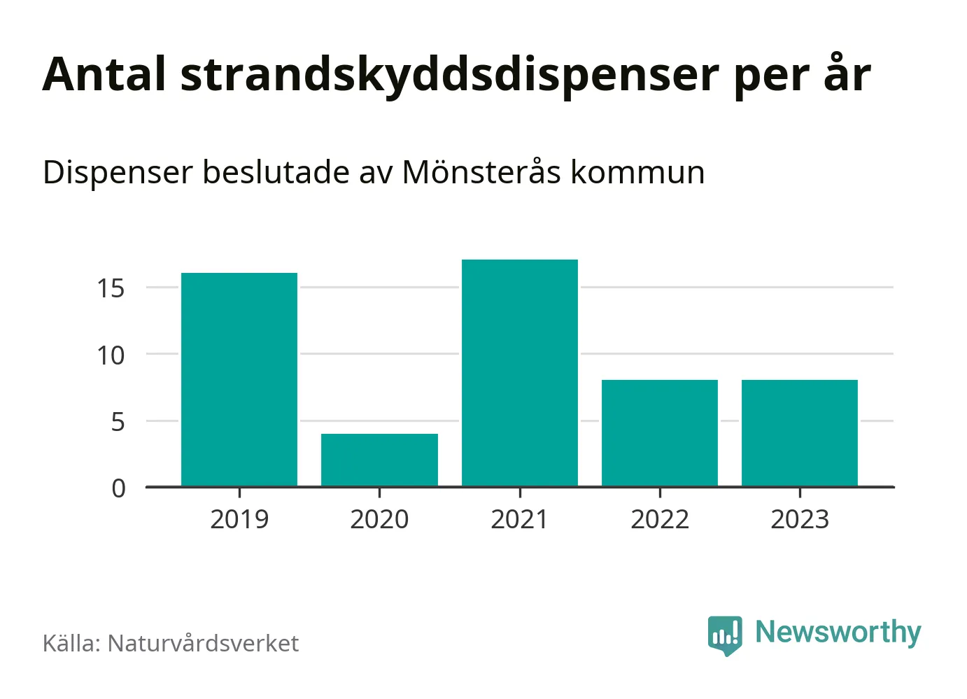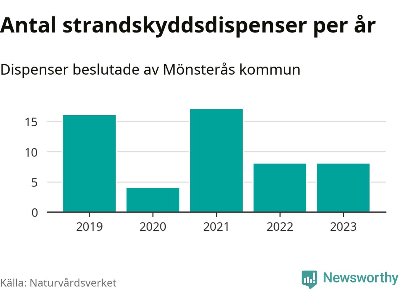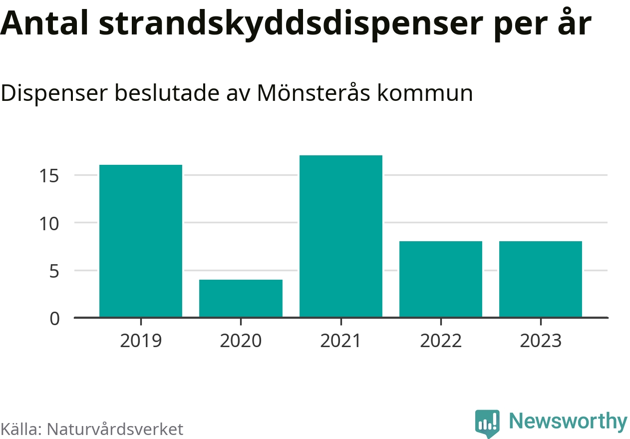 Den som vill bygga nära vatten behöver dispens från strandskyddet, lagstiftningen som ska säkra allmänhetens tillgång till stränderna och bevara livsvillkor för djur och växter. I de flesta fall är det kommunerna som godkänner dispenserna, och under de senaste fem åren har Mönsterås kommun fattat 53 beslut för totalt 67 åtgärder inom strandskyddat område, enligt den sammanställning Naturvårdsverket varje år gör. Det är inte en siffra som sticker ut särskilt jämfört med andra kommuner. Flest dispenser i Kalmar län har godkänts i Västervik – 178 stycken.