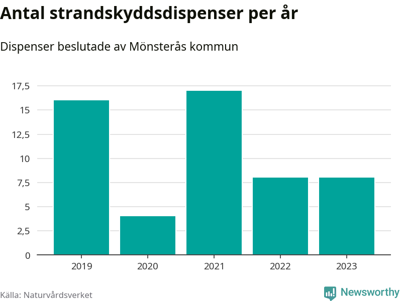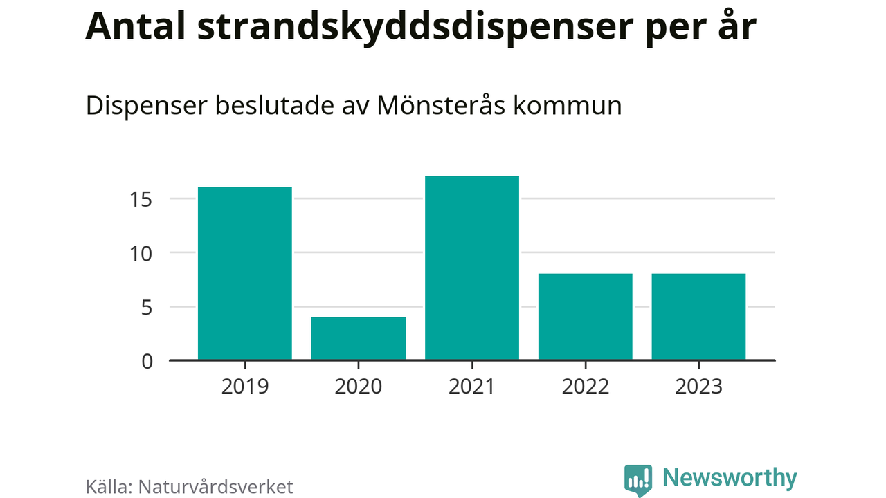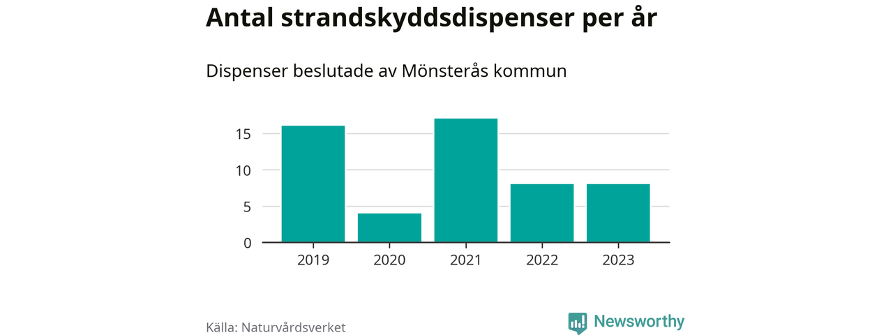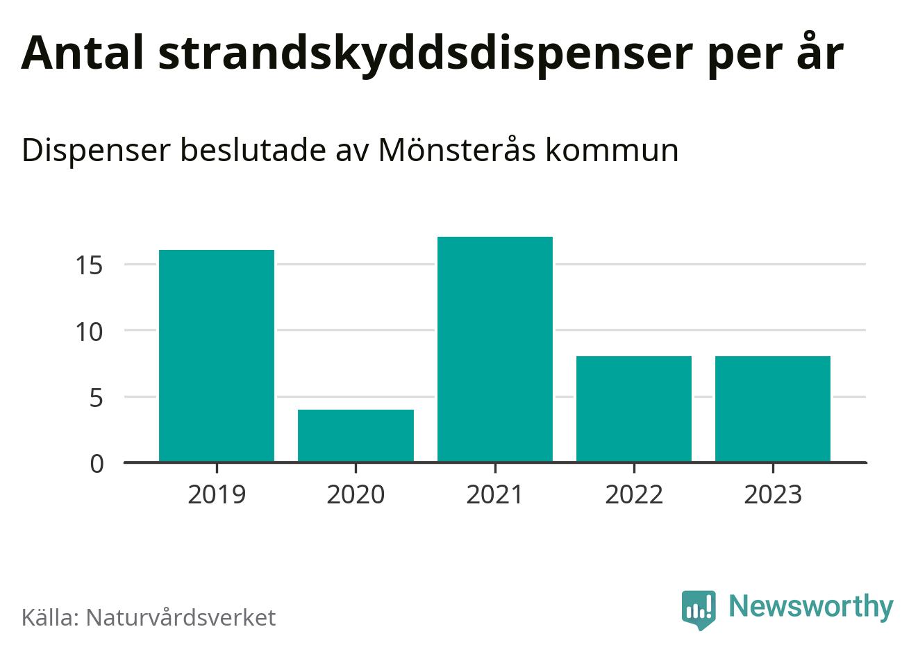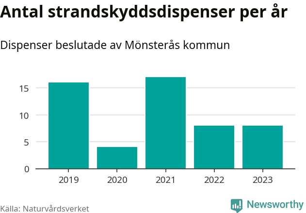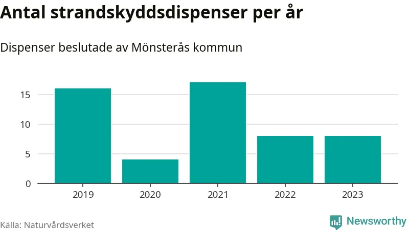 Den som vill bygga nära vatten behöver dispens från strandskyddet, lagstiftningen som ska säkra allmänhetens tillgång till stränderna och bevara livsvillkor för djur och växter. I de flesta fall är det kommunerna som godkänner dispenserna, och under de senaste fem åren har Mönsterås kommun fattat 53 beslut för totalt 67 åtgärder inom strandskyddat område, enligt den sammanställning Naturvårdsverket varje år gör. Det är inte en siffra som sticker ut särskilt jämfört med andra kommuner. Flest dispenser i Kalmar län har godkänts i Västervik – 178 stycken.