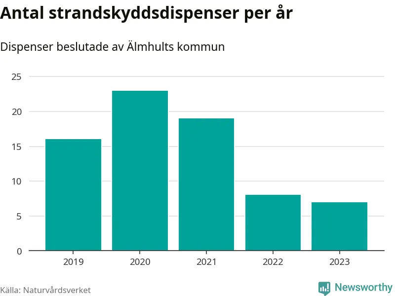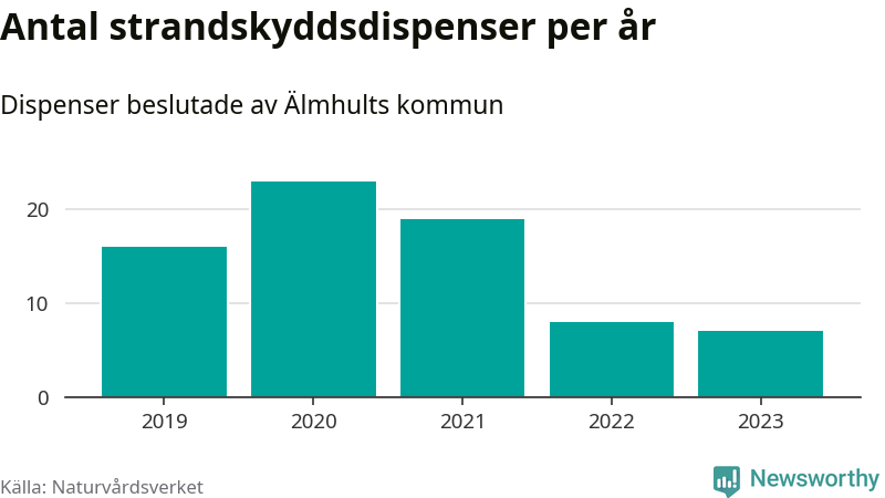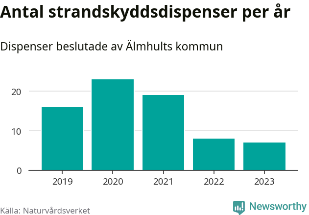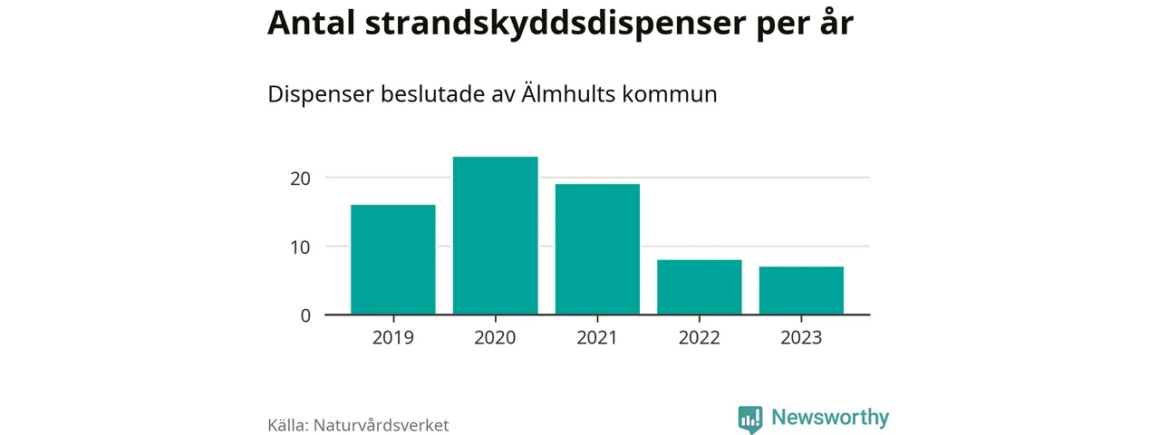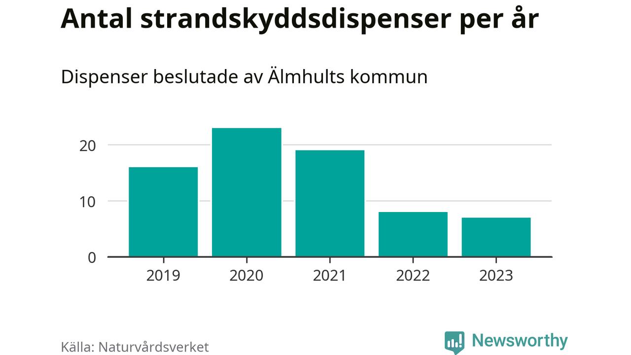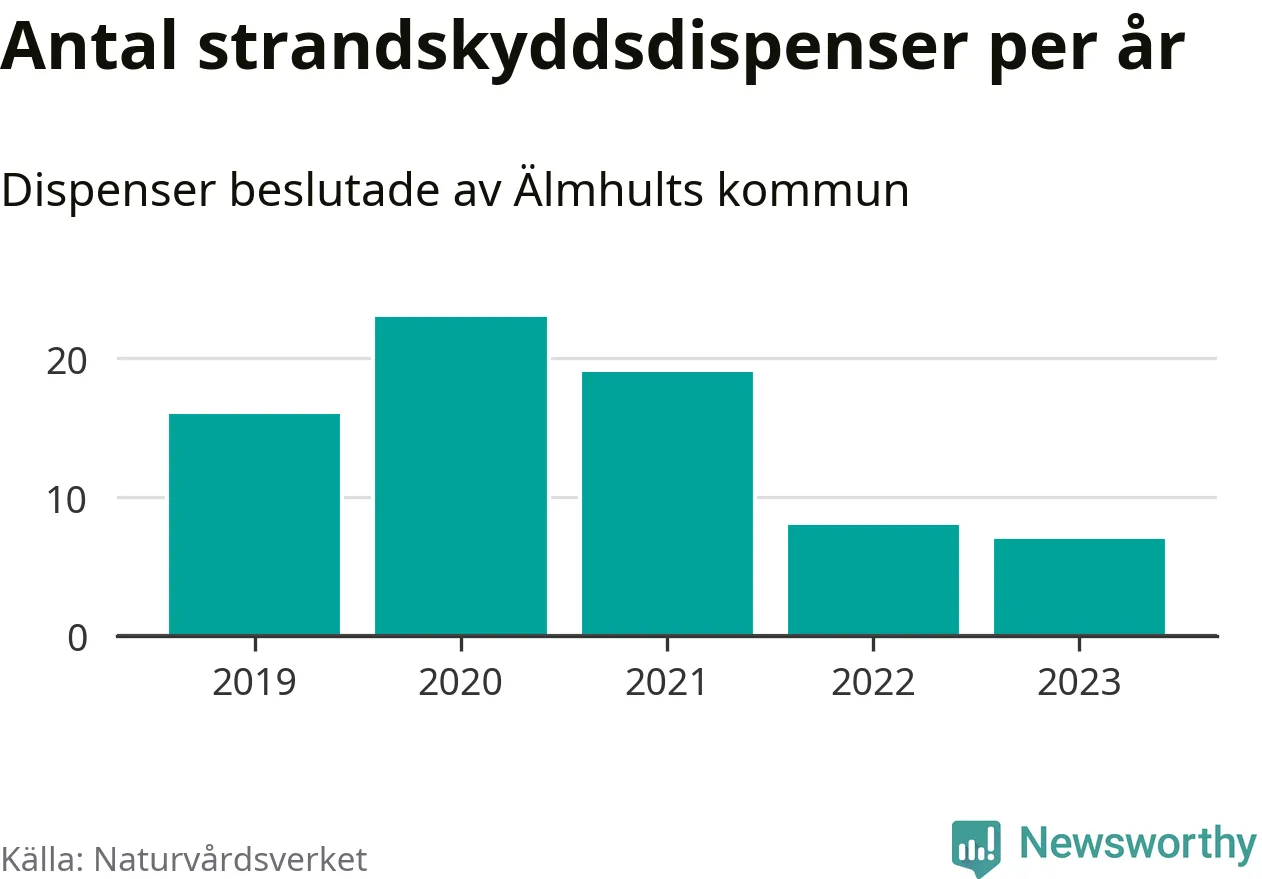 Den som vill bygga nära vatten behöver dispens från strandskyddet, lagstiftningen som ska säkra allmänhetens tillgång till stränderna och bevara livsvillkor för djur och växter. I de flesta fall är det kommunerna som godkänner dispenserna, och under de senaste fem åren har Älmhults kommun fattat 73 beslut för totalt 108 åtgärder inom strandskyddat område, enligt den sammanställning Naturvårdsverket varje år gör. Det är inte en siffra som sticker ut särskilt jämfört med andra kommuner. Flest dispenser i Kronobergs län har godkänts i Växjö – 142 stycken.