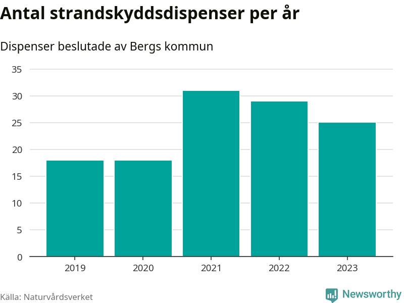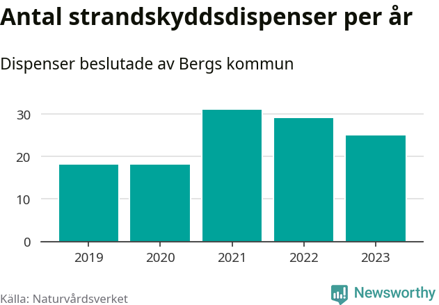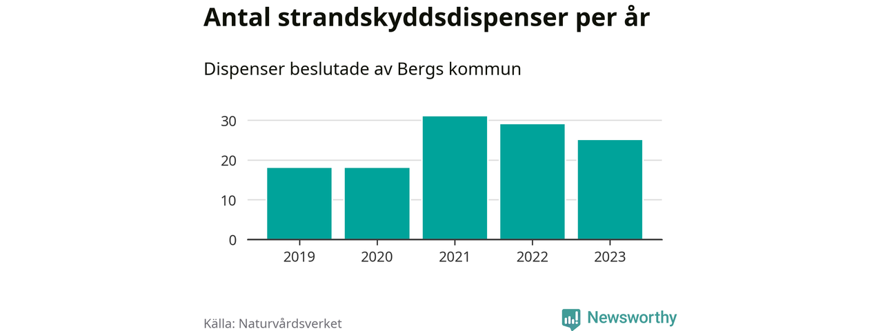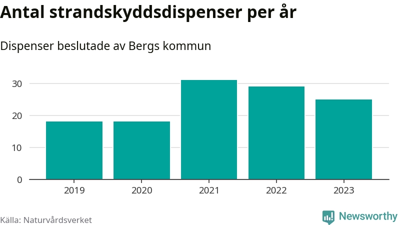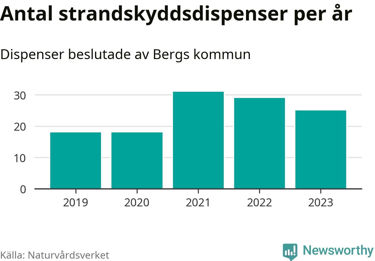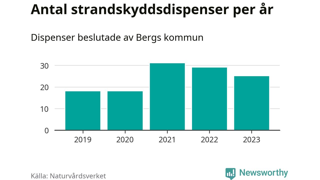 Den som vill bygga nära vatten behöver dispens från strandskyddet, lagstiftningen som ska säkra allmänhetens tillgång till stränderna och bevara livsvillkor för djur och växter. I de flesta fall är det kommunerna som godkänner dispenserna, och under de senaste fem åren har Bergs kommun fattat 121 beslut för totalt 191 åtgärder inom strandskyddat område, enligt den sammanställning Naturvårdsverket varje år gör. Det är fler än i de flesta kommuner i landet. Flest dispenser i Jämtlands län har godkänts i Åre – 150 stycken.