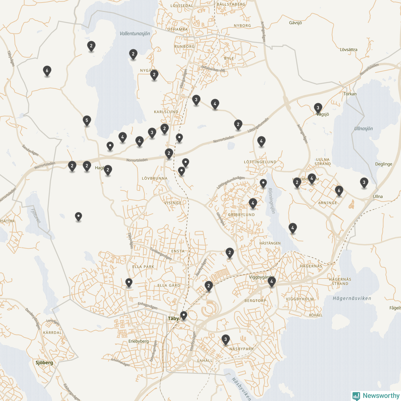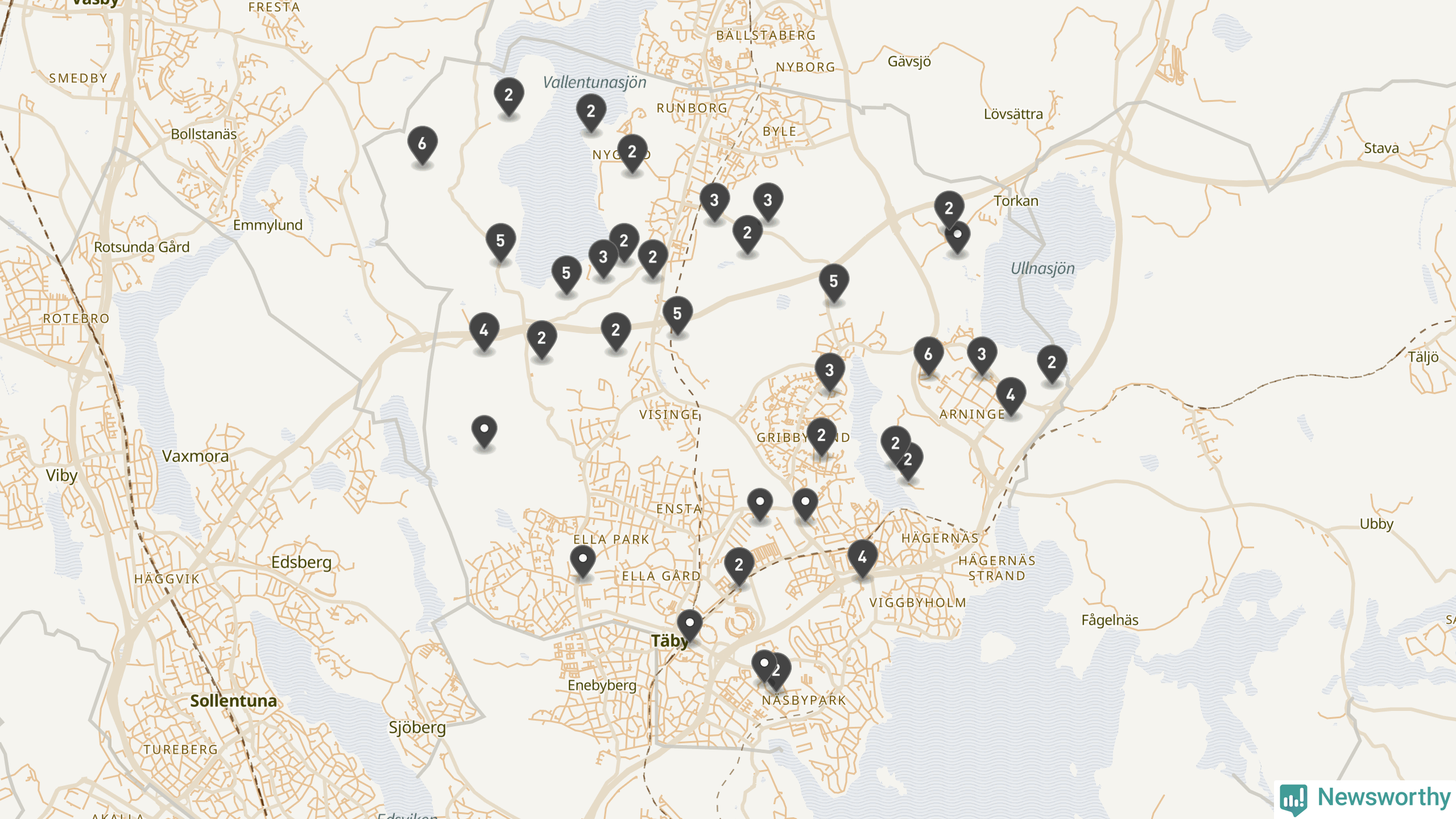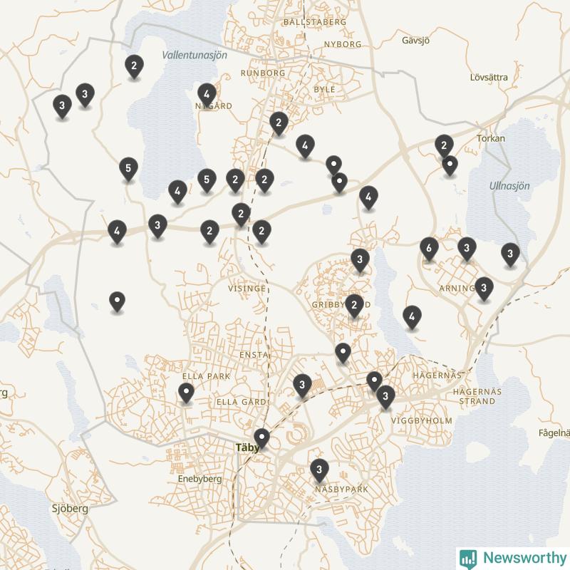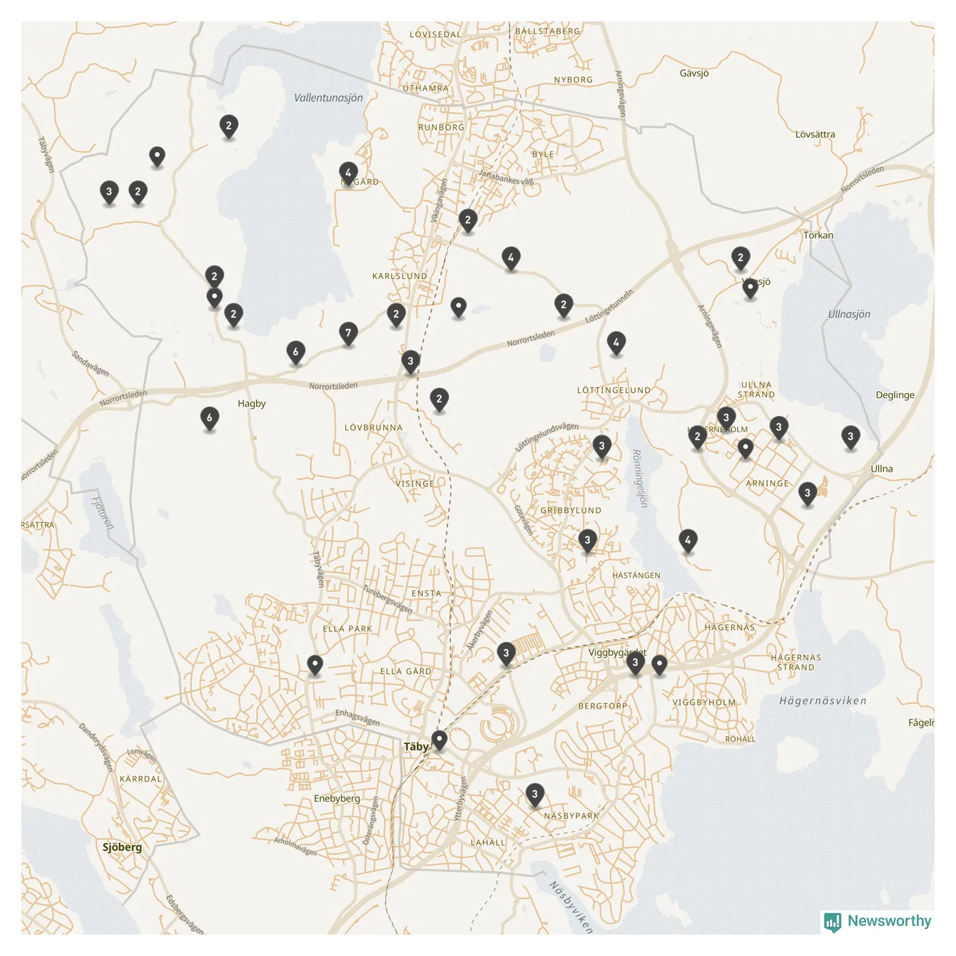 Varje punkt representerar ett gravfält. Om gravfälten är färre än 15 stycken har vi numrerat dem. Om ett eller flera gravfält ligger nära varandra kommer de att grupperas på kartan.