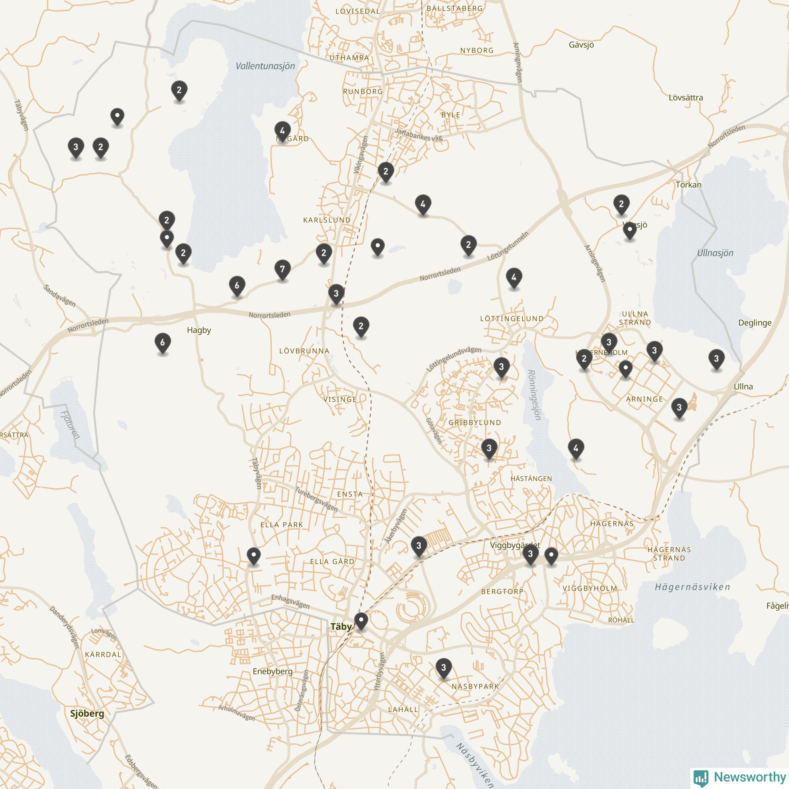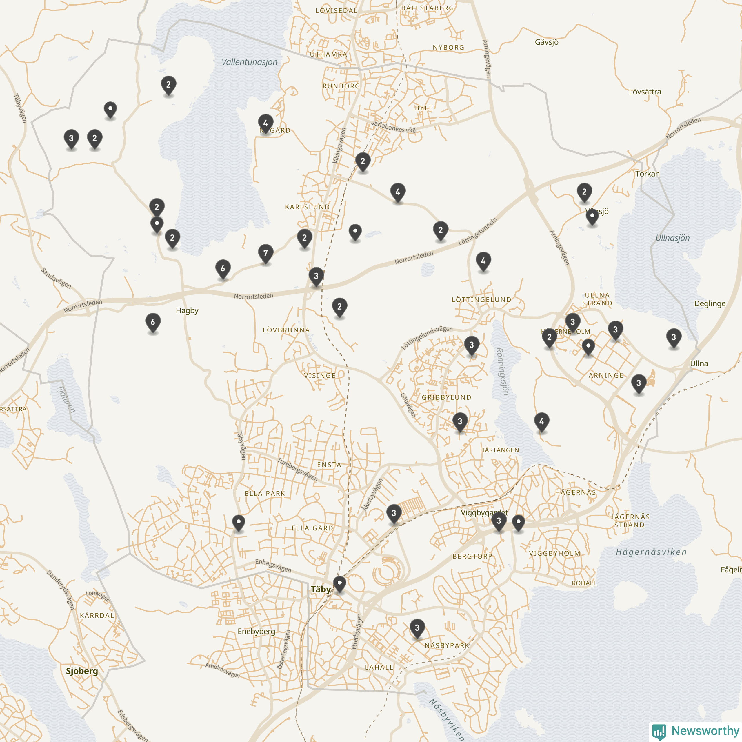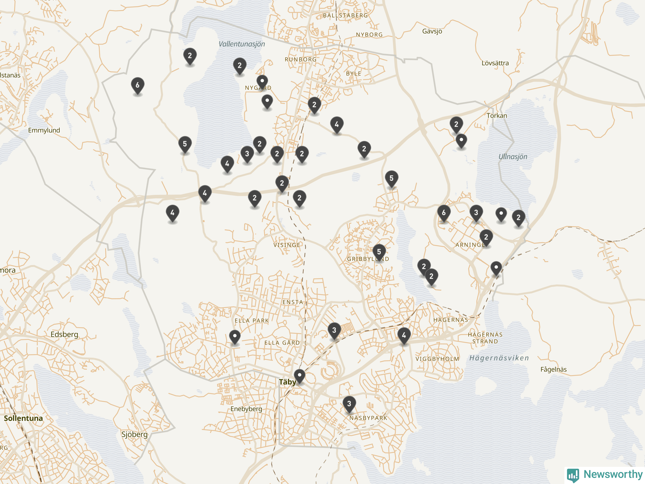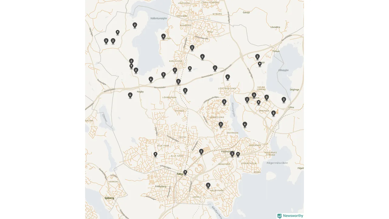 Varje punkt representerar ett gravfält. Om gravfälten är färre än 15 stycken har vi numrerat dem. Om ett eller flera gravfält ligger nära varandra kommer de att grupperas på kartan.