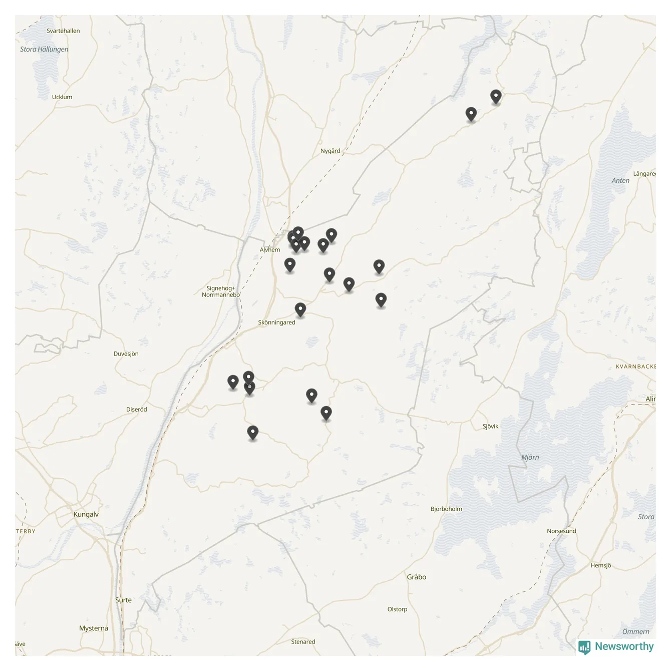 Varje punkt representerar ett gravfält. Om gravfälten är färre än 15 stycken har vi numrerat dem. Om ett eller flera gravfält ligger nära varandra kommer de att grupperas på kartan.