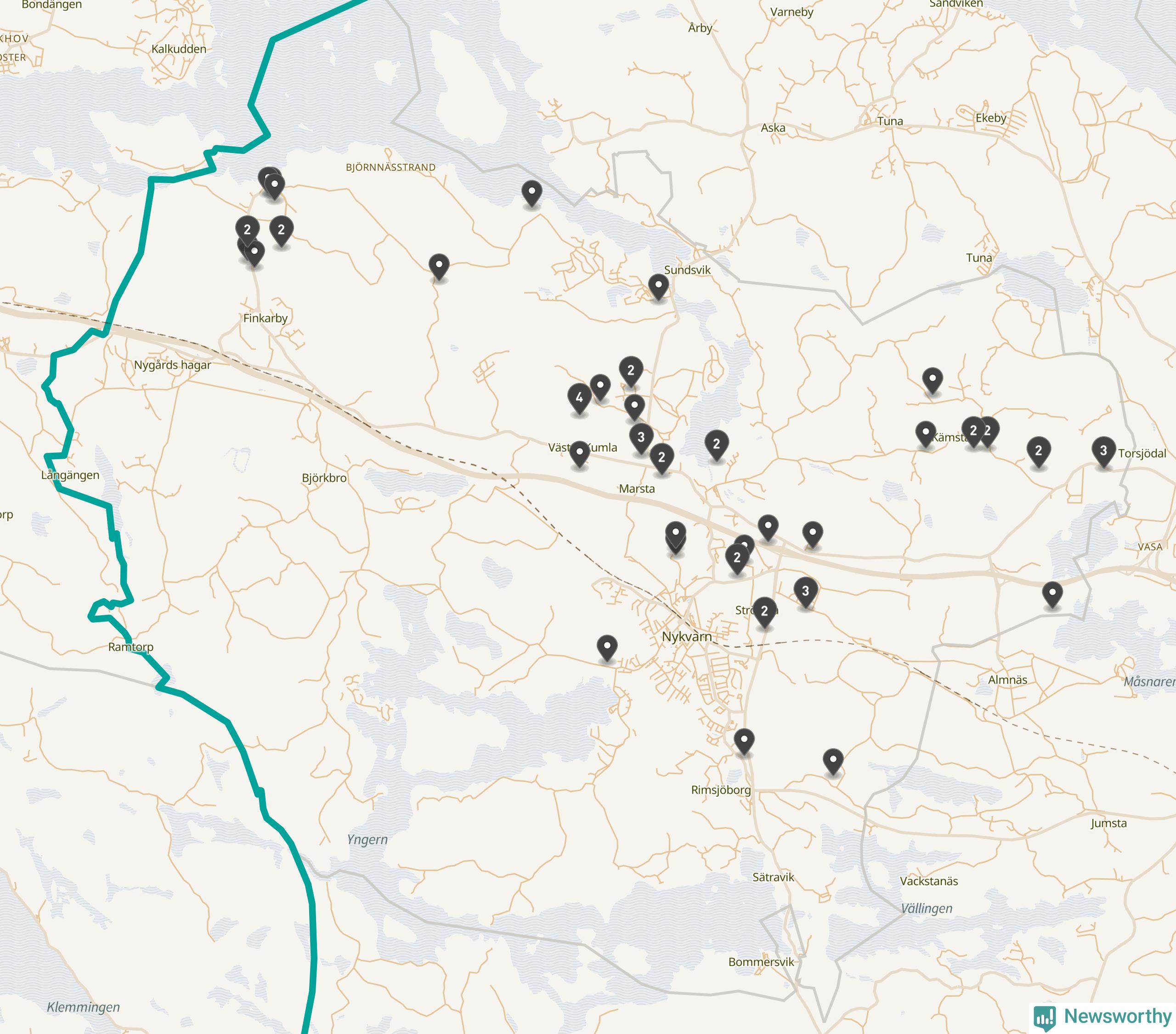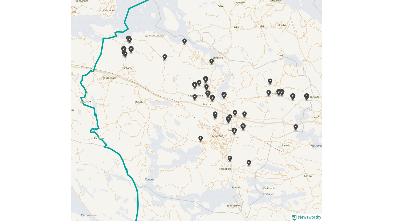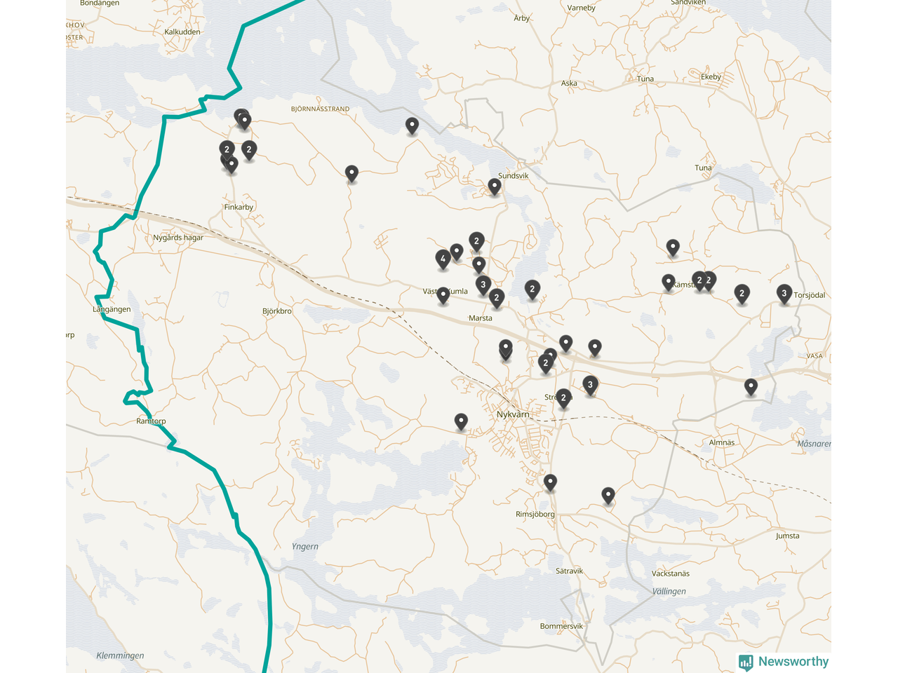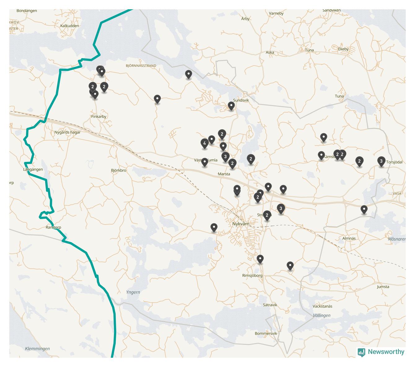 Varje punkt representerar ett gravfält. Om gravfälten är färre än 15 stycken har vi numrerat dem. Om ett eller flera gravfält ligger nära varandra kommer de att grupperas på kartan.