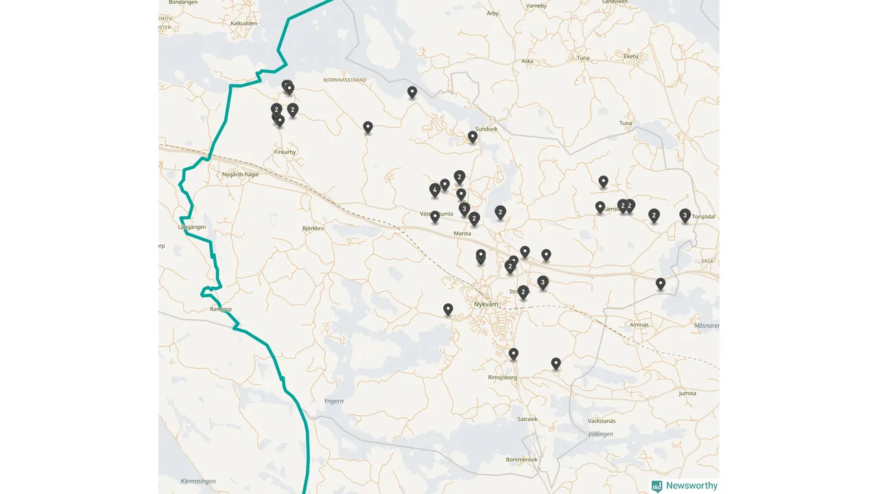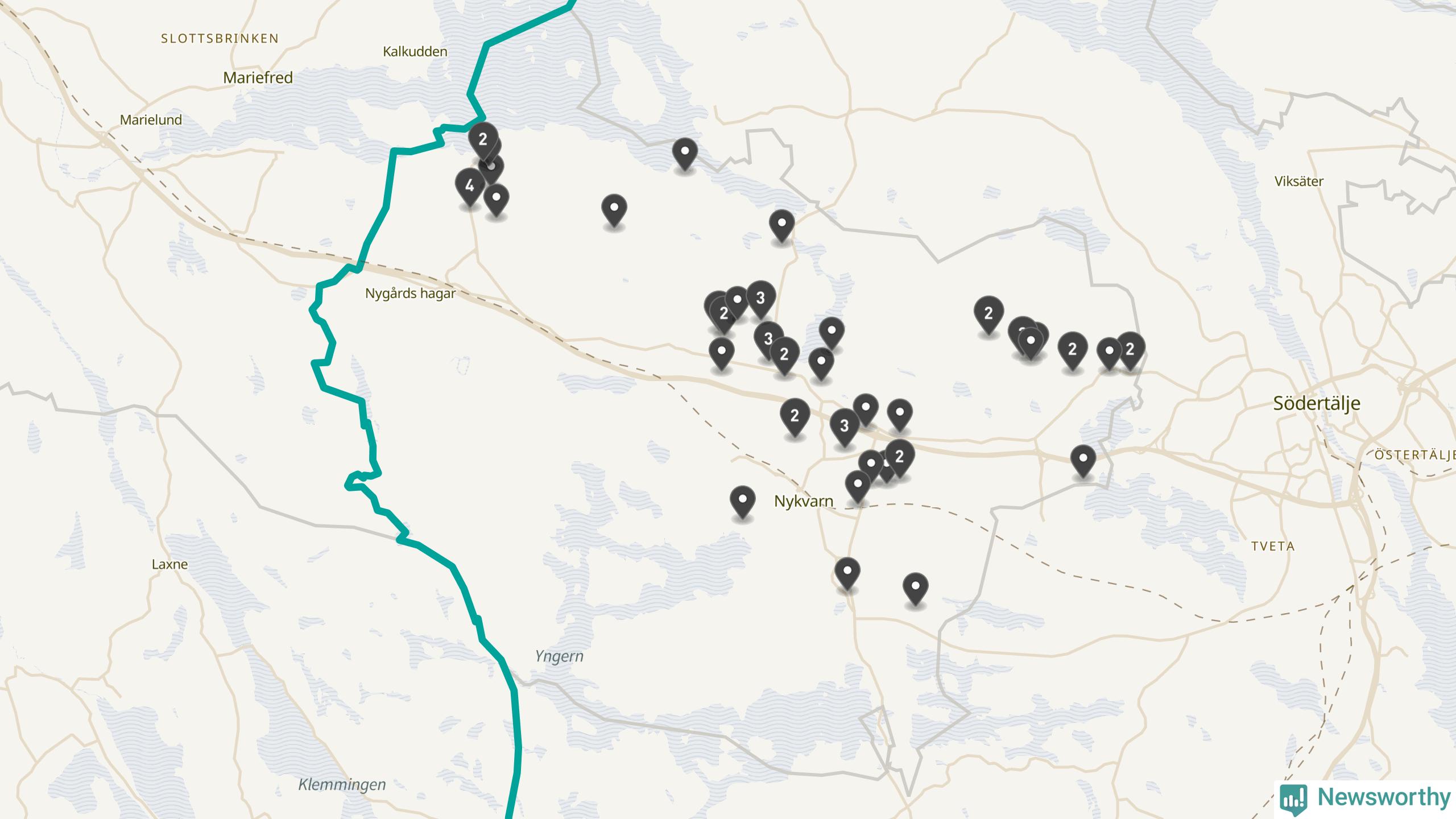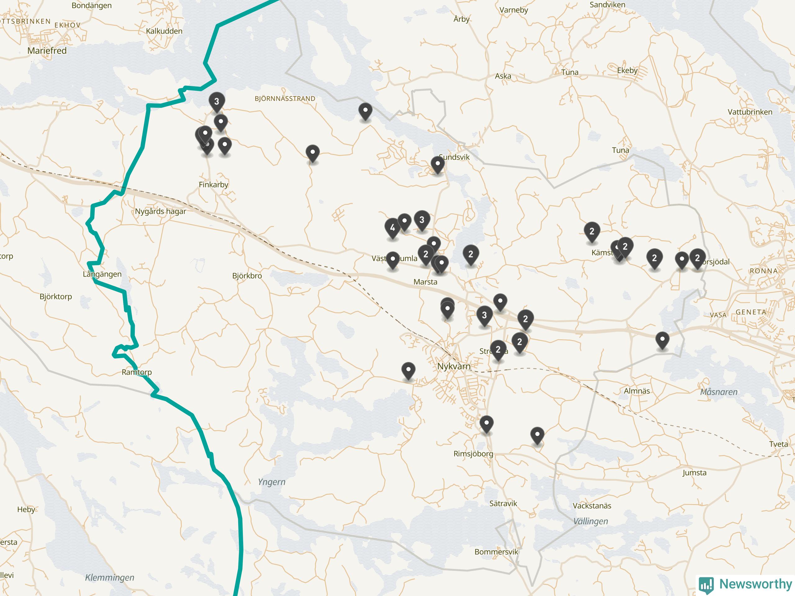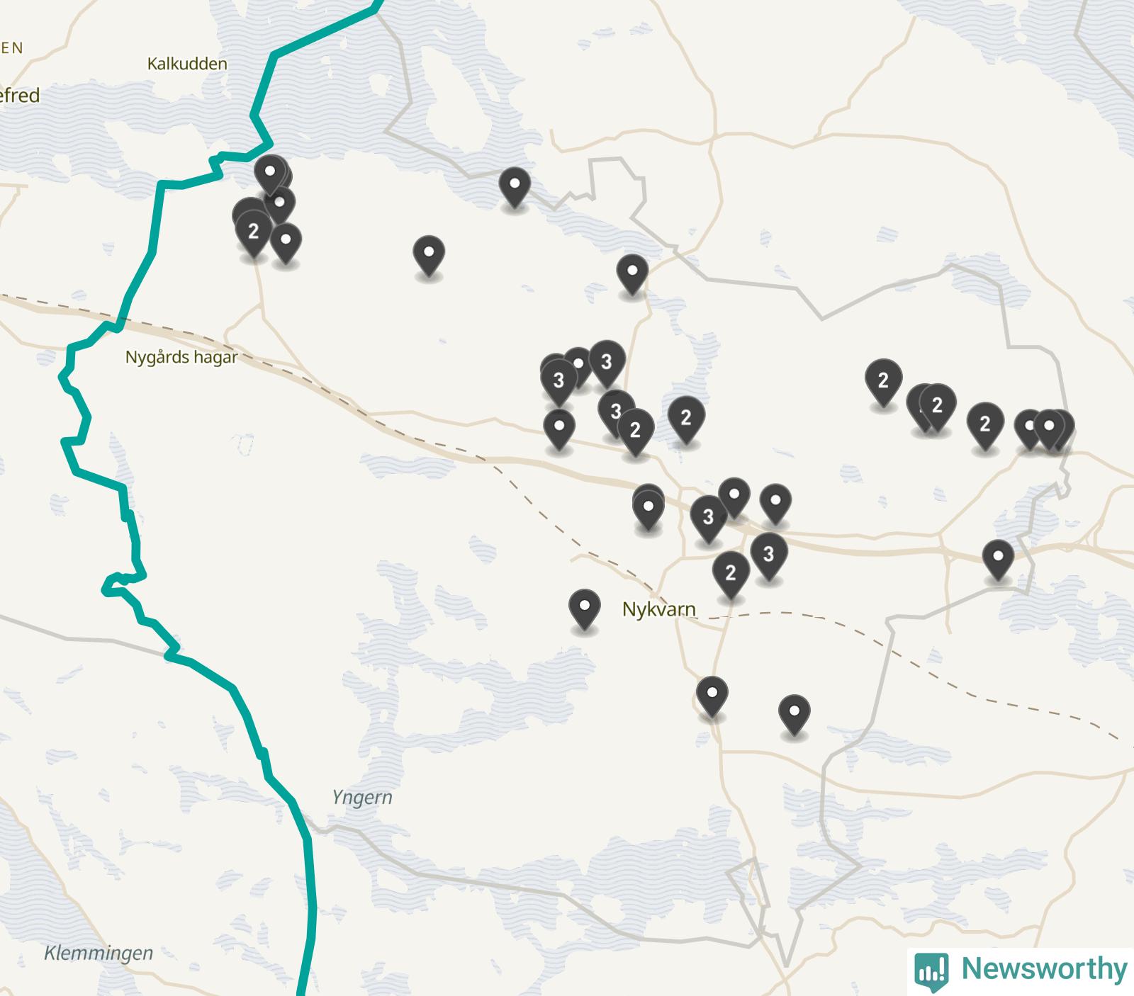 Varje punkt representerar ett gravfält. Om gravfälten är färre än 15 stycken har vi numrerat dem. Om ett eller flera gravfält ligger nära varandra kommer de att grupperas på kartan.