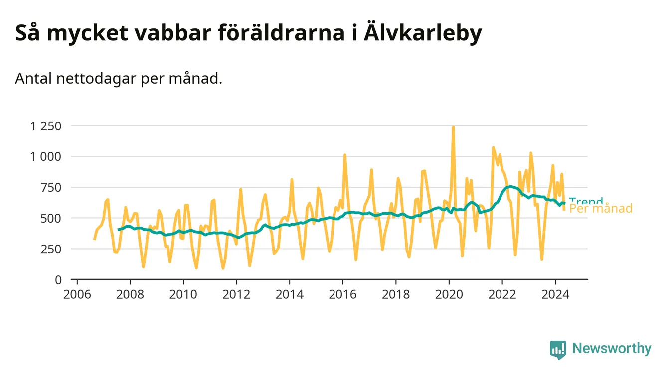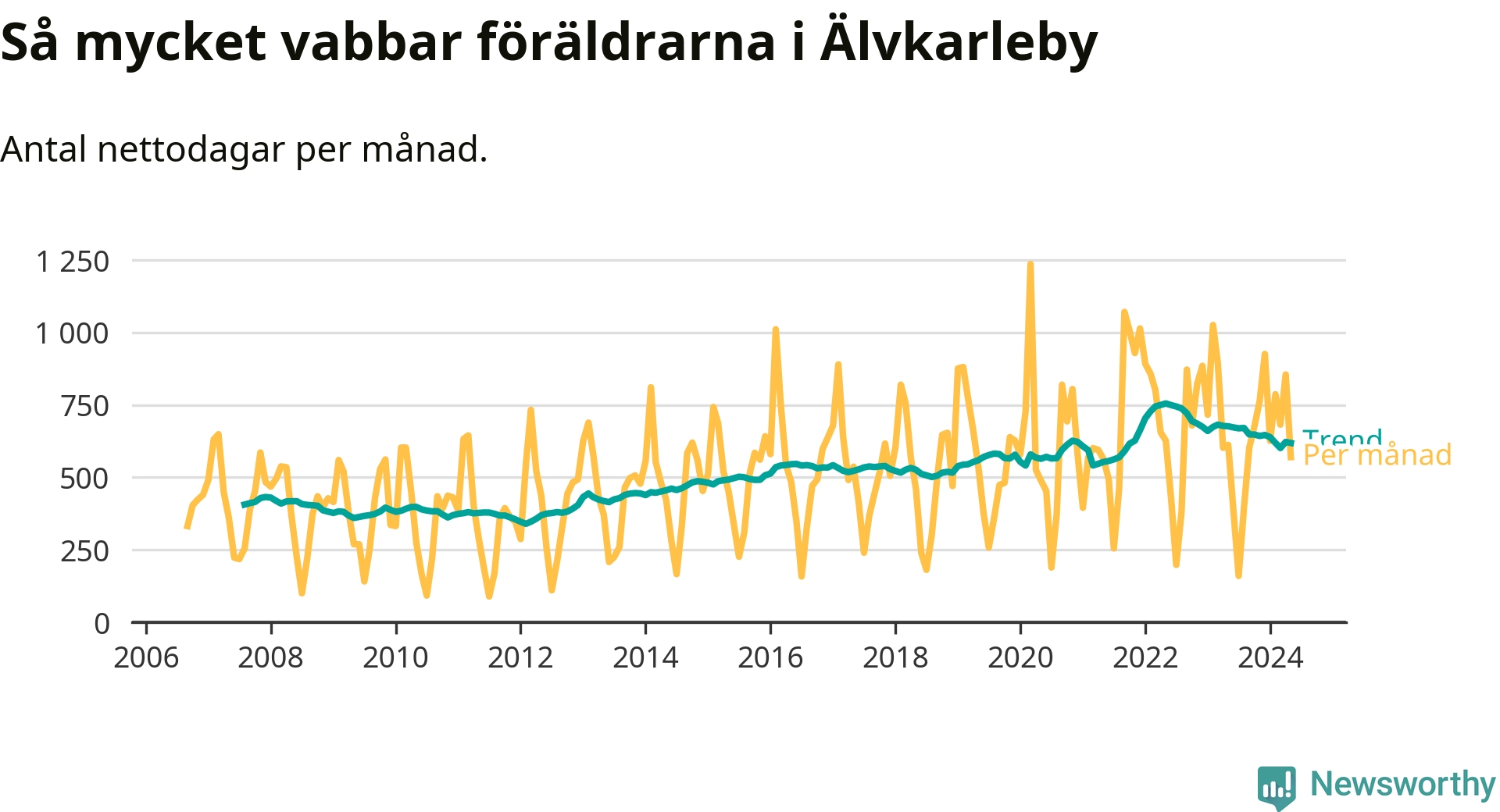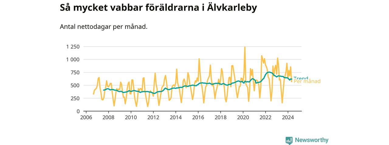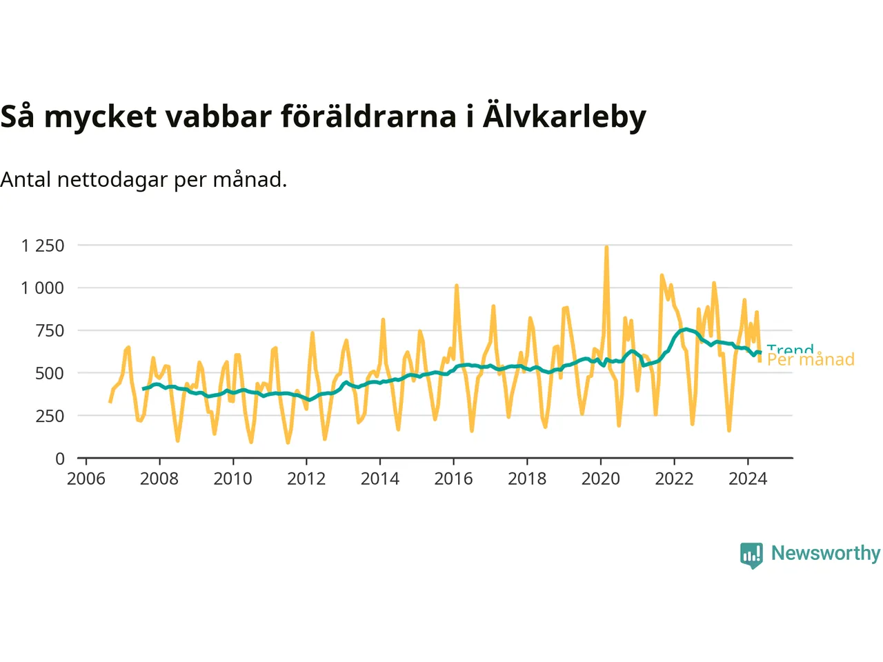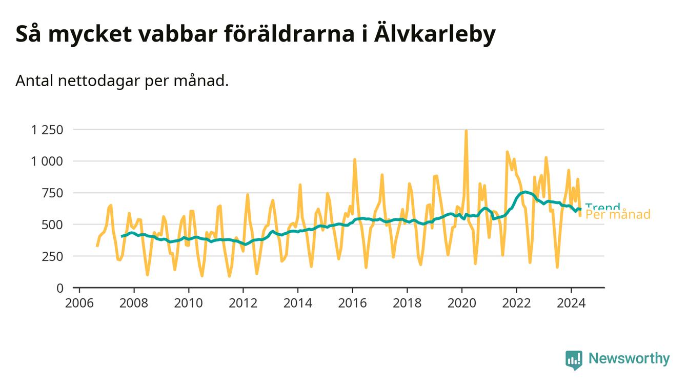 När coronapandemin drog in i mars 2020 peakade antalet vabbdagar både i Älvkarleby kommun och i riket som helhet. Under de senaste två åren har vabbuttaget börjat minska igen.