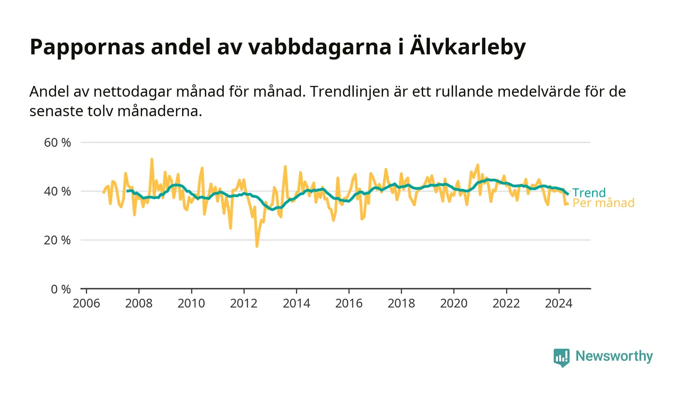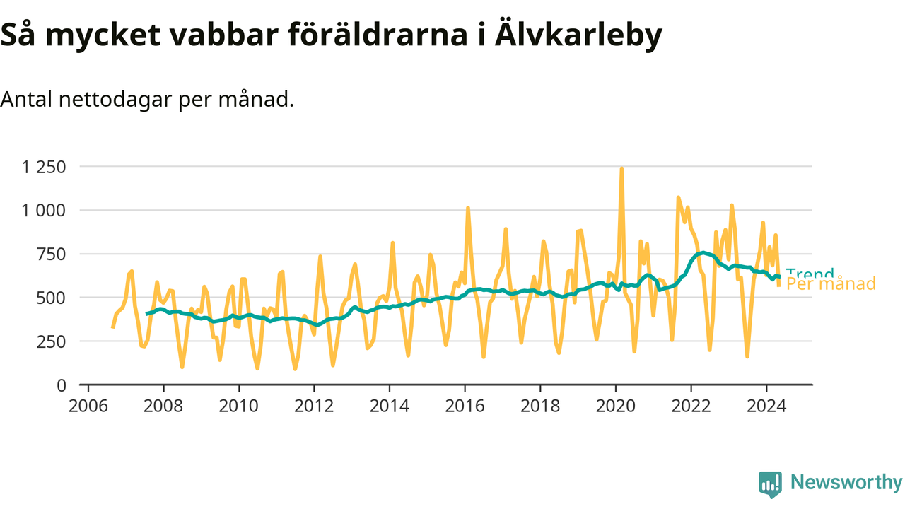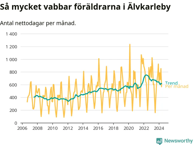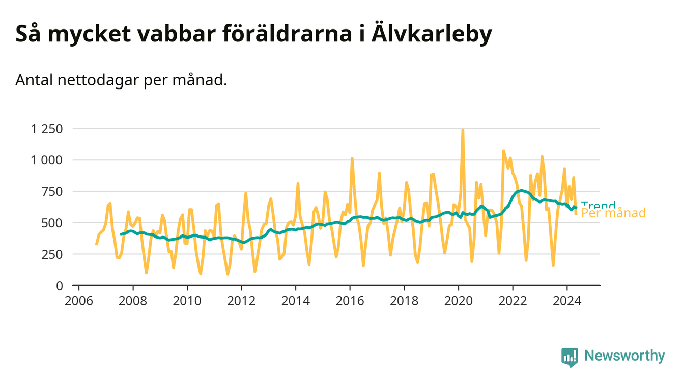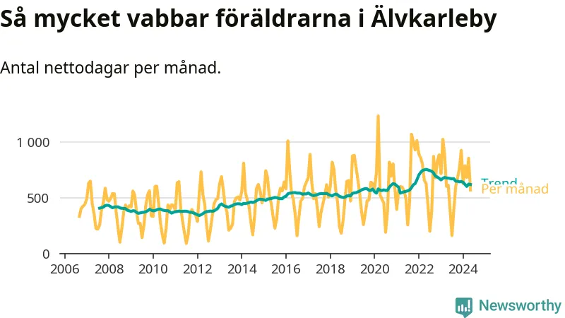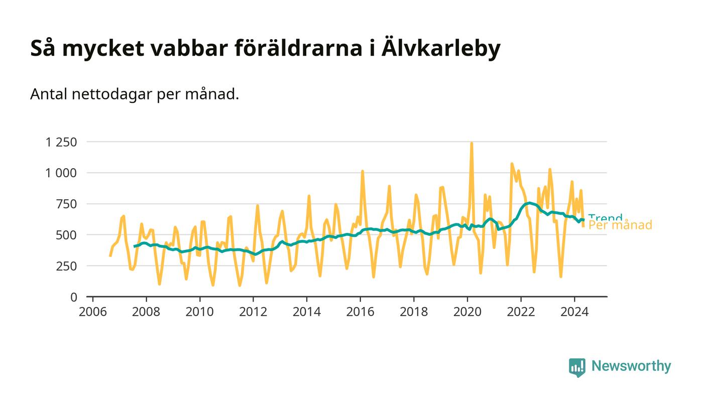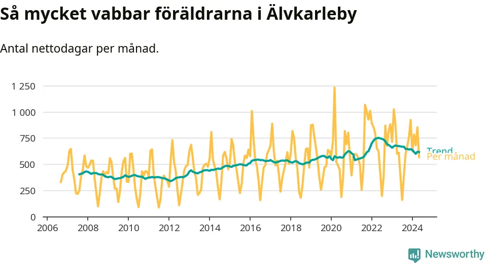 När coronapandemin drog in i mars 2020 peakade antalet vabbdagar både i Älvkarleby kommun och i riket som helhet. Under de senaste två åren har vabbuttaget börjat minska igen.