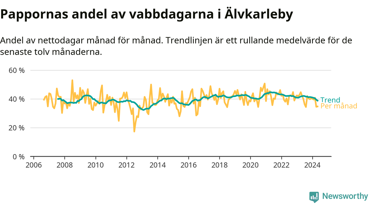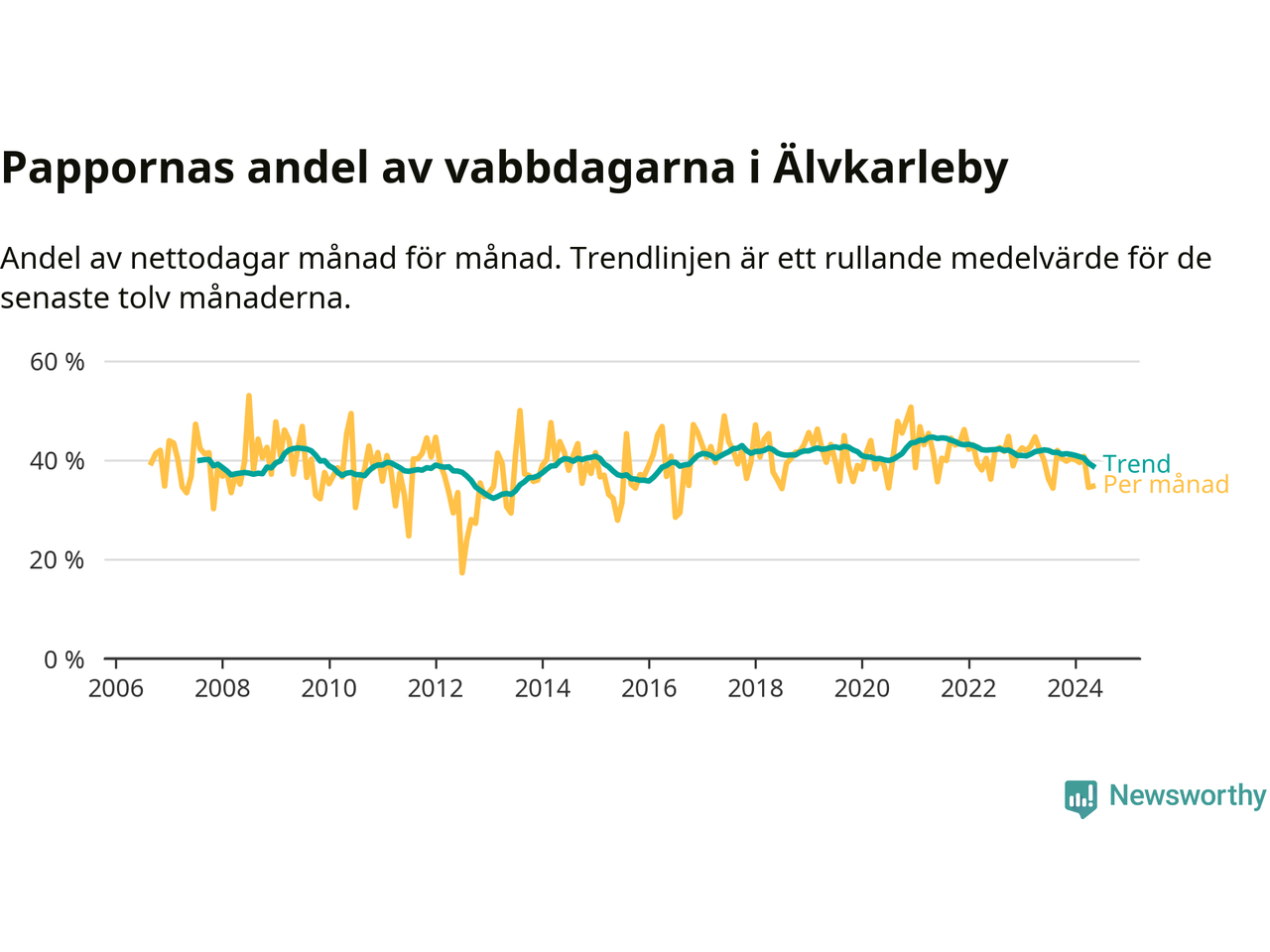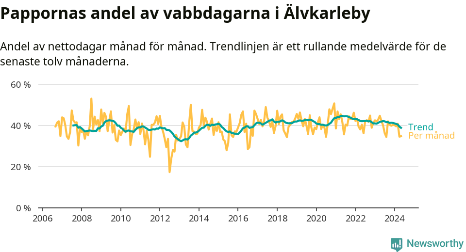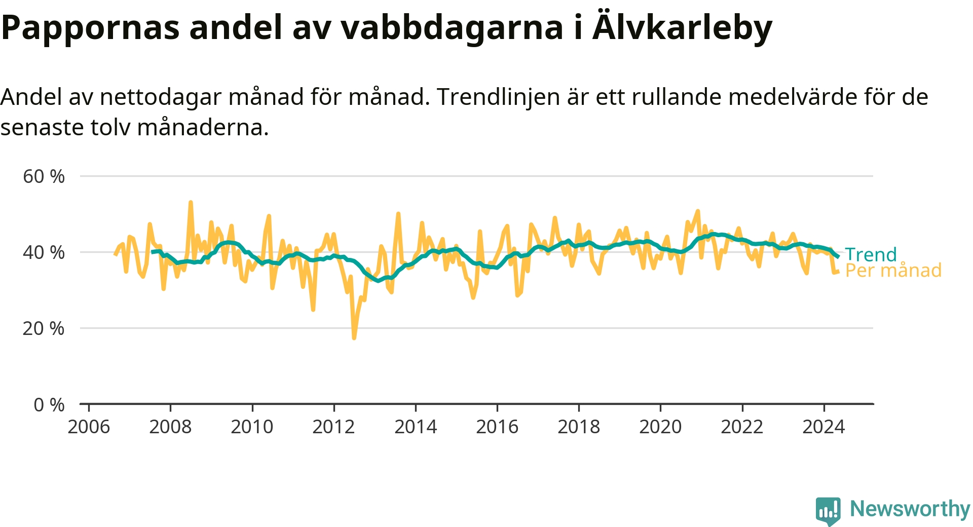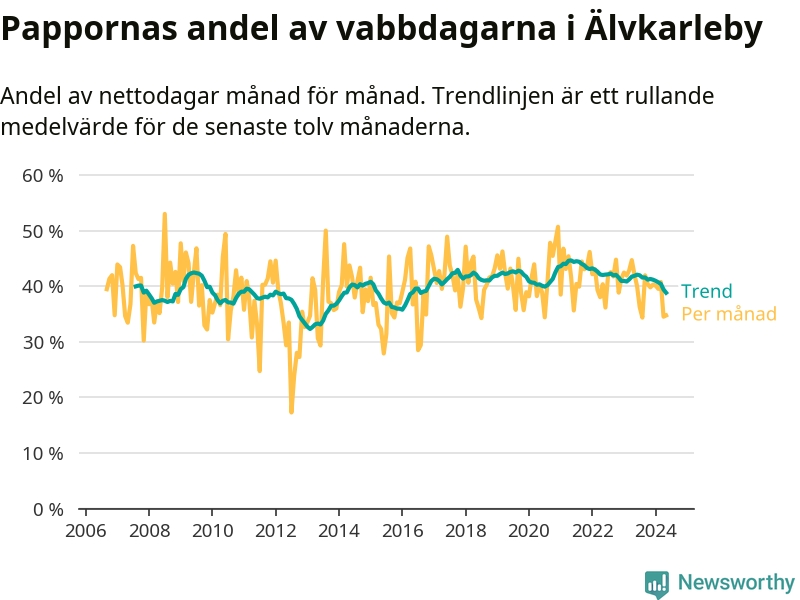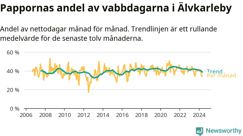 När coronapandemin drog in i mars 2020 peakade antalet vabbdagar både i Älvkarleby kommun och i riket som helhet. Under de senaste två åren har vabbuttaget börjat minska igen.