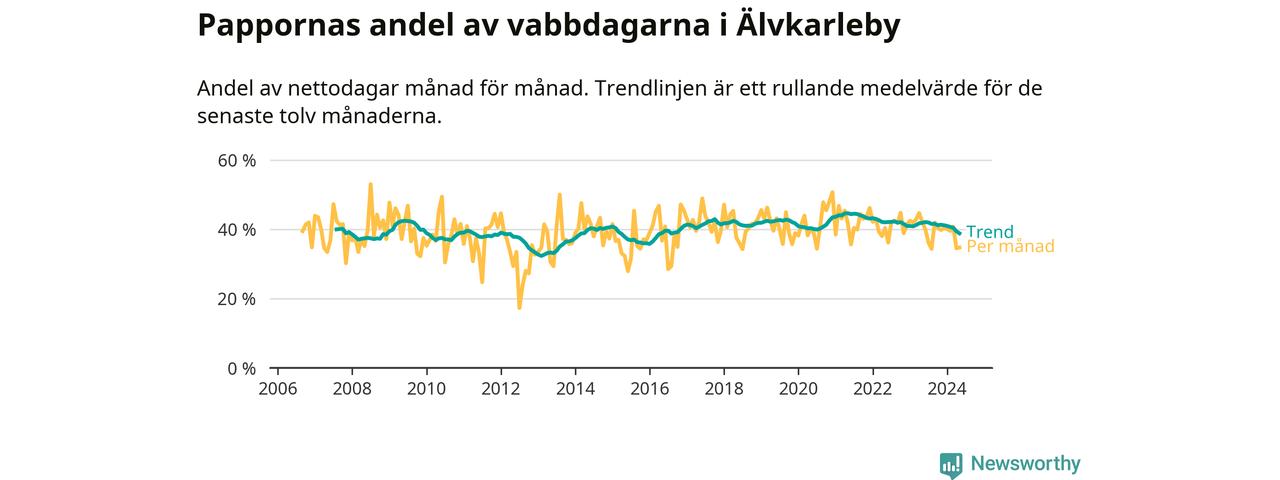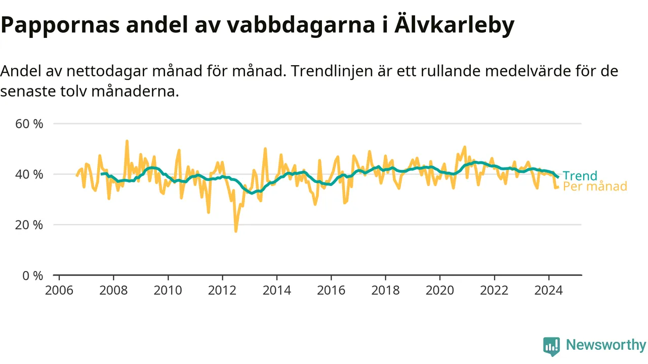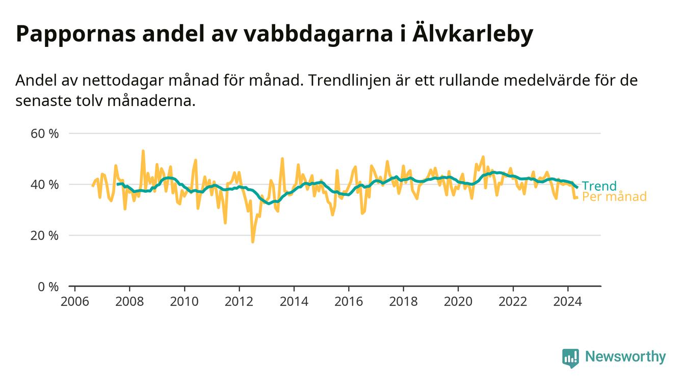 Älvkarleby ligger en bit från ett jämställt uttag. Under de senaste tolv månaderna har männen stått för 39 procent av all vabb i kommunen. Pappornas uttag peakade våren 2021 då kommunens fäder var uppe i 45 procent av vabbdagarna 1.