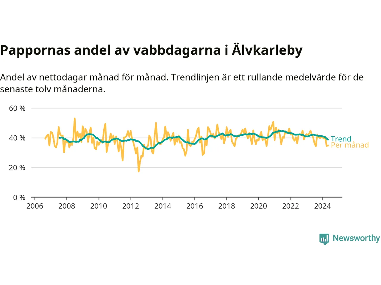 Pappor i Älvkarleby vabbar ungefär som rikssnittet och som andra män i Uppsala län. Andelen är näst högst i länet. Skillnaderna inom landet är stora. Ingen kommun i landet når 50–50-fördelning. I Markaryd har papporna tagit ut 45 procent av alla vabbdagar under det senaste året. Det är mest i landet.