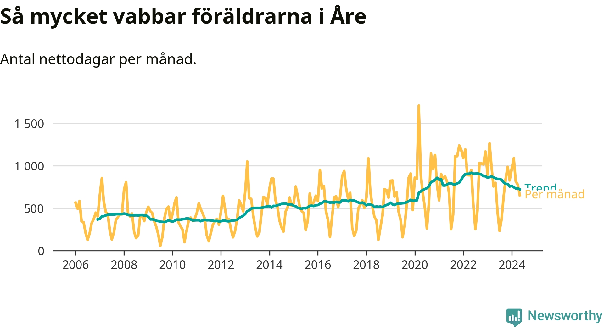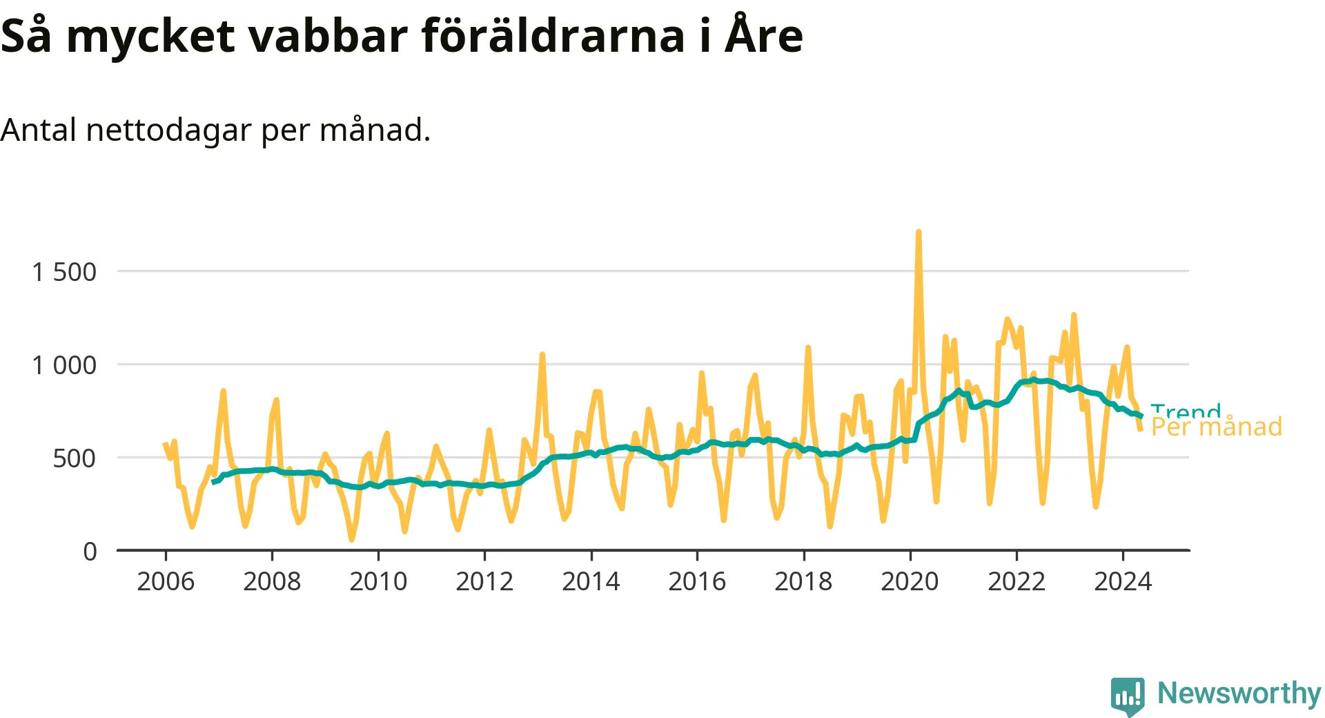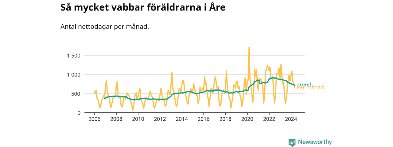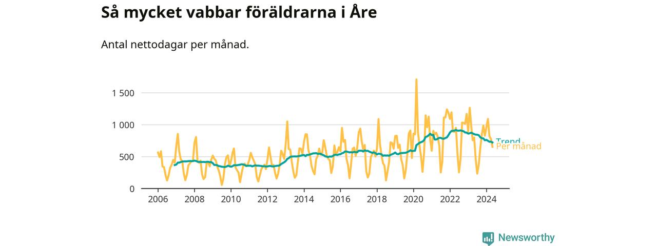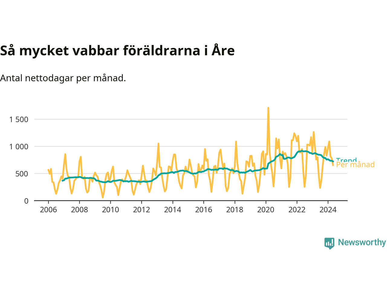 När coronapandemin drog in i mars 2020 peakade antalet vabbdagar både i Åre kommun och i riket som helhet. Under de senaste två åren har vabbuttaget börjat minska igen.