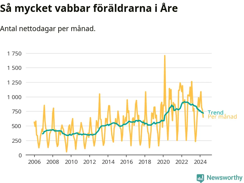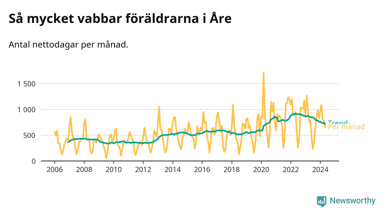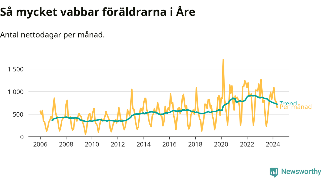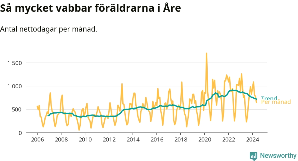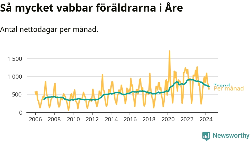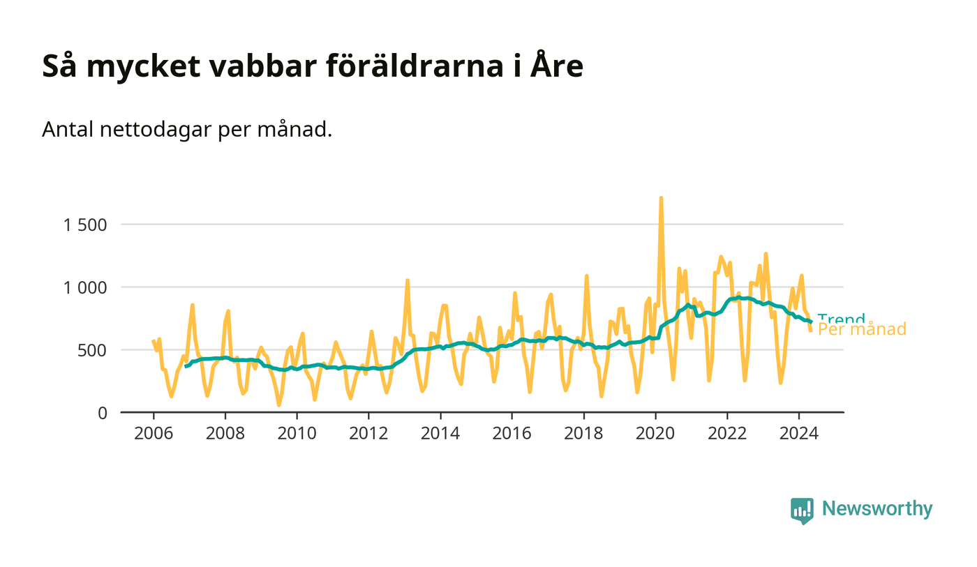 När coronapandemin drog in i mars 2020 peakade antalet vabbdagar både i Åre kommun och i riket som helhet. Under de senaste två åren har vabbuttaget börjat minska igen.