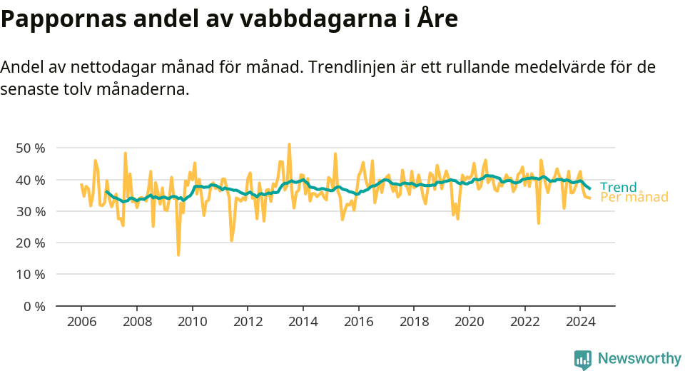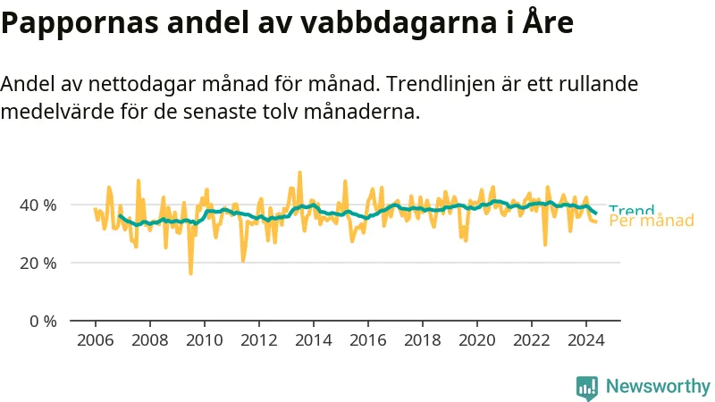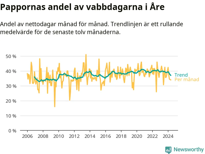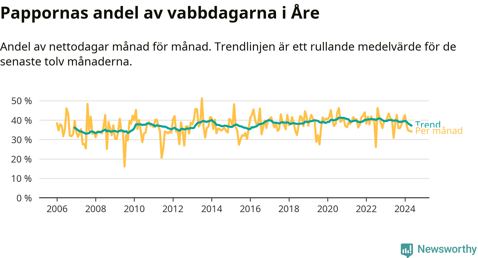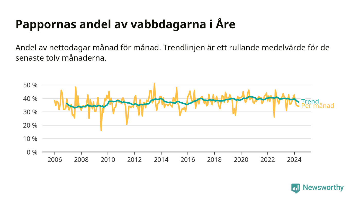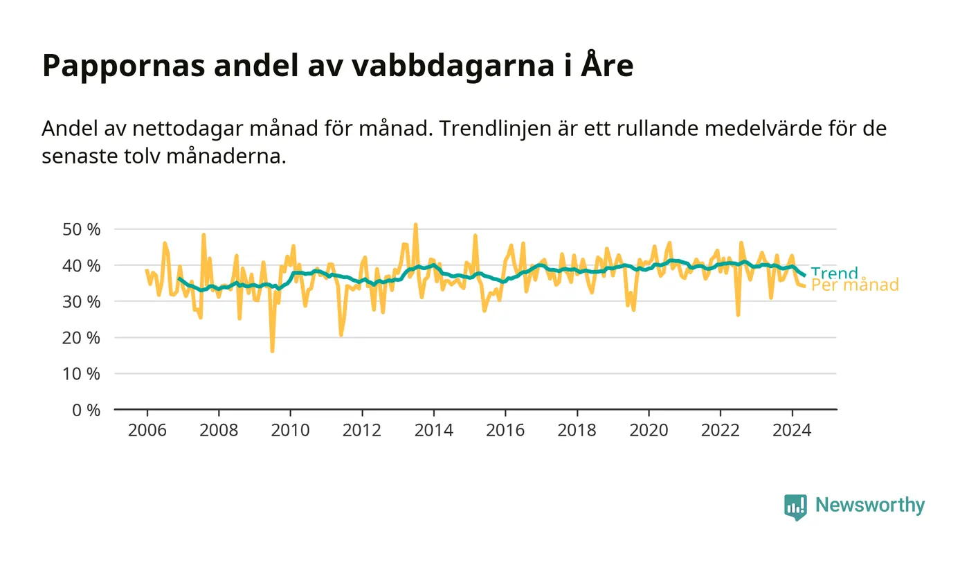 När coronapandemin drog in i mars 2020 peakade antalet vabbdagar både i Åre kommun och i riket som helhet. Under de senaste två åren har vabbuttaget börjat minska igen.