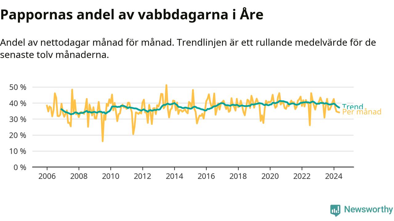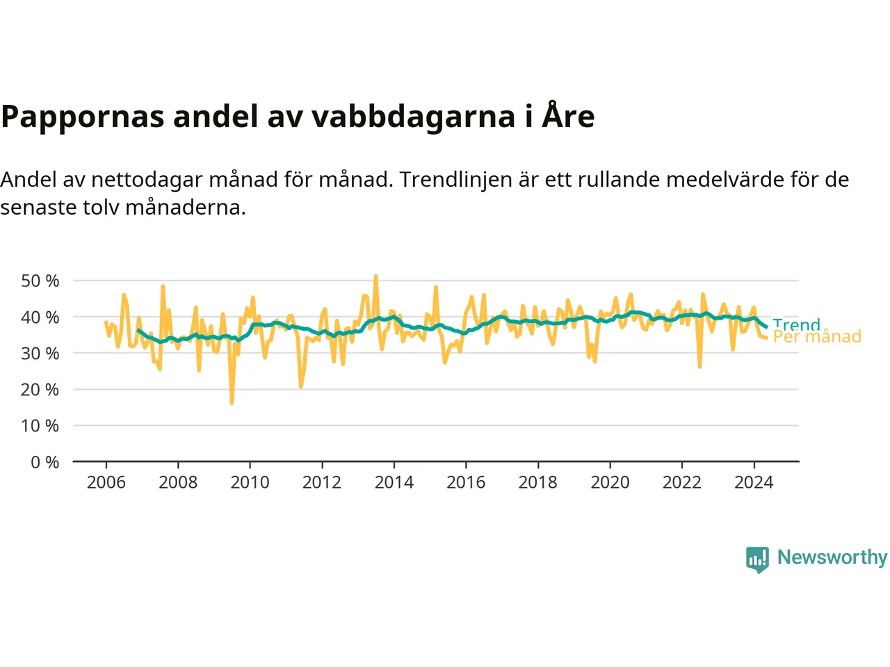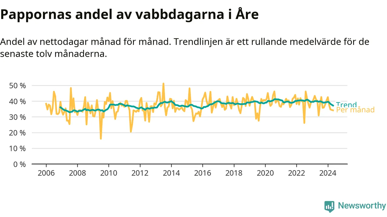 Pappor i Åre vabbar ungefär som rikssnittet och som andra män i Jämtlands län. Skillnaderna inom landet är stora. Ingen kommun i landet når 50–50-fördelning. I Markaryd har papporna tagit ut 45 procent av alla vabbdagar under det senaste året. Det är mest i landet.