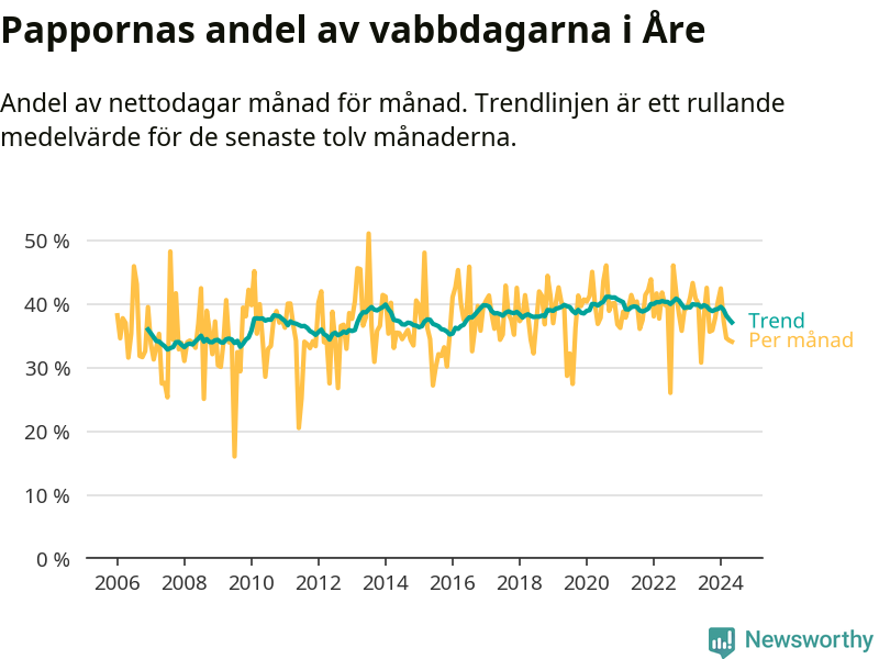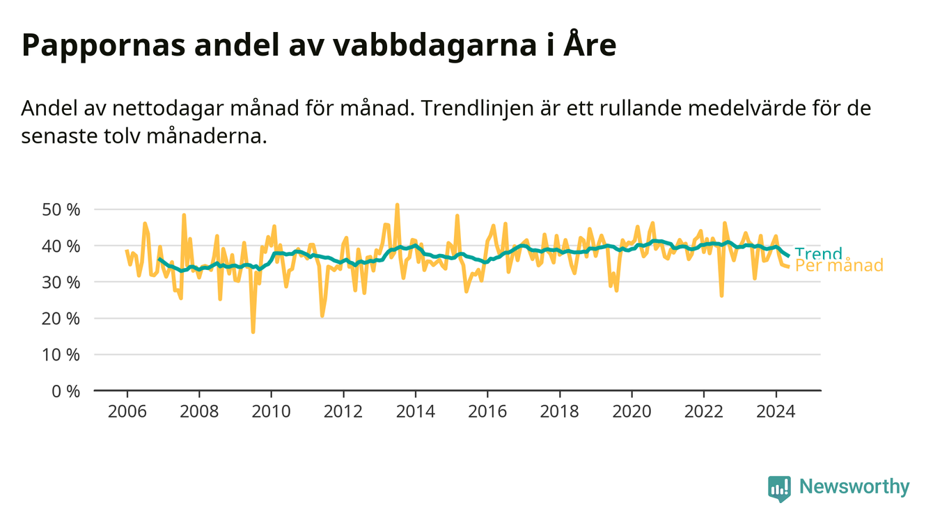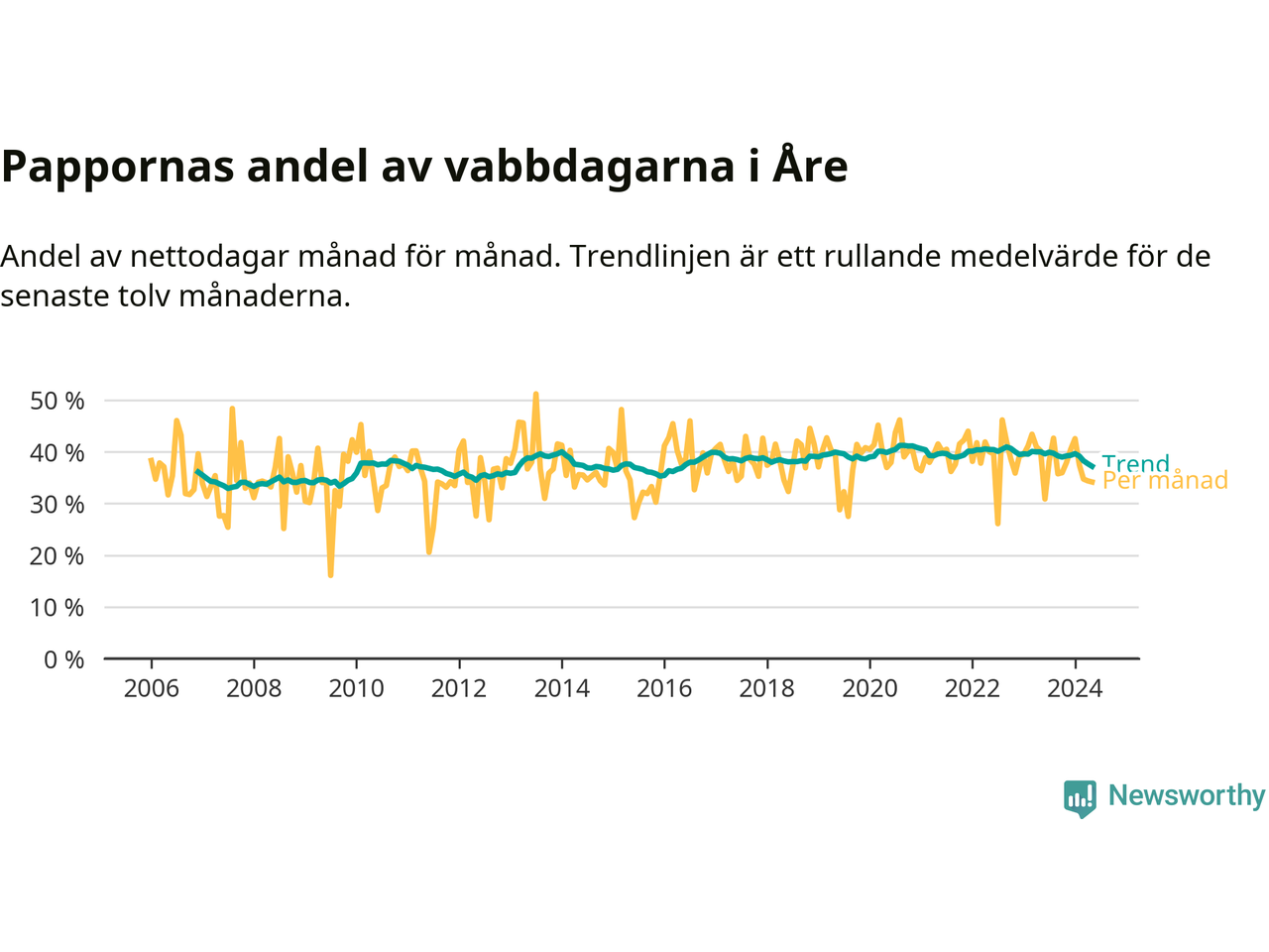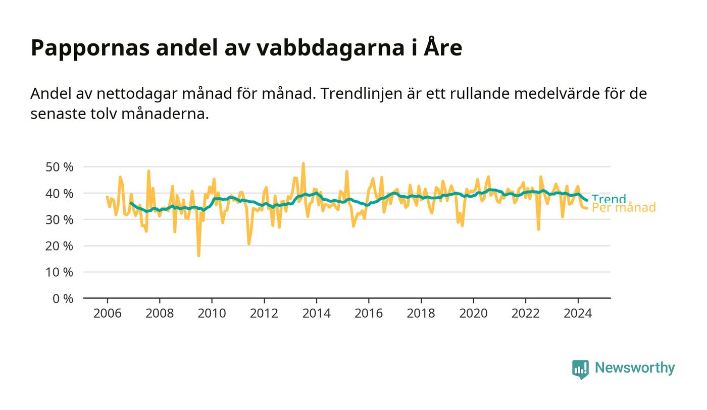 Pappor i Åre vabbar ungefär som rikssnittet och som andra män i Jämtlands län. Skillnaderna inom landet är stora. Ingen kommun i landet når 50–50-fördelning. I Markaryd har papporna tagit ut 45 procent av alla vabbdagar under det senaste året. Det är mest i landet.