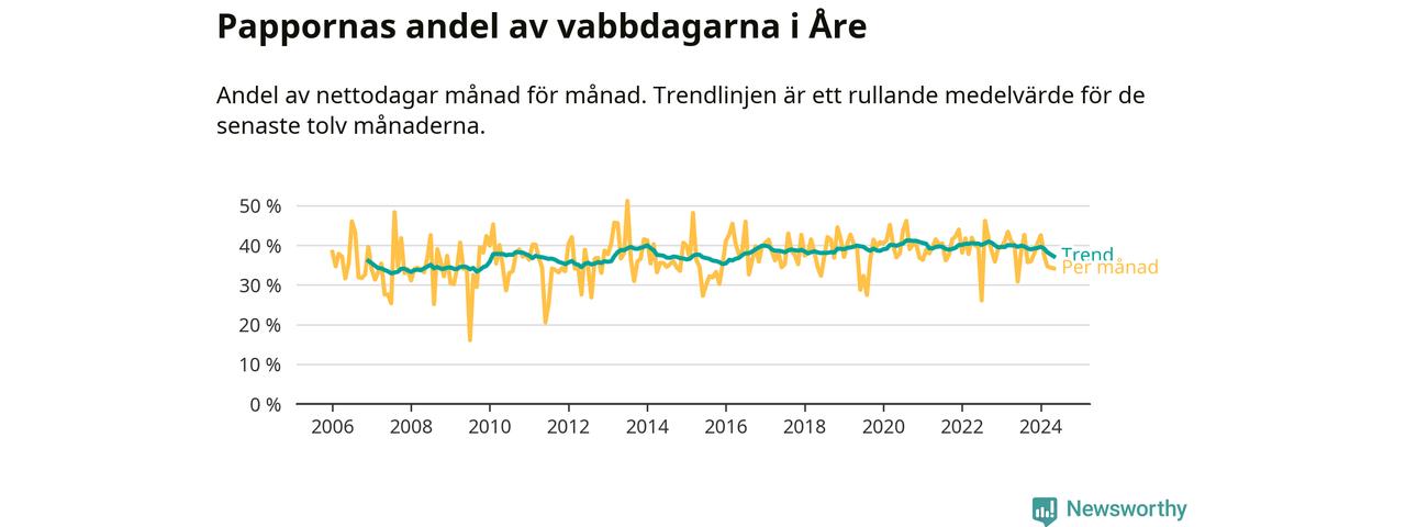 Åre ligger en bit från ett jämställt uttag. Under de senaste tolv månaderna har männen stått för 37 procent av all vabb i kommunen. Pappornas uttag peakade hösten 2020 då kommunens fäder var uppe i 41 procent av vabbdagarna 1.