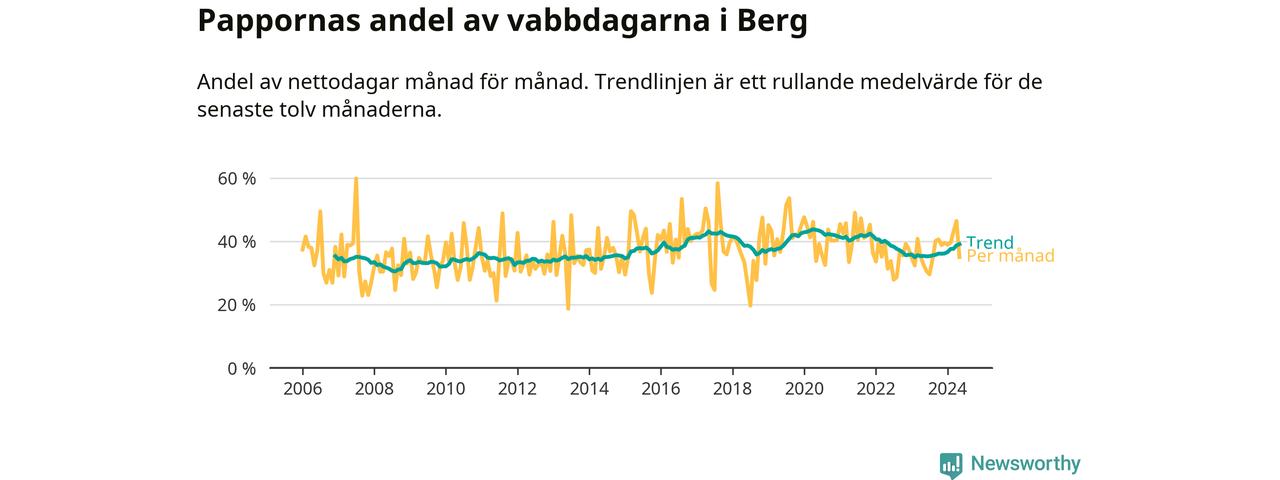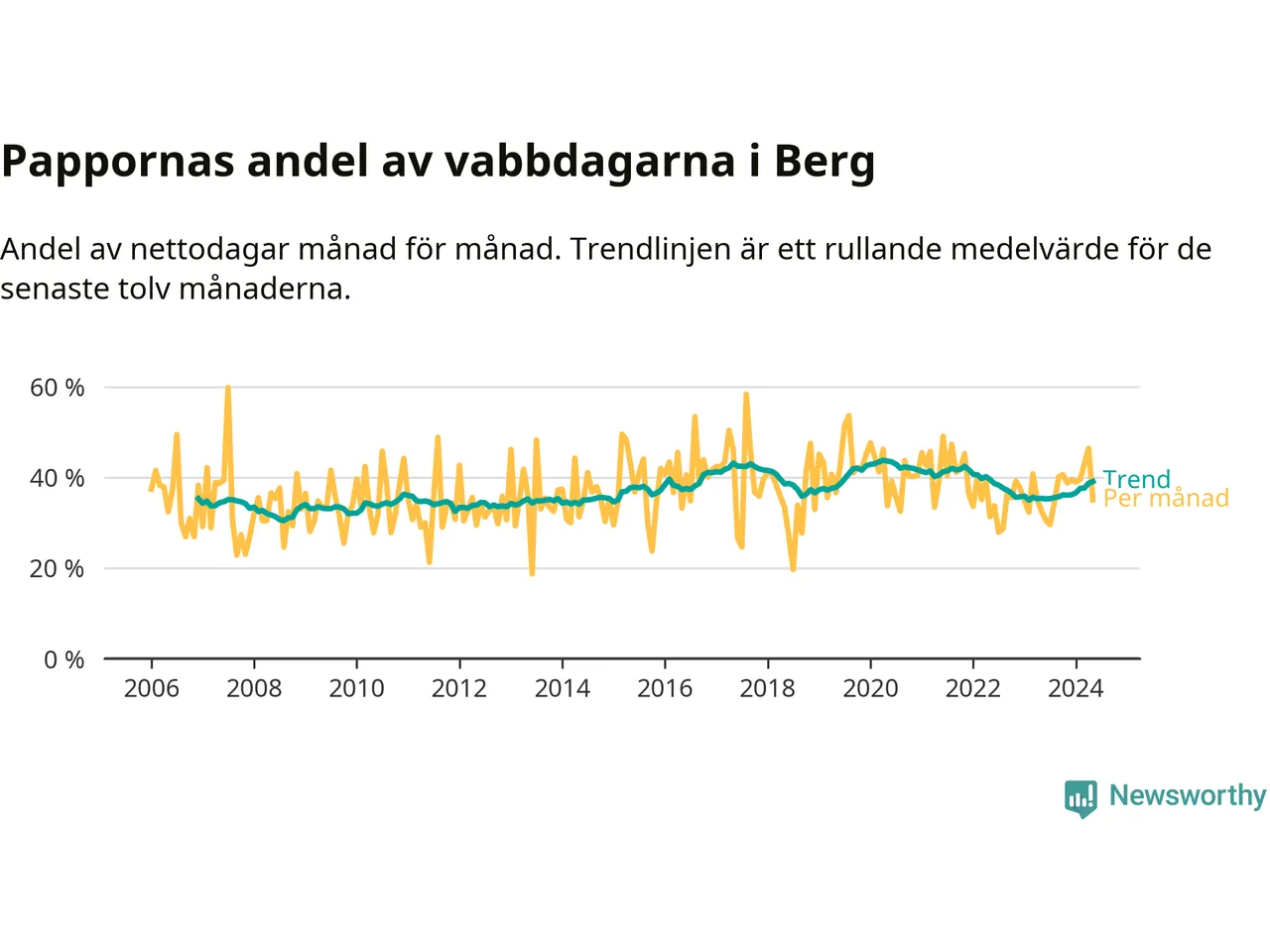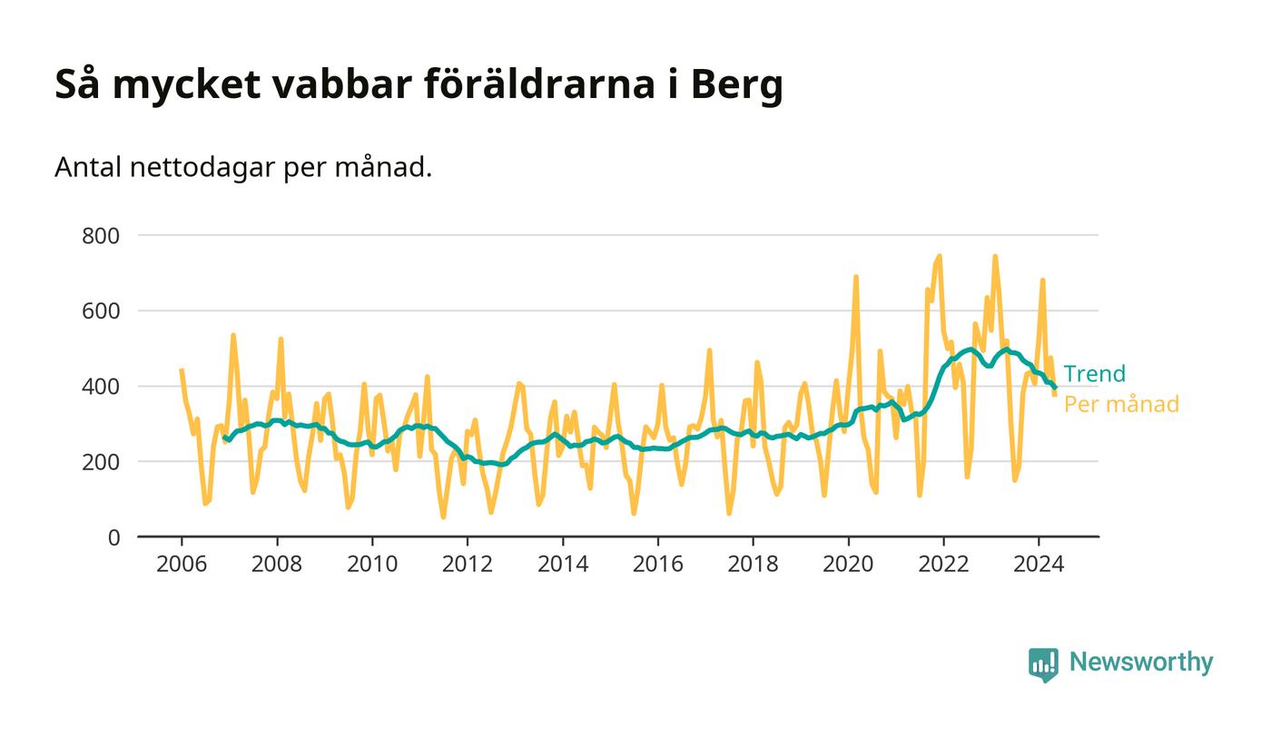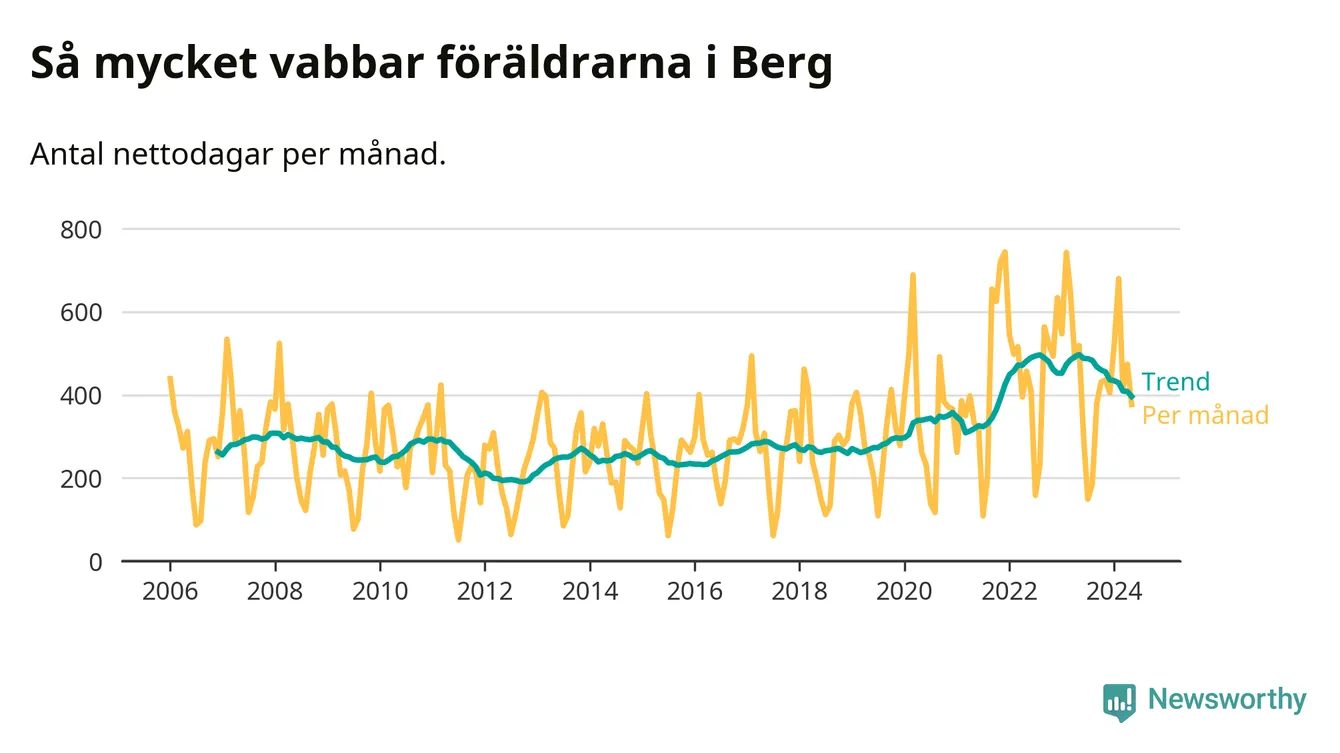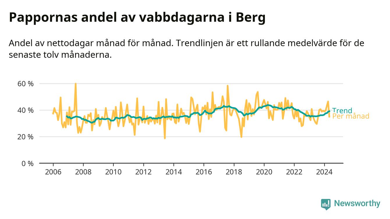 Berg ligger en bit från ett jämställt uttag. Under de senaste tolv månaderna har männen stått för 39 procent av all vabb i kommunen. Pappornas uttag peakade våren 2020 då kommunens fäder var uppe i 44 procent av vabbdagarna 1.