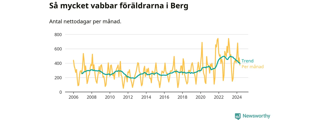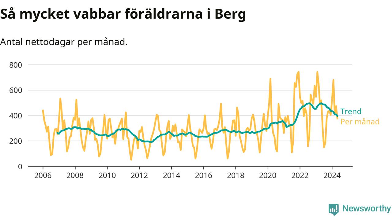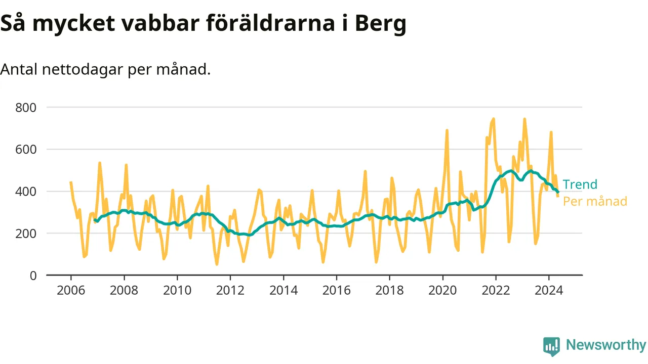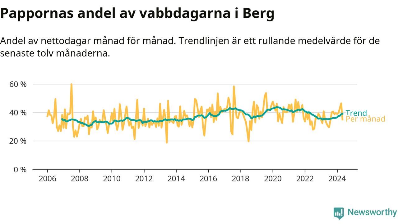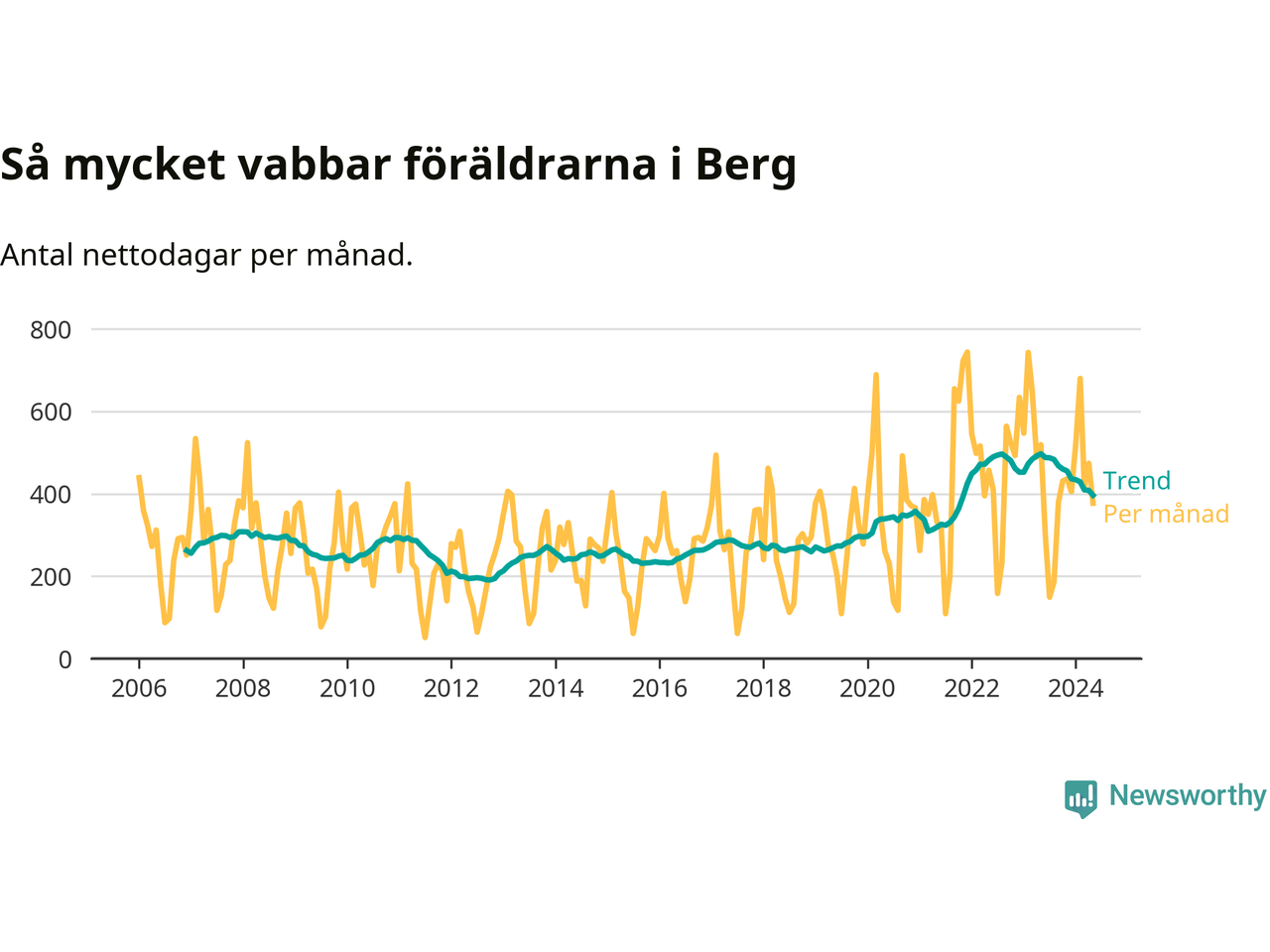 Berg ligger en bit från ett jämställt uttag. Under de senaste tolv månaderna har männen stått för 39 procent av all vabb i kommunen. Pappornas uttag peakade våren 2020 då kommunens fäder var uppe i 44 procent av vabbdagarna 1.