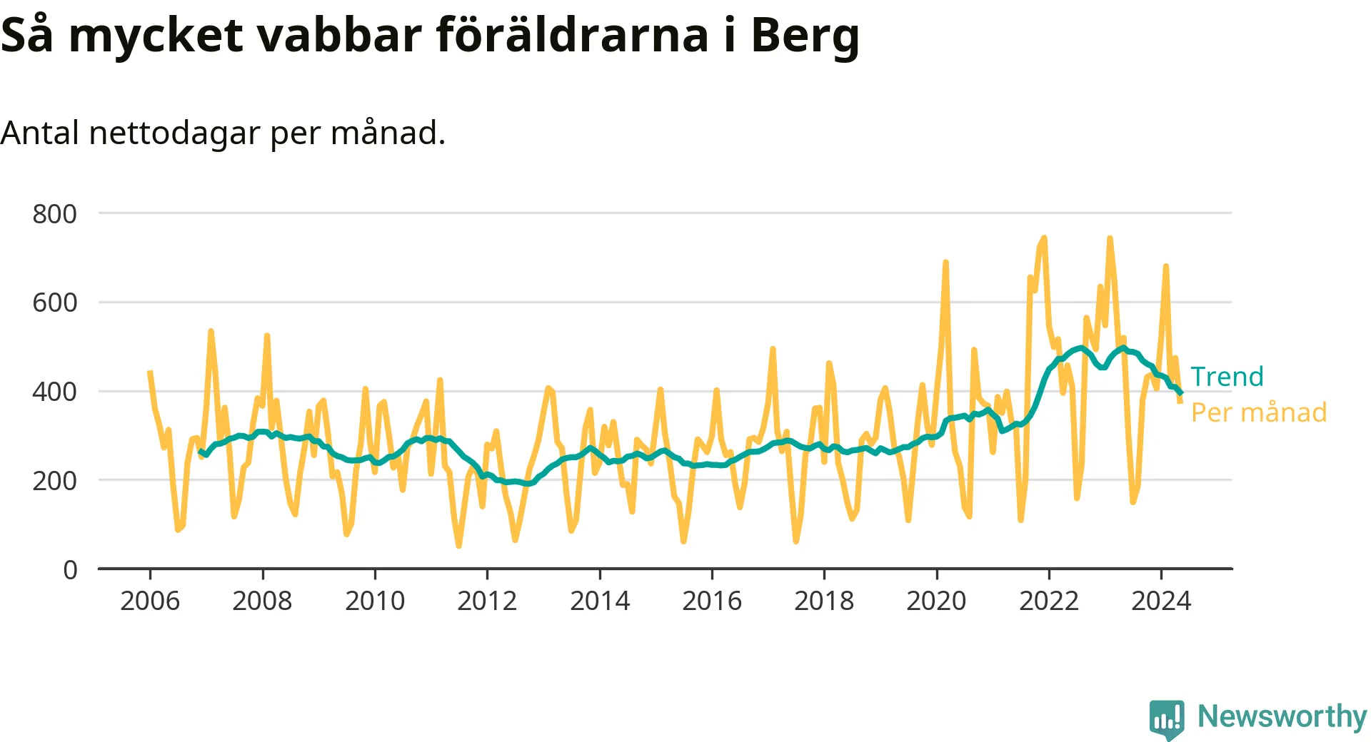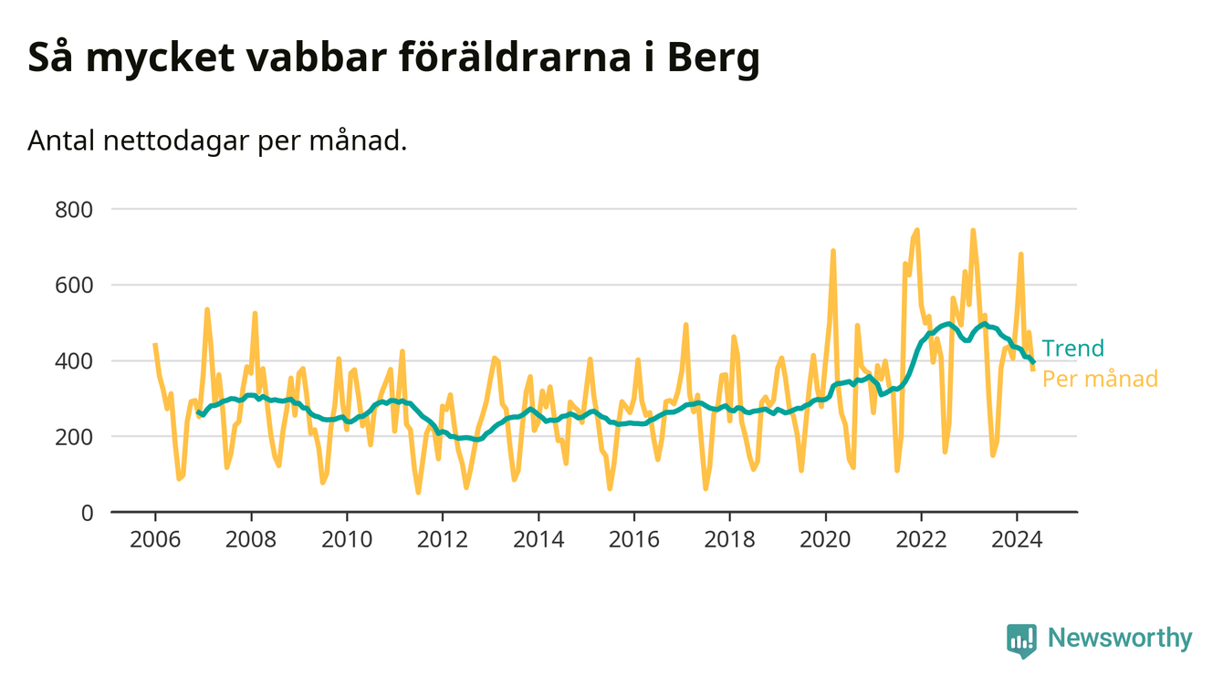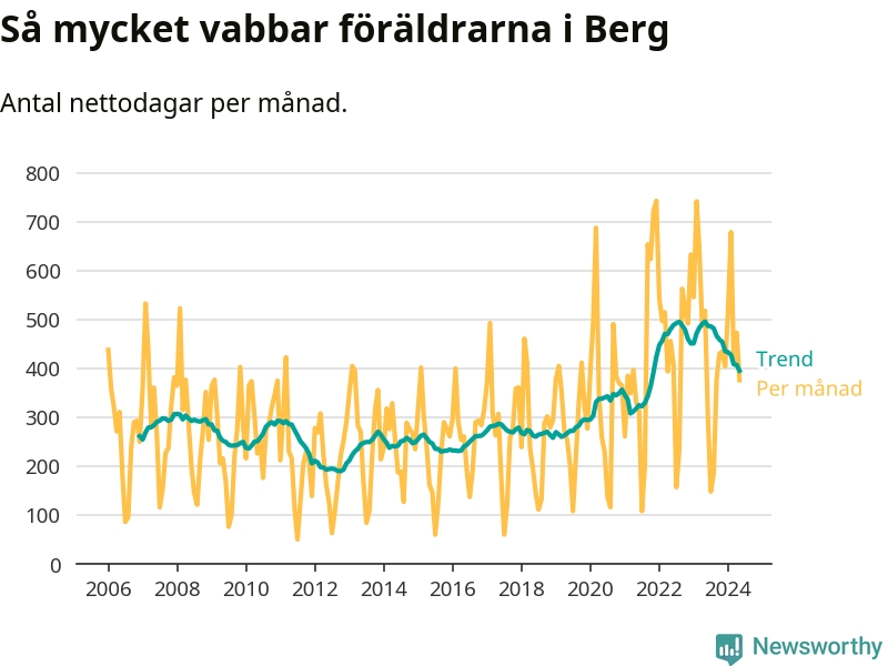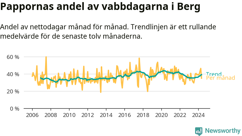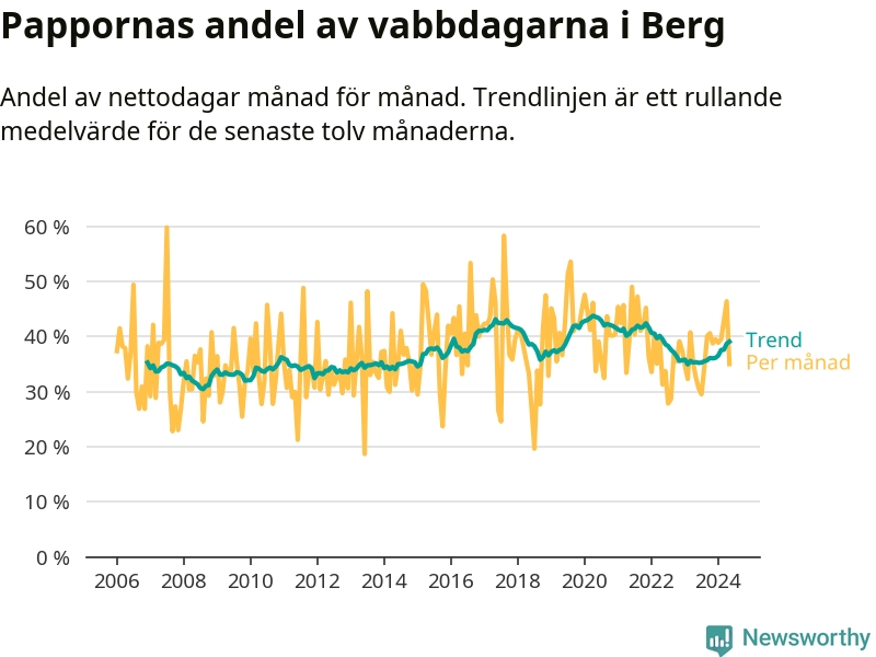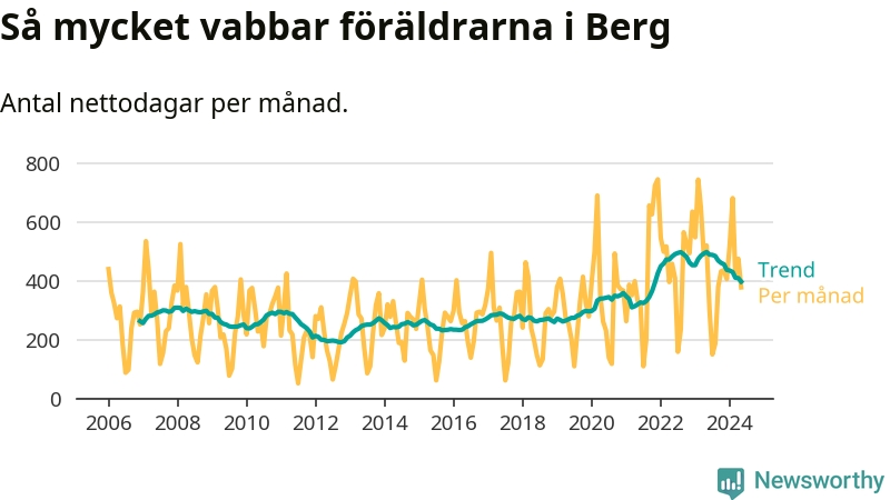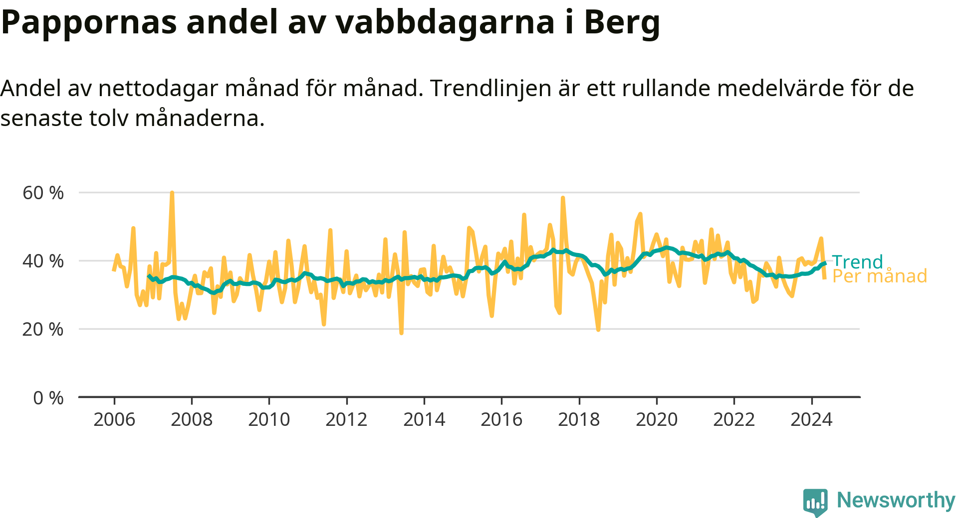 Berg ligger en bit från ett jämställt uttag. Under de senaste tolv månaderna har männen stått för 39 procent av all vabb i kommunen. Pappornas uttag peakade våren 2020 då kommunens fäder var uppe i 44 procent av vabbdagarna 1.