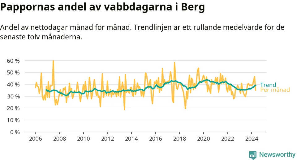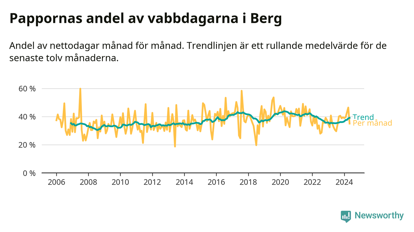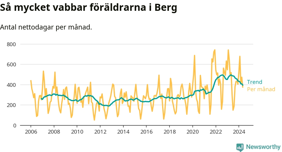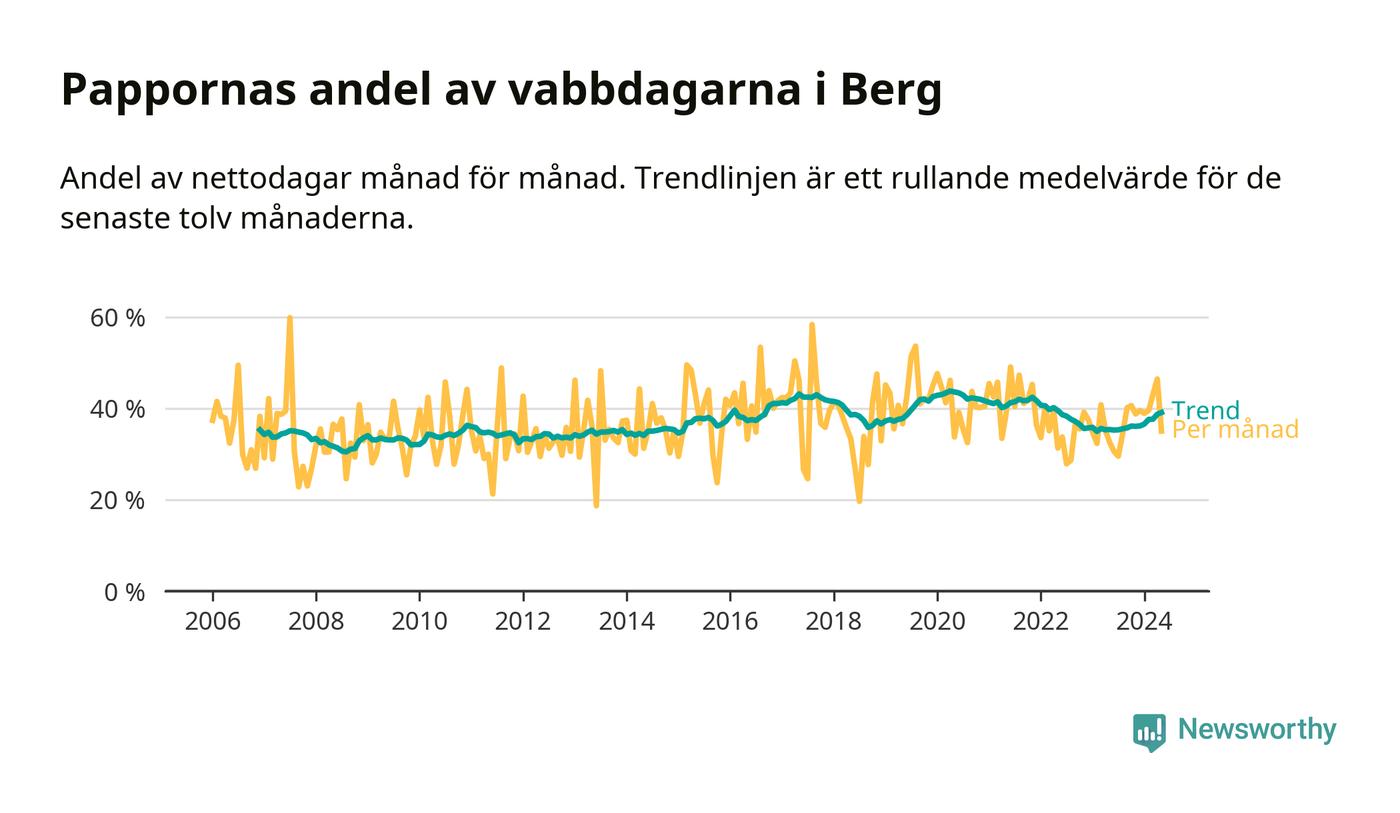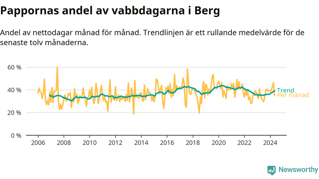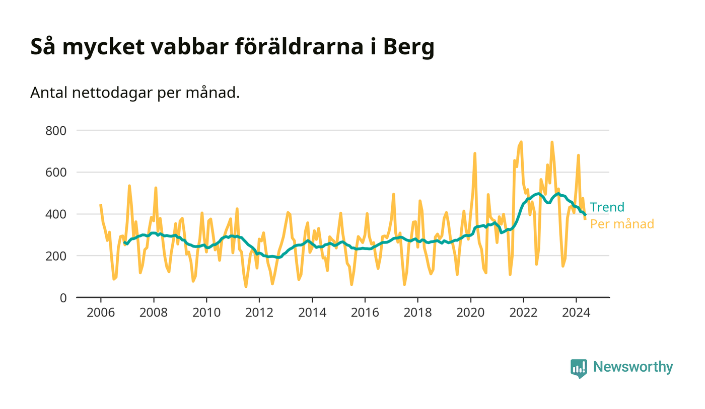 Berg ligger en bit från ett jämställt uttag. Under de senaste tolv månaderna har männen stått för 39 procent av all vabb i kommunen. Pappornas uttag peakade våren 2020 då kommunens fäder var uppe i 44 procent av vabbdagarna 1.
